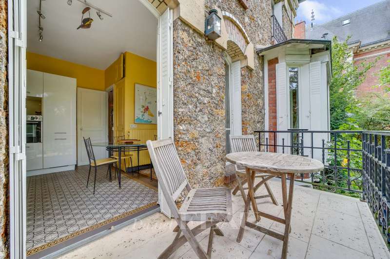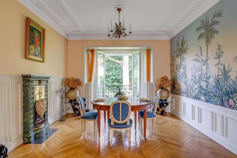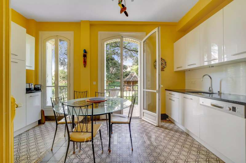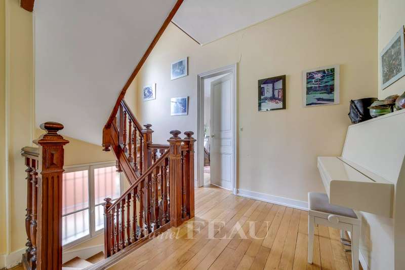 This well-maintained early 20th century brick and millstone-built property is set in a 545 sqm plot. Offering 320 sqm of floor space and about 250 sqm of living space, it includes an entry with fitted cupboards featuring cement mosaic floor tiles, a dual-aspect double living/reception room featuring a Prussian stove, oak parquet flooring and high ceilings, a drawing room or study, a fitted and equipped kitchen with dining facilities accessing a stone-decked terrace, and a guest wc. Period features also include sculpted iron radiators. The original staircase accesses a landing leading to master bedroom with a bathroom and wc, a bedroom with a balcony, a shower room, a single bedroom and a wc. The top floor comprises three bedrooms, a bathroom, a dressing room and a wc. Fitted storage space. Period features also include panelling, Benefiting from exterior access, the convertible entresol includes a storage room, a utility room, a boiler room and a wine cellar. The garden benefits from automatic sprinkling and features a gloriette under a centennial cedar, and a rockery. Parking space. 7 minutes by foot from the station and the schools, and 12 minutes from Place du Marché. Easy A86 and A13 motorway access.