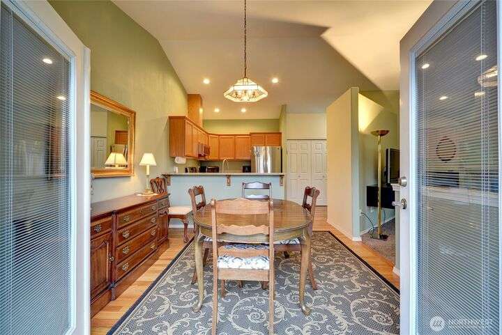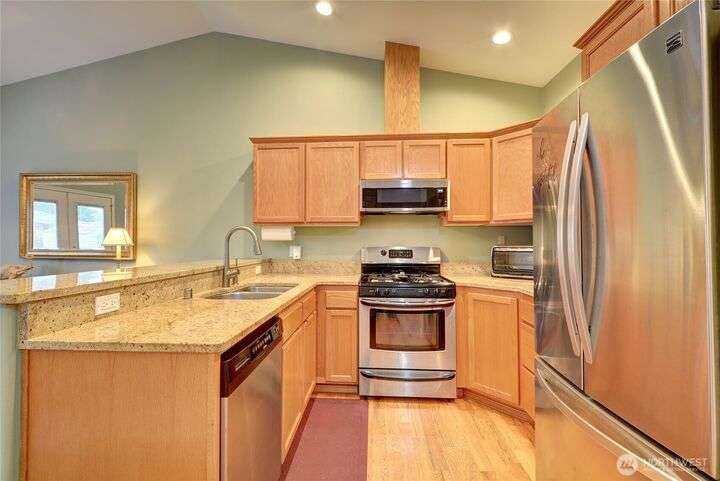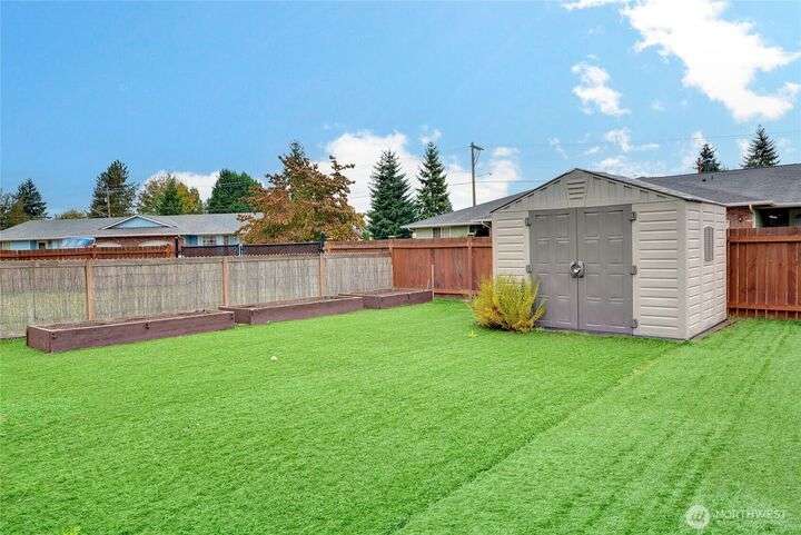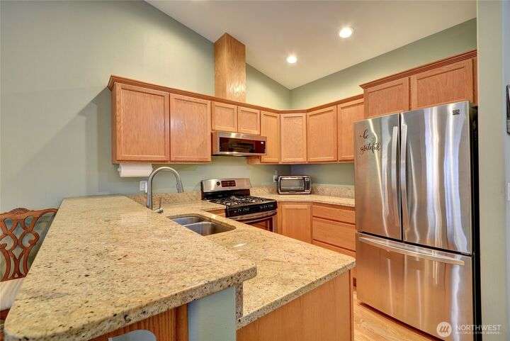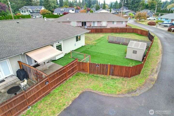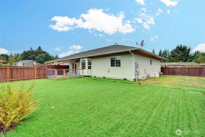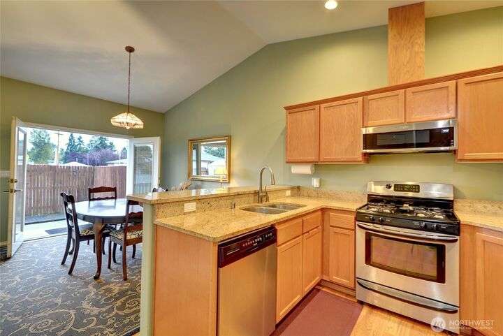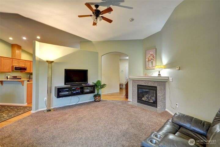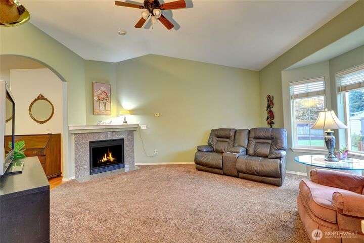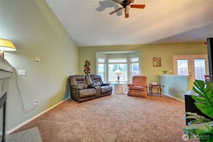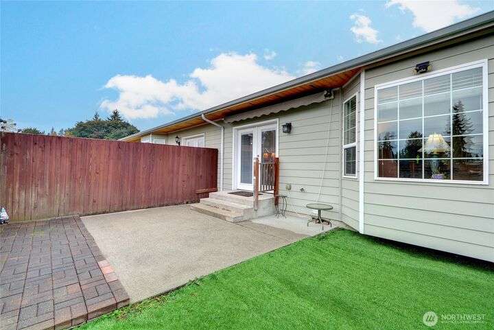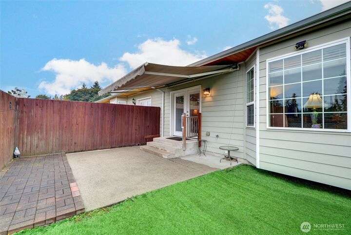 This beautifully maintained rambler-style condo offers an open floor plan with vaulted ceilings, a kitchen featuring granite countertops, stainless steel appliances, pantry, and eating bar. The kitchen flows into the dining and living areas with a cozy fireplace—perfect for cool evenings. The spacious primary bedroom includes a coved ceiling, double closets, and private ¾ bath. A second large bedroom and full bath provide extra space. Step through sliding doors to a private patio with retractable awning. The fully fenced yard, mostly turf, has room for RV parking or a garden oasis—ideal for entertaining and relaxing.