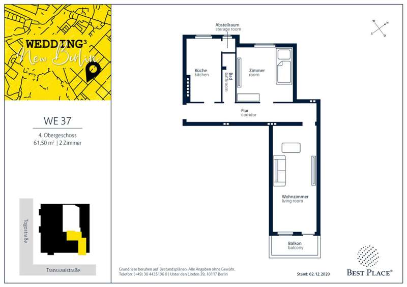 - Apartment - The rented 2-room apartment is located on the 4th floor of the front building and covers approx. 62 m². The apartment has a bedroom, a living room, a bathroom and a kitchen and can be reached via the staircase. Only suitable for investors! - Object - WEDDING³ is a beautiful old corner building in the Wedding district of West Berlin dating from 1911, consisting of 1- to 5-room apartments and 3 commercial units. The commission-free units are suitable for singles, couples and families and are located either in the front building or in the side wing. They have spacious living areas of approx. 38.44 to 129.00 m², floor plans typical of old buildings and room heights - perfect for investors! Your place to be in the heart of the up-and-coming trendy district of Wedding!