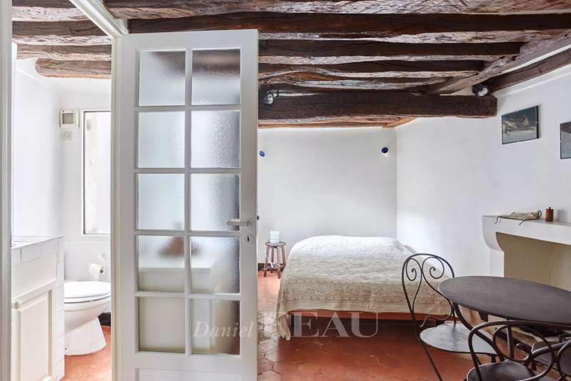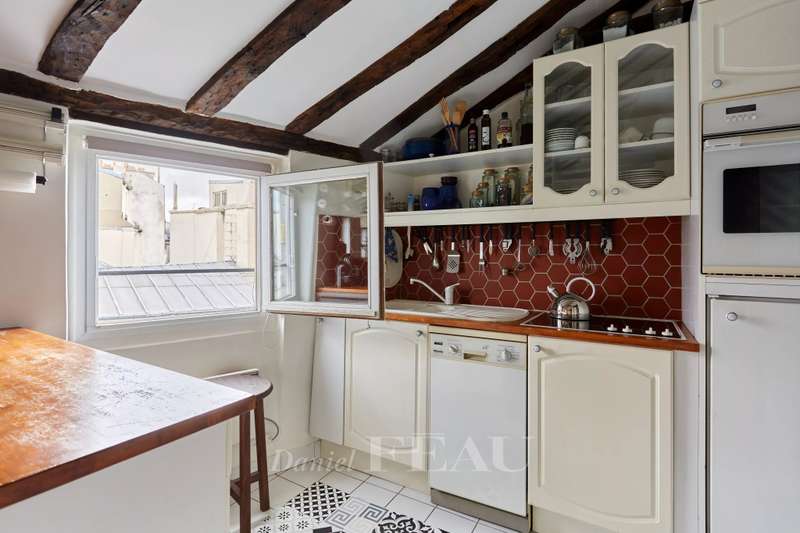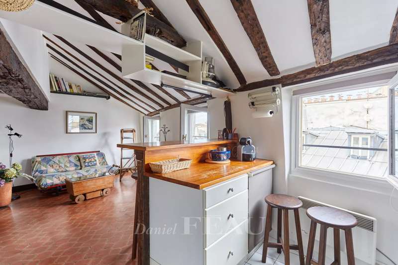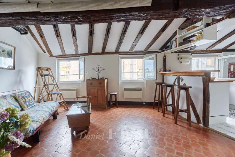 Rue Saint André des Arts. This 45 sqm two-room apartment oozing with period charm is on the 5th floor of a 17th century building. Featuring exposed beams, it comprises a living room with an open-plan kitchen, a bedroom overlooking a peaceful courtyard, and a shower room with a wc. Fitted storage space. The building is not equipped with a lift.