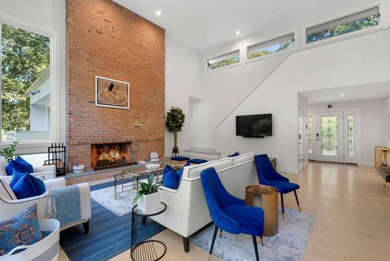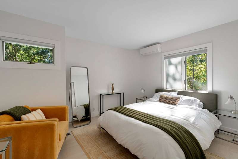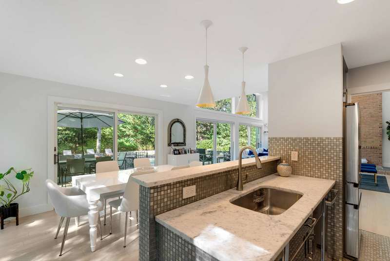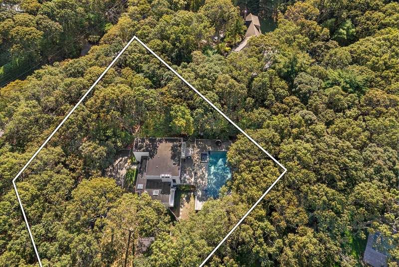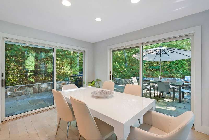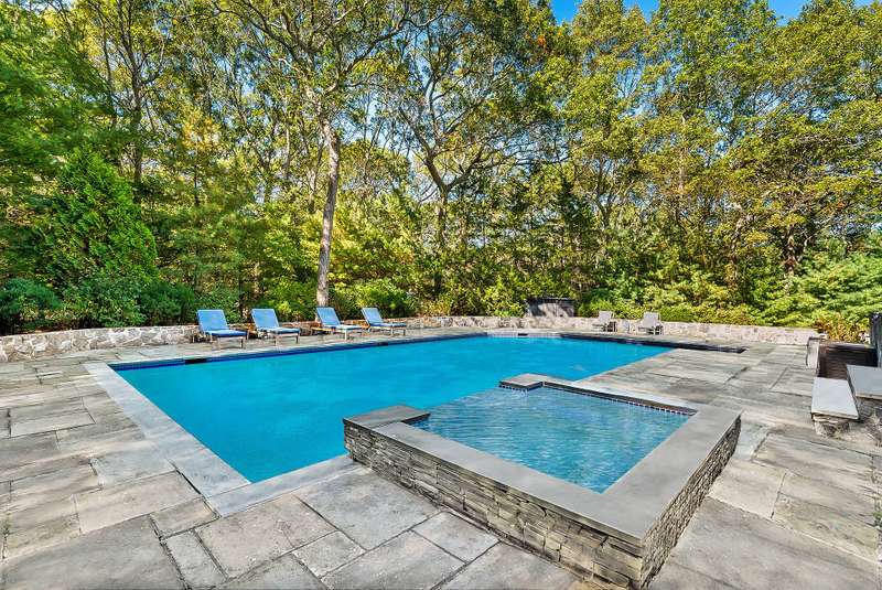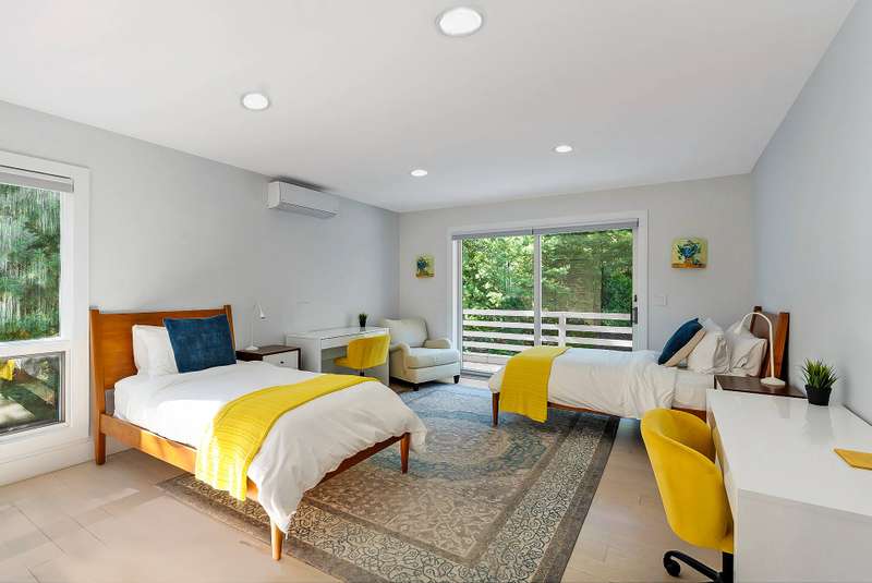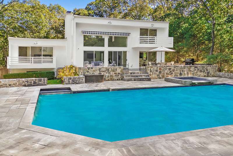 This gated modern contemporary residence, designed by renowned architect Myron Shulman, is a rare Hamptons offering that combines modern elegance with timeless sophistication. A sun-filled entryway opens to an expansive great room with soaring double-height ceilings and glass sliders, creating a seamless connection between indoor and outdoor living. Ideal for entertaining, the open layout flows effortlessly to the landscaped grounds and the 25' x 50' heated saltwater Gunite pool. The first-floor primary suite offers ample space with an ensuite bath and a private deck overlooking the lush, mature gardens. A versatile guest suite or office with a full bath also serves the main level. Upstairs, two well-appointed bedrooms-one with a private balcony-share a refined bathroom. The finished lower level provides additional living space and a private gym, completing this exceptional home. Located just moments from Sammy's Beach and several other private bay beaches, as well as East Hampton Village, this property encompasses the Hampton's lifestyle-private, tranquil, easily accessible to fun outdoor activities, high end village shopping, and fine dining.