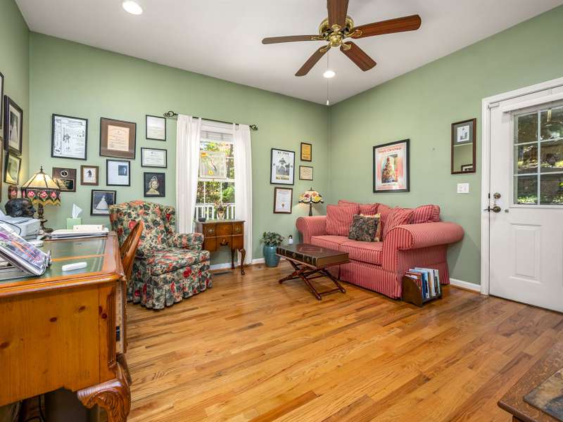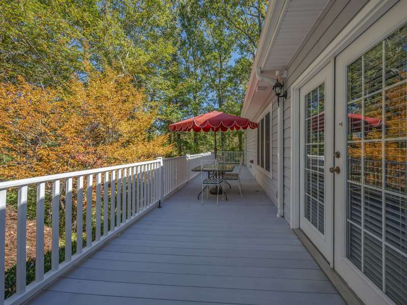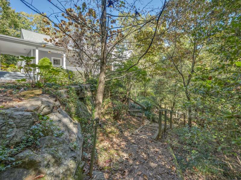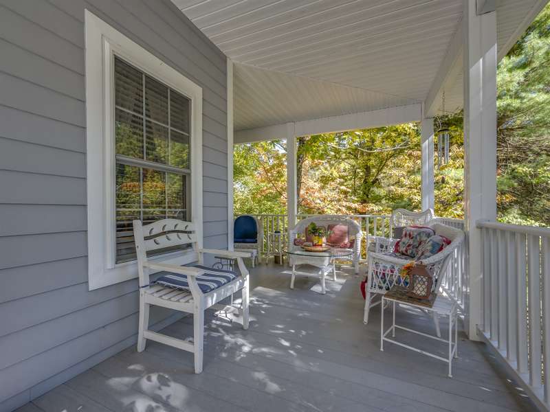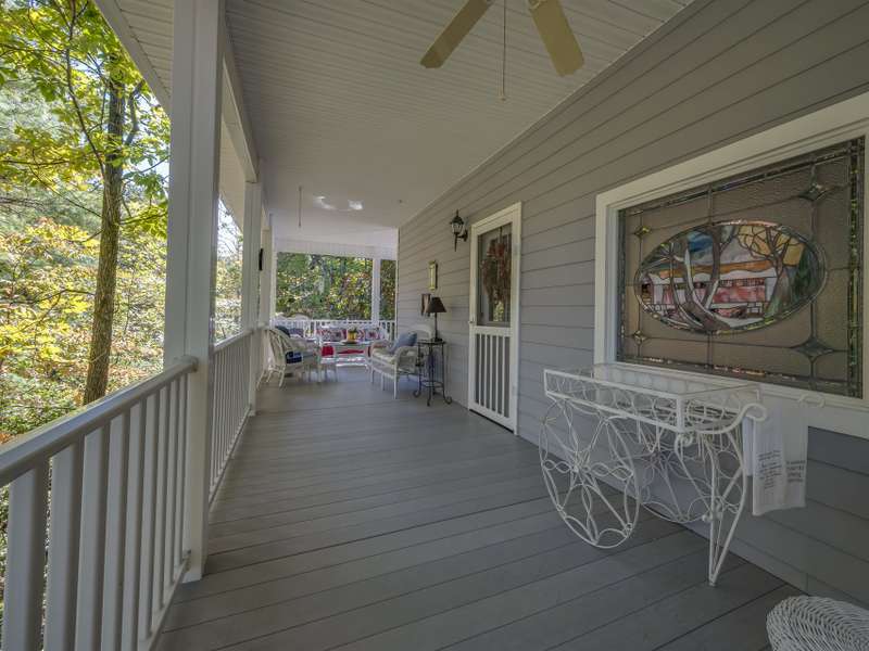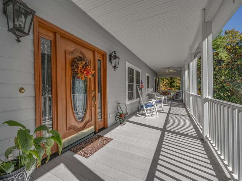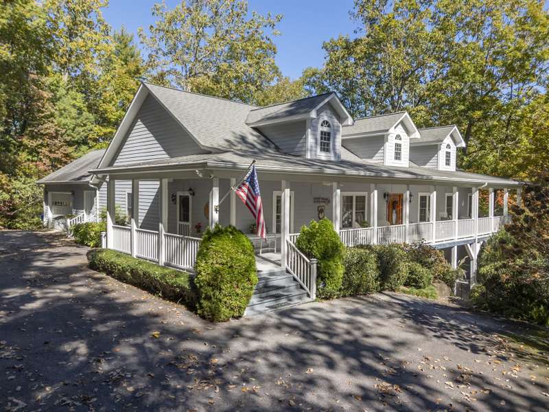 A Southern Lady with a Saluda Charm! Charming Southern-style home with wraparound porches on both levels, perfect for relaxing or entertaining. Step into a soaring foyer leading to a cozy sitting room, formal dining, powder room, and a well-appointed kitchen that opens to a great room with trey ceiling, fireplace, and rich oak floors. The main level features split bedrooms, baths, an office, and spacious laundry. The lower level offers a full in-law suite with 2 bedrooms, bath, kitchen, family room, eat-in area, private porch, and 1,050 sq ft of storage. Enjoy a 118 sq ft workshop off the driveway. Nestled on a beautifully landscaped, wooded lot with trails and large rock features, this private retreat is perfect for making lasting memories!