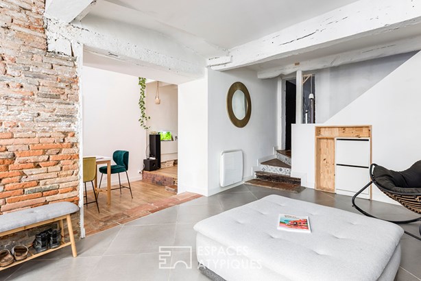The ground floor reveals a welcoming entrance room, leading to a vast open-plan living space. The terracotta floors, exposed white-painted beams, and the original brick wall create a warm yet contemporary atmosphere. The dining room connects to a modular living room bathed in natural light. The separate, fully equipped kitchen opens directly onto a private 6 sqm courtyard, ideal for summer meals or a touch of greenery in the city center. A mezzanine overlooks the living area and can accommodate an office or reading area. Two large, bright bedrooms upstairs, a shower room, and a separate toilet complete the layout. The top level offers a 70 sqm unfinished floor plan to renovate, giving free rein to the imagination to create a terrace with a view, a separate studio, or the addition of additional bedrooms. Outside, the small courtyard adds a pleasant breath of fresh air to this property in the heart of the city.
