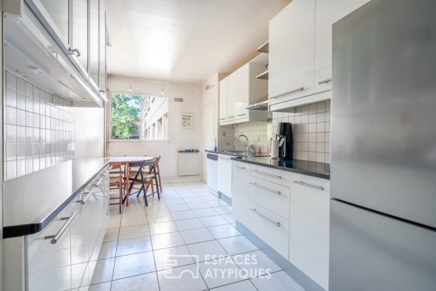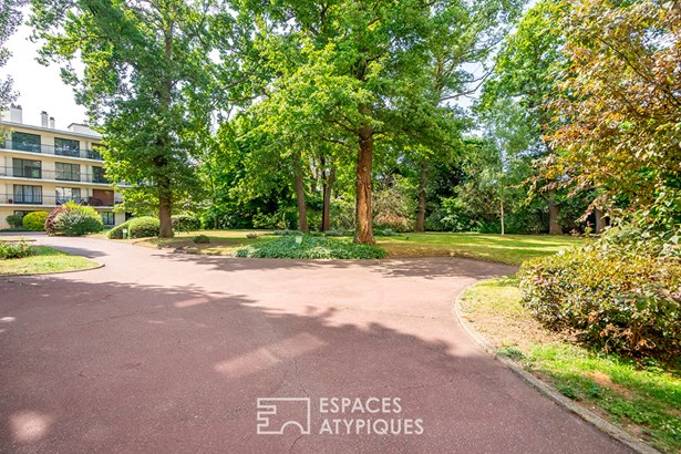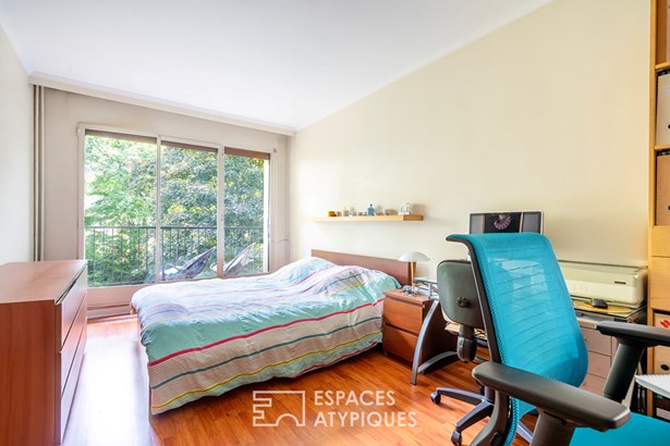 Outside, a northeast-facing balcony stretches across the entire garden-side facade, creating a true continuity with the living areas. Protected from any nuisance, it offers an unobstructed view of a wooded park, a true cocoon of greenery in the heart of the city. The calm and residential environment is distinguished by its proximity to transport and the banks of the Marne, accessible on foot.
