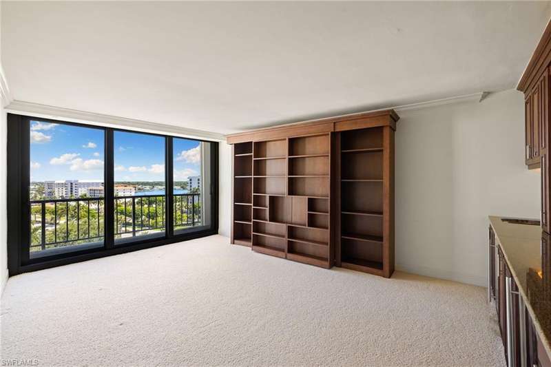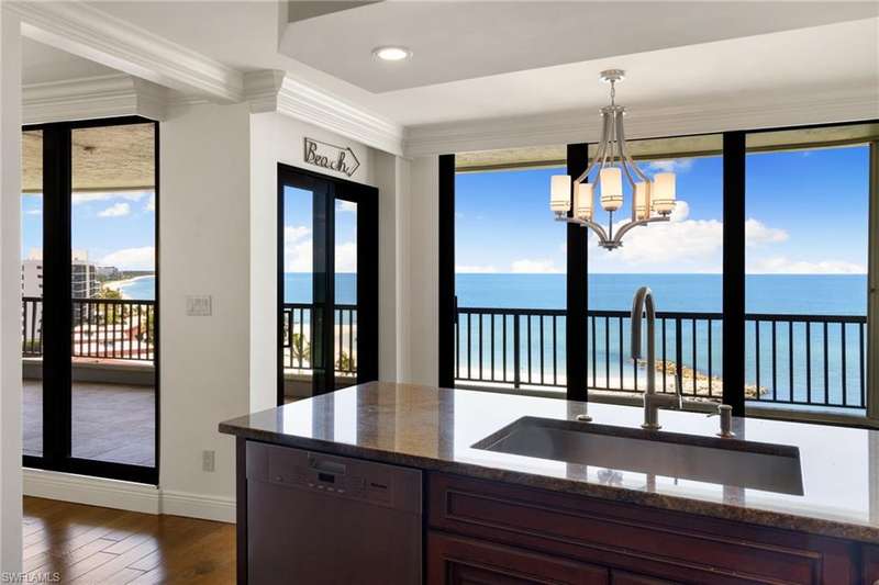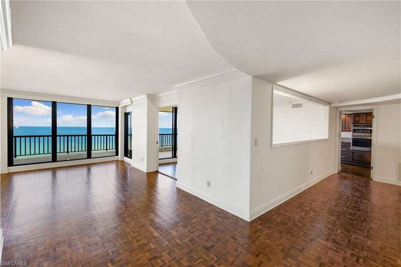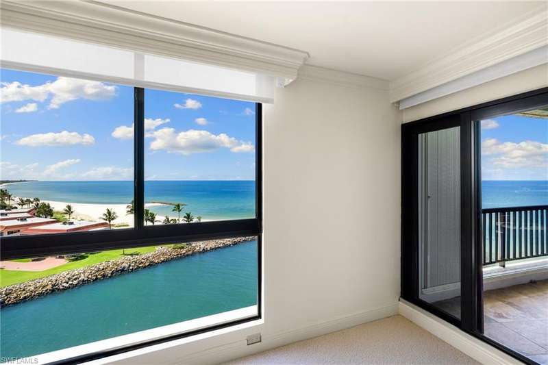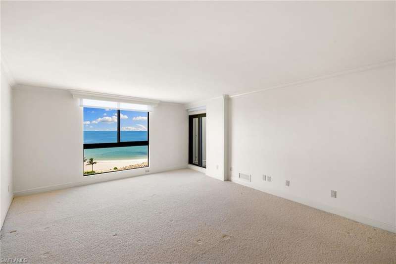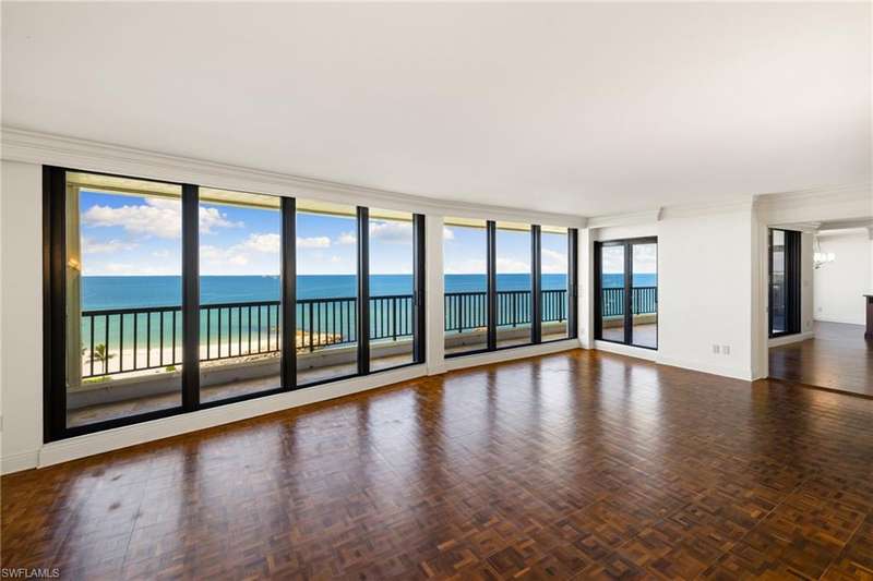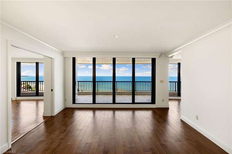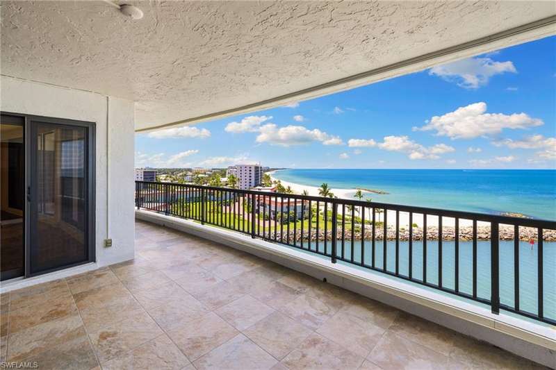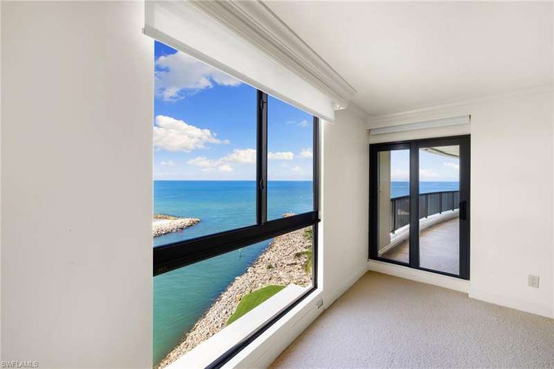 How s that lead off picture for a spot to have your morning coffee or tea to start your day! VIEWS! Rare, sweeping, direct and full southern coastline views from all living areas and master suite, massive direct unobstructed Gulf views, long City views up Gulfshore Boulevard, direct views of Doctor s Pass plus views to Moorings Bay from guest bedrooms and den. This residence is a beach-to-bay design so you have southern, western, eastern and northern views and exposures. SIZE! Nearly 3,000 square feet of air-conditioned living space (was originally a 4 bedroom and can very easily be that again). LOCATION! At the end of the cul-de-sac with gated entry situated on nearly 10 acres of lushly manicured grounds with 2 pools, one renovated clubhouse area, and in recent years newly constructed grand clubhouse with fantastic workout facilities, boat docks and kayak storage / launch (subject to availability) magnificent. Impact glass throughout for all windows and sliders plus extra storm prot
