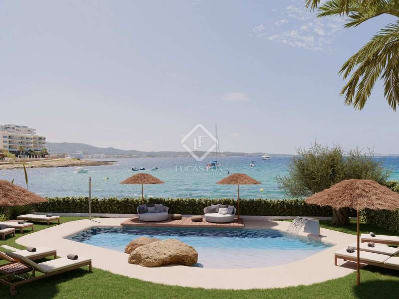 Ses Roques Baixes is an exclusive new development in a typical, Ibiza-style building on the west coast of the island, just 15 minutes from Ibiza City and 25 minutes from the airport. The development enjoys an ideal position, with the seafront promenade and turquoise waters right in front of the building. Located just a few steps from the beach, next to Cala Gració and Caló des Moro, with a large swimming pool in a communal garden, this is an idyllic place to enjoy the island of Ibiza and its pleasant year-round climate. This ground floor apartment is spacious, bright and open to the outside, allowing you to enjoy sea views with total privacy. It has an interior surface area of 84 m² and private outdoor space covering a further 81 m². Inside, we find a living room, dining room and kitchen with access to the terrace and garden and 2 bedrooms with 2 bathrooms on the other side of the home. As far as interior design is concerned, we find large tiled floors with a white stone finish that unites the interior and the terrace, natural wood, refined lines and large windows that make every space in the home feel natural and bright. The finishes and furnishings have been selected for their simplicity, elegance and warmth and the buyer has the opportunity to personalise their new home if they so wish. Low consumption lighting, home automation and an aerothermal energy system are just some of the modern features of these new homes. Optional equipment for outdoor areas is also available, such as: jacuzzi/pool on the terrace or rooftop solarium, outdoor kitchen on the rooftop solarium and/or a private pool. Furthermore, parking spaces and storage rooms are available from 27.000€. Please contact us for further information.