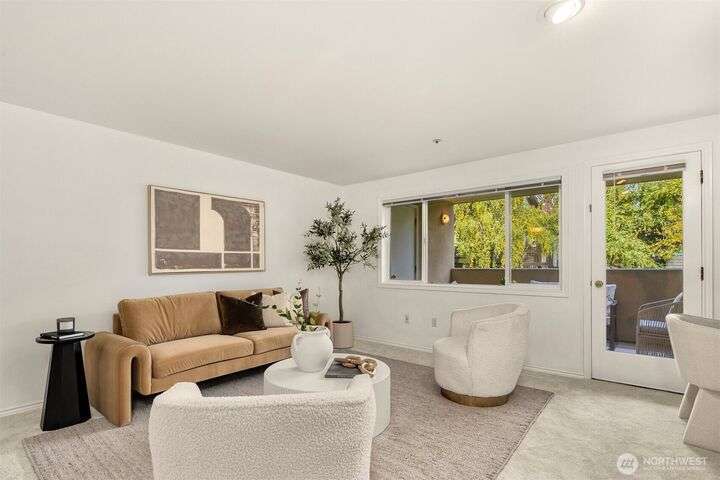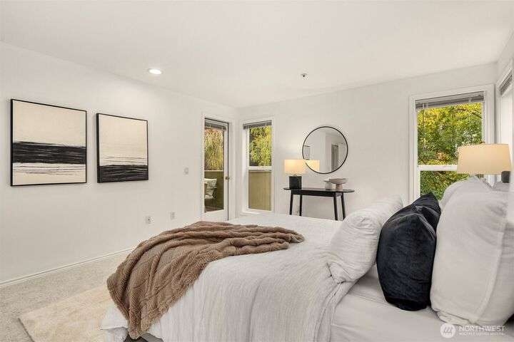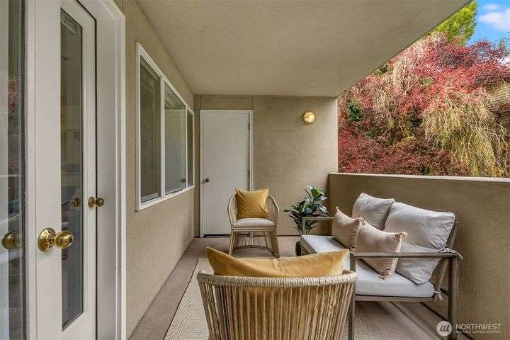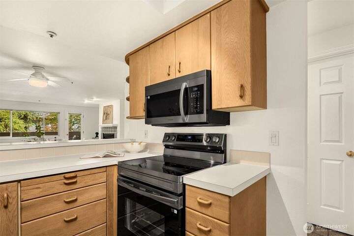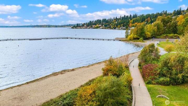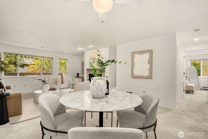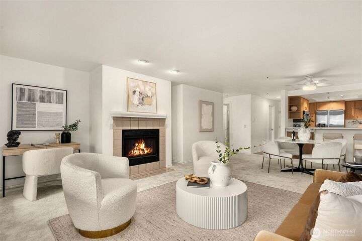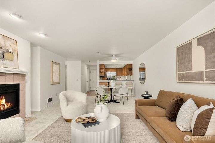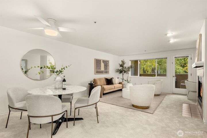 Lakeside living opposite Juanita Beach Park on Lake Washington’s shores! Bright 2 bed, 1.75 bath corner unit features a spacious great room design with cozy wood-burning fireplace flowing to a large covered balcony. Modern kitchen with new stainless steel appliances, ample storage, and breakfast bar. Primary suite with en-suite bath, generous closets, and private balcony access. In-unit laundry and storage. Fresh carpet and paint. Savor serene tree and creek views from your tranquil balcony. Stroll to swimming, fishing, tennis, or Friday Market’s fresh produce and unique crafts. Vibrant Juanita Village offers craft coffee, dining, shops and conveniences. Minutes to tech hubs and I-405. No rental cap. Move-in ready, welcome home!