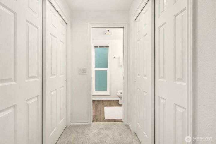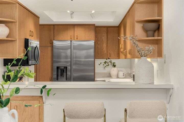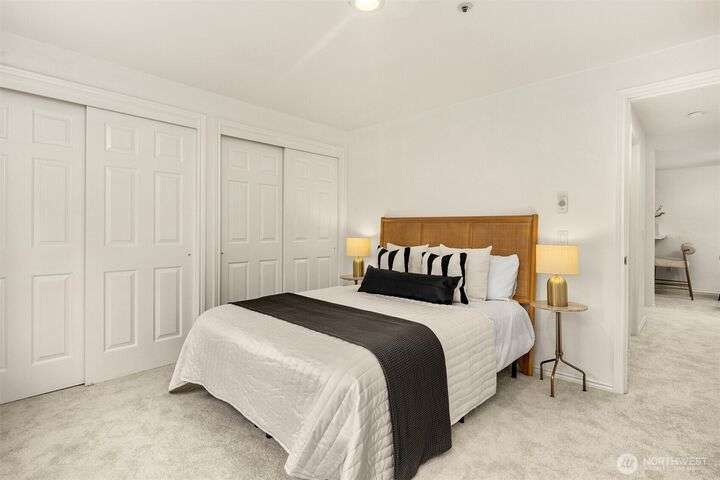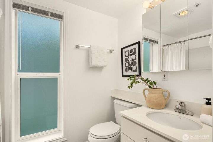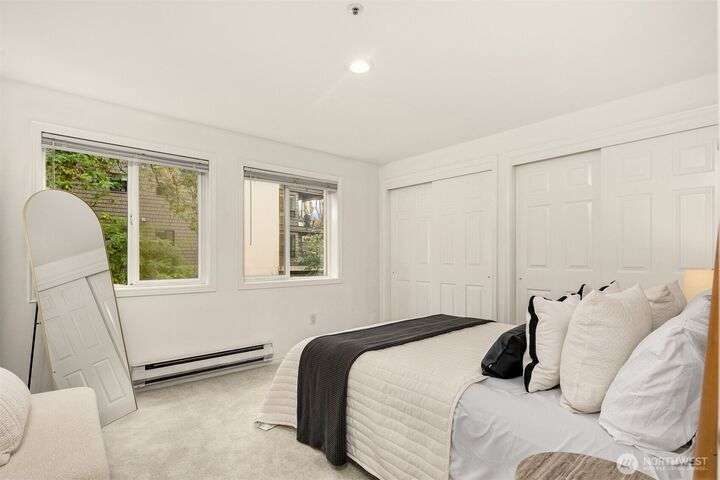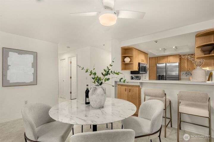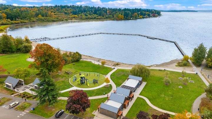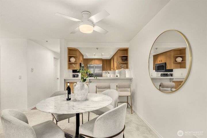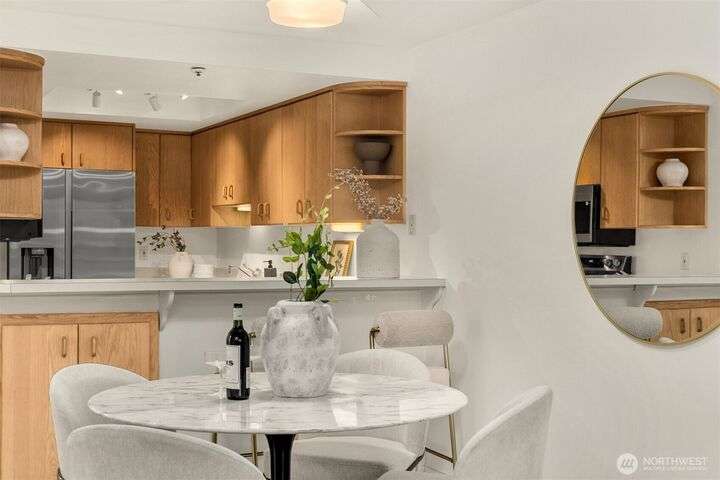 Lakeside living opposite Juanita Beach Park on Lake Washington’s shores! Bright 2 bed, 1.75 bath corner unit features a spacious great room design with cozy wood-burning fireplace flowing to a large covered balcony. Modern kitchen with new stainless steel appliances, ample storage, and breakfast bar. Primary suite with en-suite bath, generous closets, and private balcony access. In-unit laundry and storage. Fresh carpet and paint. Savor serene tree and creek views from your tranquil balcony. Stroll to swimming, fishing, tennis, or Friday Market’s fresh produce and unique crafts. Vibrant Juanita Village offers craft coffee, dining, shops and conveniences. Minutes to tech hubs and I-405. No rental cap. Move-in ready, welcome home!
