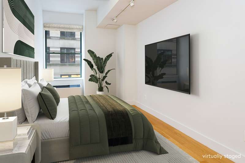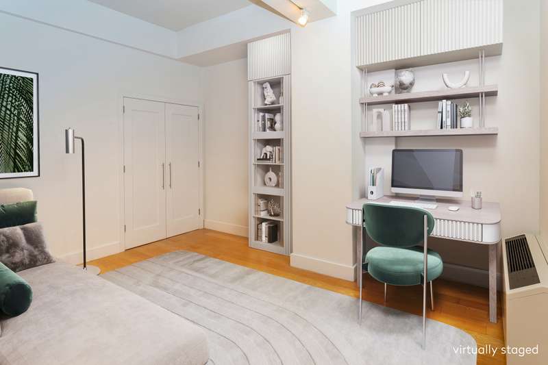 Now available at the iconic 99 John Street Deco Lofts Condominium a large versatile 1,026 Sqft 1BR-2BA with a large home office/2nd bedroom. The unit features 11 ft beamed ceilings, beautiful wide slat wood floors, a beautiful renovated kitchen with Caesar Stone countertops, Electrolux S/S appliances and an open breakfast bar. The bathroom is finished with Calcutta Marble tiled floors, counter tops, and back splash, offering a chic, clean back drop. There is ample closet space half outfitted with rods and shelving so organization is never an issue. Realizing the importance of space in New York City living; the layout is used to the utmost. 99 John Street is an amazing full service art deco condo offering a whole host of amenities while maintaining very low common charges. Amenities include a 24-hour doorman, luxury fitness room, children's playroom, residents' lounge, large outdoor Zen garden with grills, wrap-around roof deck with cabanas, valet service, separate indoor bike storage, and garage parking for an additional fee. 99 John is a block from the entrance to the Fulton Center complex (1/2/3, A/C, 4/5, N/R, J/Z, and PATH trains) and one minute from three large supermarkets including one within the building and a Whole Foods opening on Wall Street this year.