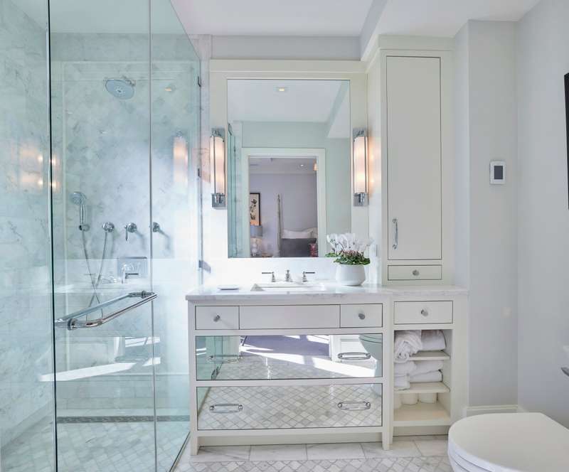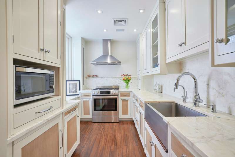 An inviting hallway leads past the stylish breakfast bar to the bedroom wing of this thoughtfully designed apartment. The private, generously proportioned primary suite easily accommodates a king-size bed and features a sleek Hearth Cabinet bio-gas fireplace. A large, luxurious en-suite windowed bathroom with polished Carrara and Thassos mosaic tiles, a China white sink countertop, Grohe fixtures and a custom glass enclosed shower with handheld and ceiling showerhead as well as a seat compliments the primary suite. This room also boasts a vast walk-in closet/dressing room with a Miele washer and dryer.