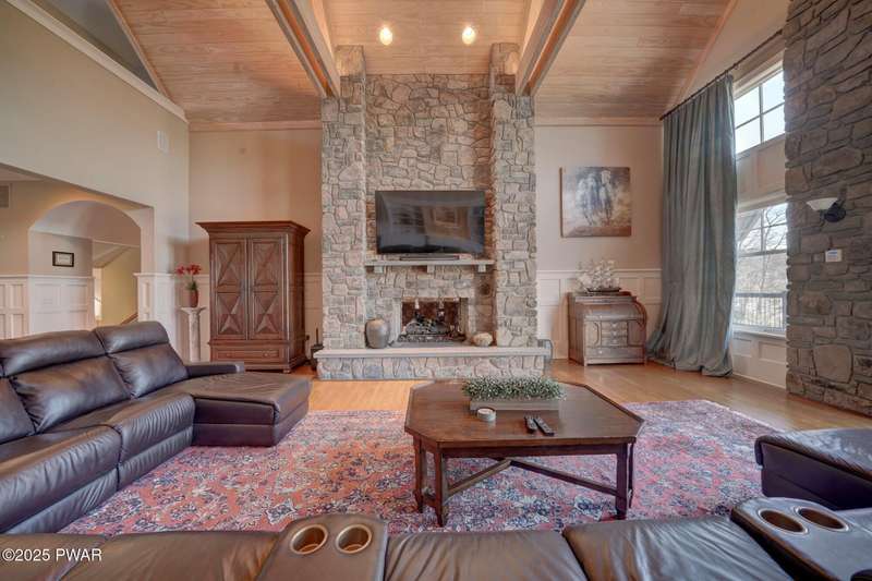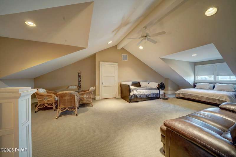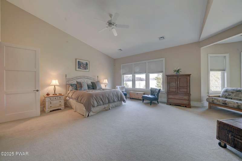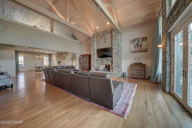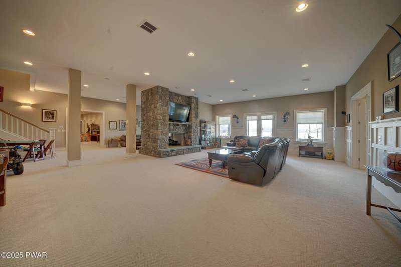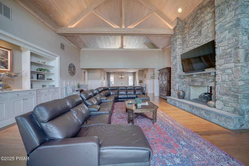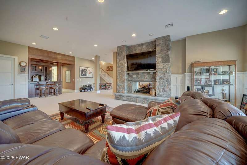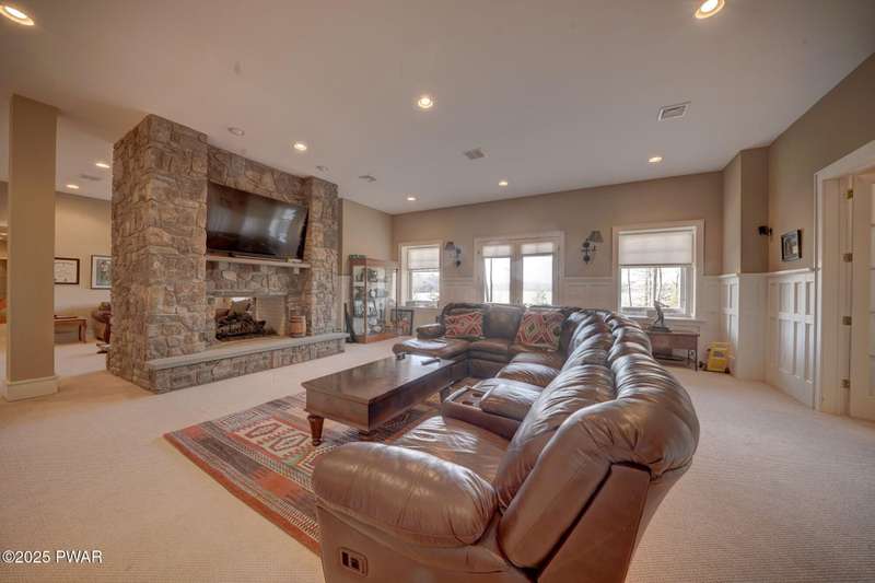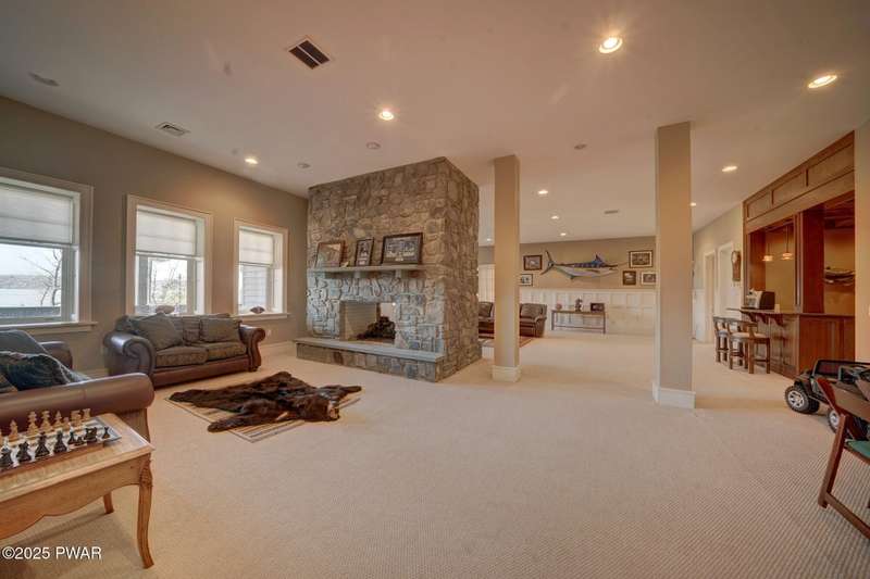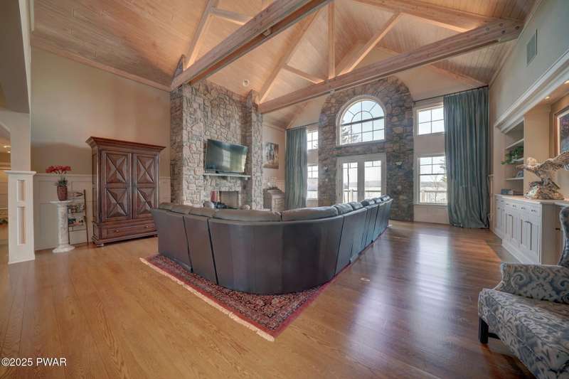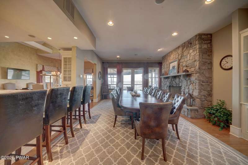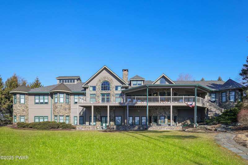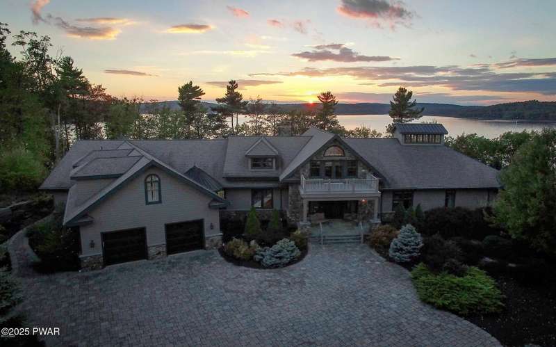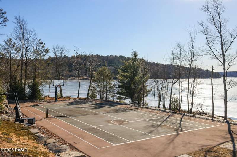 Nestled at the point in the exclusive Whispering Pines community, this remarkable home stands unparalleled on Lake Wallenpaupack. A gated entrance offers the ultimate in seclusion & privacy, creating the perfect retreat for your lakeside escape. The property spans 2.36 acres, boasting over 850' of pristine frontage on Pennsylvania's largest man-made lake. The soaring ceilings, built-in features, and a stunning floor-to-ceiling stone fireplace in the main living room will leave you in awe. The gourmet kitchen, located just down the hall, overlooks a spacious dining area & is outfitted w/ top-of-the-line stainless steel appliances, a large granite island, hardwood floors, & more. A nearby sitting room w/ its own stone fireplace provides a cozy space for entertainment. Both the living room, sitting room, & dining room open to a partially covered deck. The main level also includes a half bath and a study, providing the ideal start to the expansive master suite.The entire right wing of the 1st floor is dedicated to the luxurious master suite, featuring a spa-like bath w/ a Jacuzzi tub, walk-in shower, double sinks, & a large WIC. The spacious bedroom includes a sitting area & offers breathtaking views of Lake Wallenpaupack, which can be seen from nearly every room in the home.The left wing of the home is home to four add'l bdrm suites, each w/ its own private bath. Above the garage, you'll find a private suite, while the lower level features 2 more bdrm suites. There certainly is plenty of sleeping space in this home! The fully finished, walkout lower level is designed for fun & relaxation, offering multiple sitting areas, a double-sided stone fireplace, cigar room & a fully equipped game room. There's ample storage space and a charming wet bar, making it an ideal space for family & friends.Part of what makes this property unique is a lakeside basketball/tennis court!! Enjoy a game only a few feet from Lake Wallenpaupack!