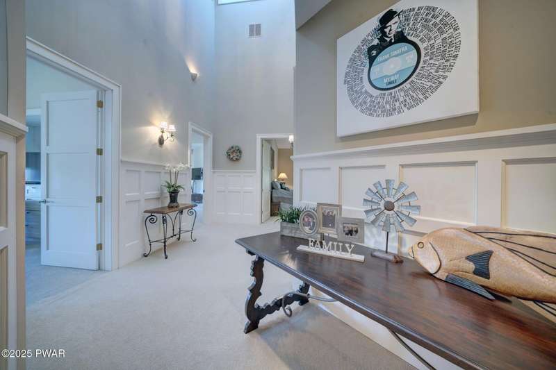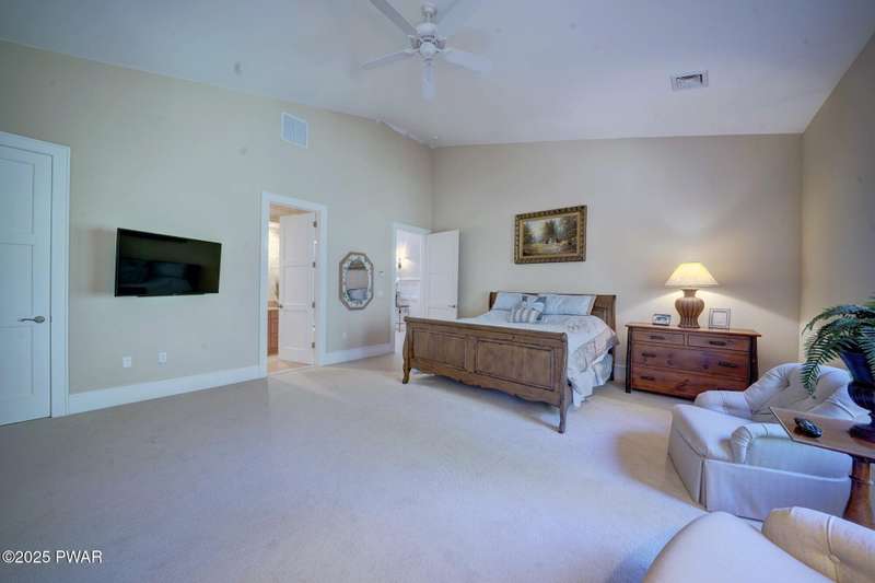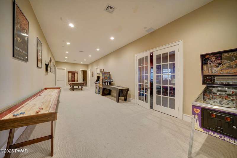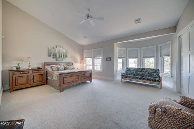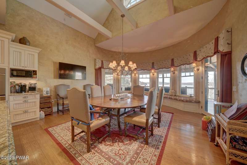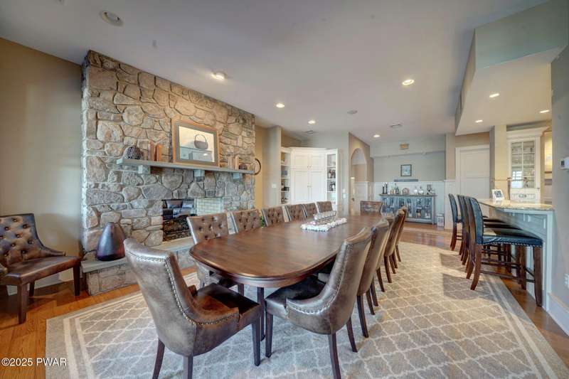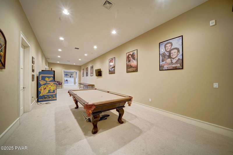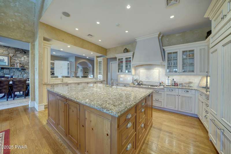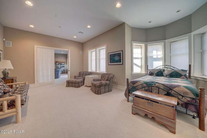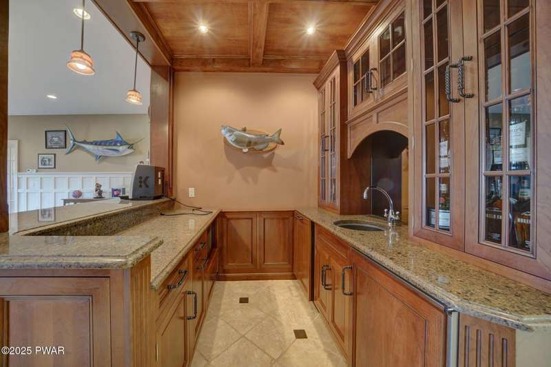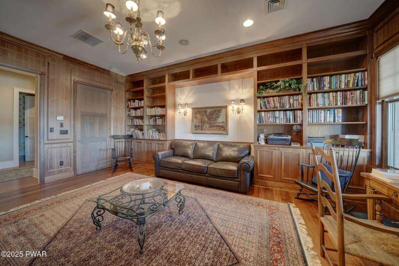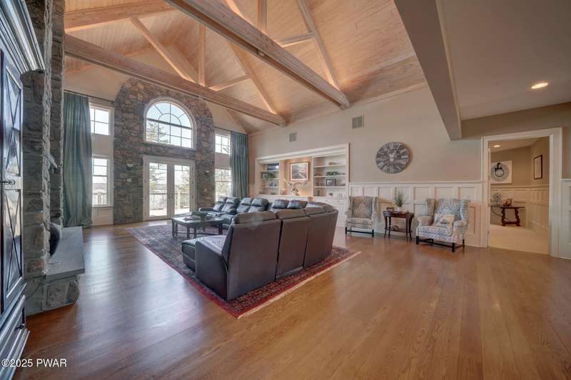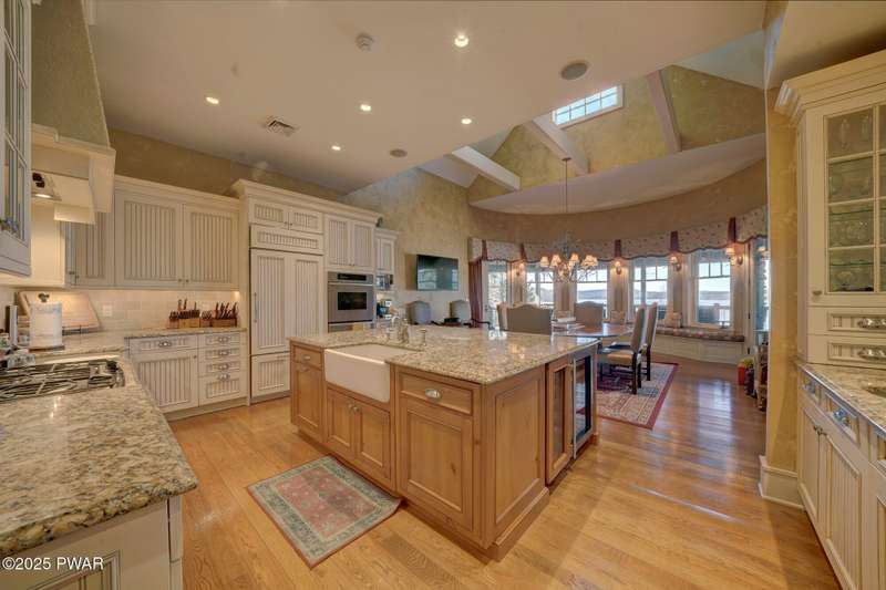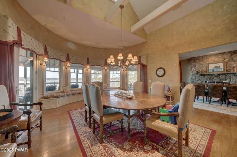 Nestled at the point in the exclusive Whispering Pines community, this remarkable home stands unparalleled on Lake Wallenpaupack. A gated entrance offers the ultimate in seclusion & privacy, creating the perfect retreat for your lakeside escape. The property spans 2.36 acres, boasting over 850' of pristine frontage on Pennsylvania's largest man-made lake. The soaring ceilings, built-in features, and a stunning floor-to-ceiling stone fireplace in the main living room will leave you in awe. The gourmet kitchen, located just down the hall, overlooks a spacious dining area & is outfitted w/ top-of-the-line stainless steel appliances, a large granite island, hardwood floors, & more. A nearby sitting room w/ its own stone fireplace provides a cozy space for entertainment. Both the living room, sitting room, & dining room open to a partially covered deck. The main level also includes a half bath and a study, providing the ideal start to the expansive master suite.The entire right wing of the 1st floor is dedicated to the luxurious master suite, featuring a spa-like bath w/ a Jacuzzi tub, walk-in shower, double sinks, & a large WIC. The spacious bedroom includes a sitting area & offers breathtaking views of Lake Wallenpaupack, which can be seen from nearly every room in the home.The left wing of the home is home to four add'l bdrm suites, each w/ its own private bath. Above the garage, you'll find a private suite, while the lower level features 2 more bdrm suites. There certainly is plenty of sleeping space in this home! The fully finished, walkout lower level is designed for fun & relaxation, offering multiple sitting areas, a double-sided stone fireplace, cigar room & a fully equipped game room. There's ample storage space and a charming wet bar, making it an ideal space for family & friends.Part of what makes this property unique is a lakeside basketball/tennis court!! Enjoy a game only a few feet from Lake Wallenpaupack!