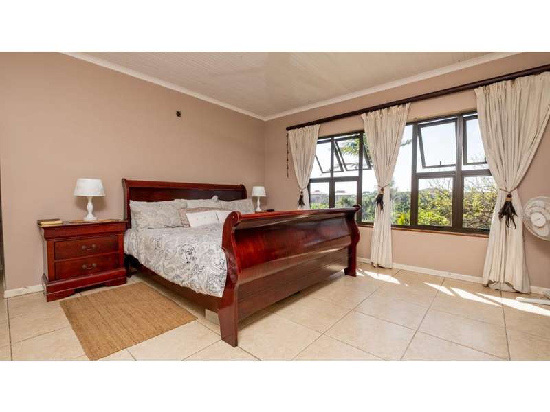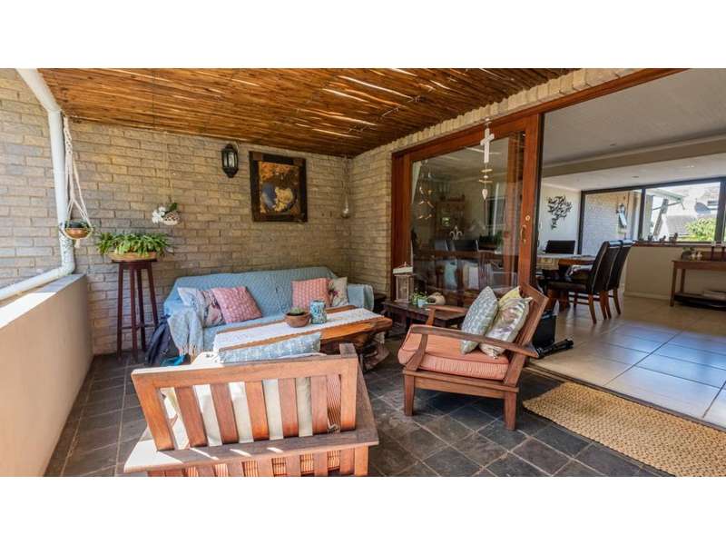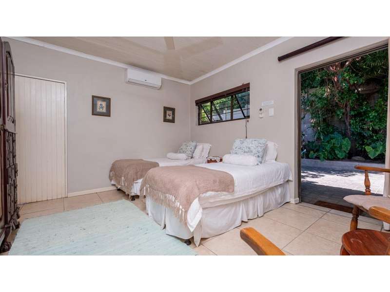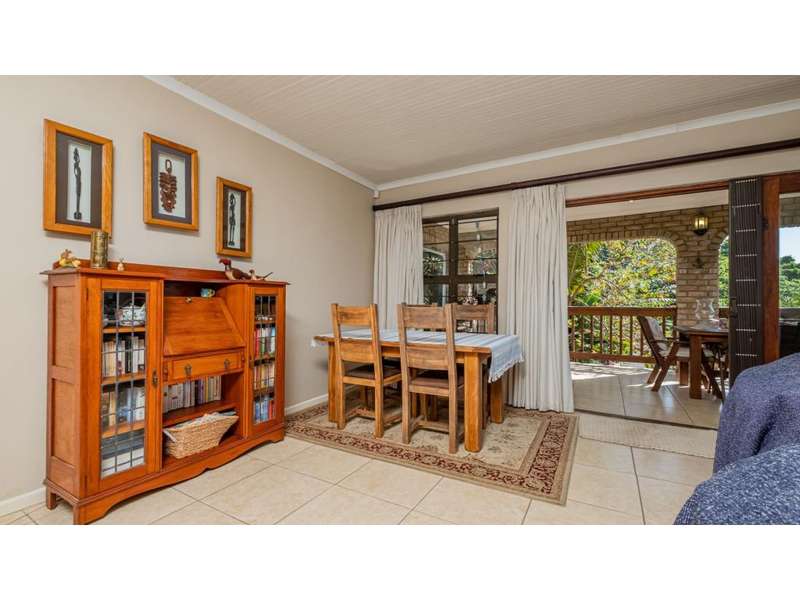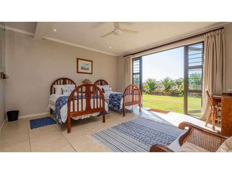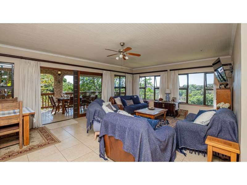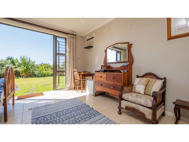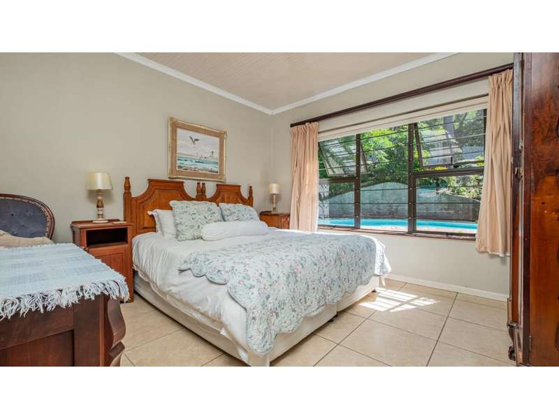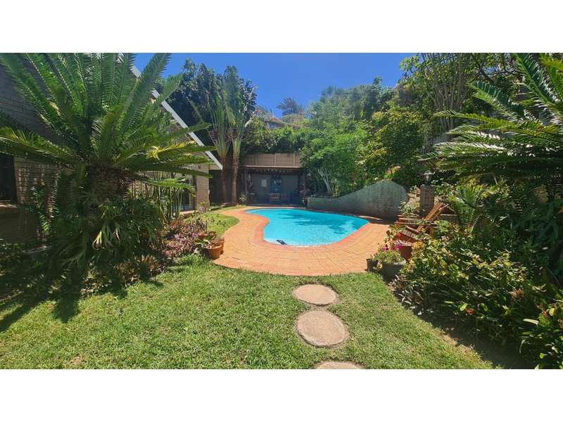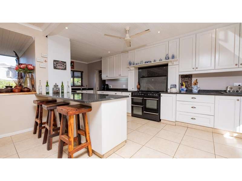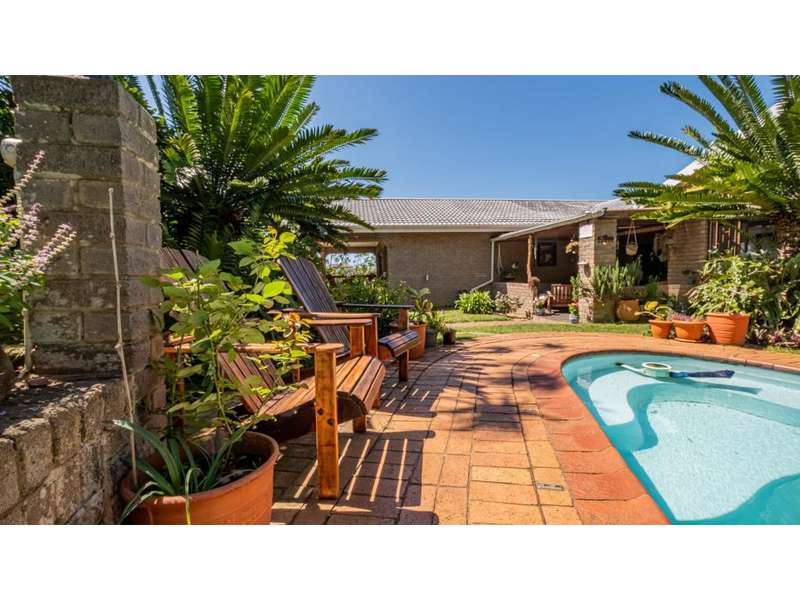 A wonderful, inviting home, previously operated as a popular B&B. This expansive home is perfect for the large or extended family and offers 6 generous bedrooms, 4 of which are en-suite. The main house occupies the upper level of this home and is accessed via a pathway leading through the beautiful gardens. Enter into the grand, open-plan living area which comprises a spacious dining area with the lavish kitchen to one side, with a scullery beyond, and the enormous lounge is located at the front of the house, overlooking the gardens beneath, with partial sea views. Sliding doors lead out from the lounge to the balcony at the front of the house. There are sliding doors on either side of the dining area, to one side a protected deck area and to the other, a cosy, covered sitting area with the gardens and pool beyond. The main house offers 3 bedrooms, 2 of which share a full bathroom across the hallway, and the main bedroom enjoys an enormous, full bathroom and a walk-in wardrobe. The lower level of the home enjoys 3 bountiful bedrooms, all of which have doors that lead out to the front yard. 1 of the bedrooms enjoys a full bathroom whilst the other 2 have a shower, basin and toilet. The flatlet is located at the back of the property and offers 2 bedrooms and a large, full bathroom. This home has been lovingly maintained, and enjoys high quality fixtures and fittings throughout. There are ceiling fans throughout, with aircons in 5 of the bedrooms. There is an alarm system, 19,000L JoJo tanks, 1 x 300L solar geyser and 2 back up geysers (totaling 350L). Ideally located, a 650m walk to some of the quieter beaches in the village. Previously operated as a B&B, and would be able to be run as such once again, provided the necessary applications are made to the council.