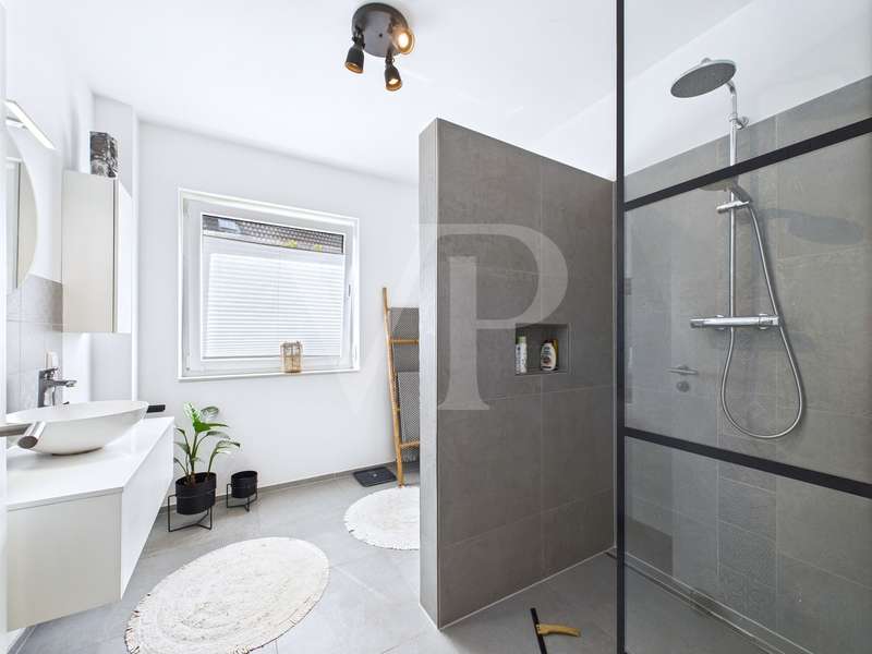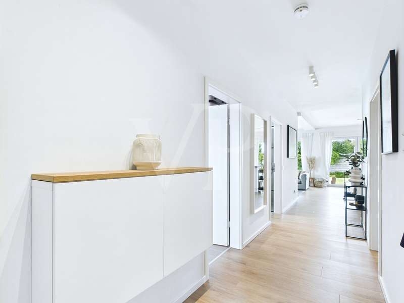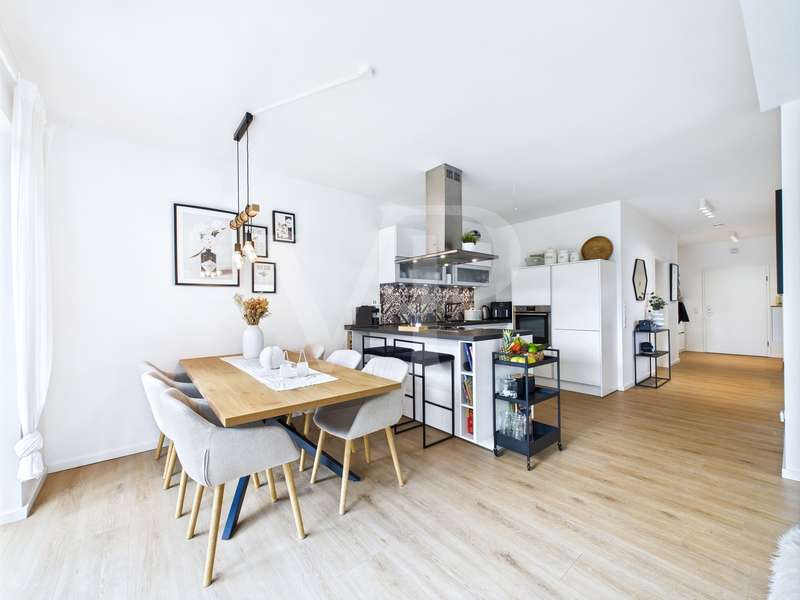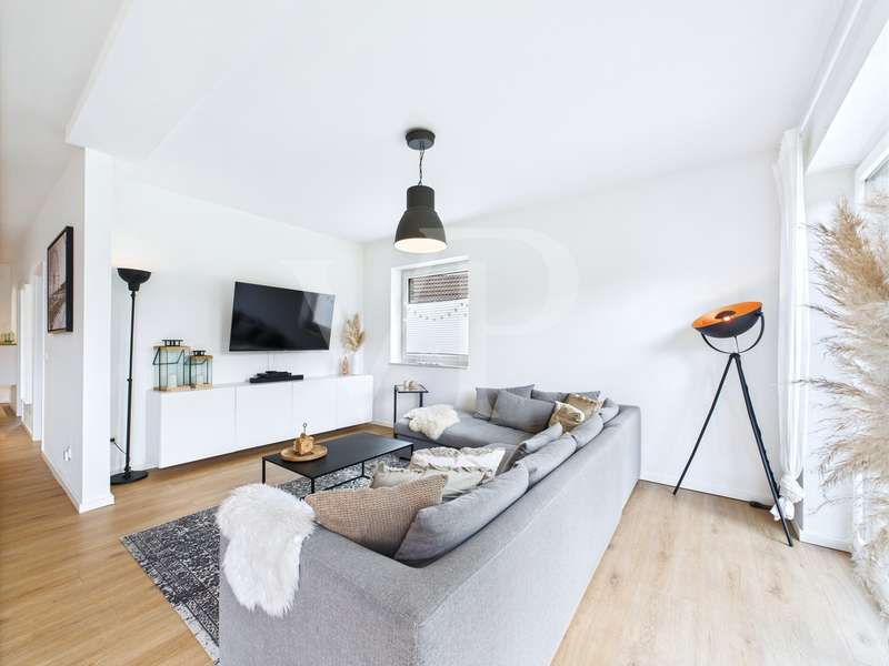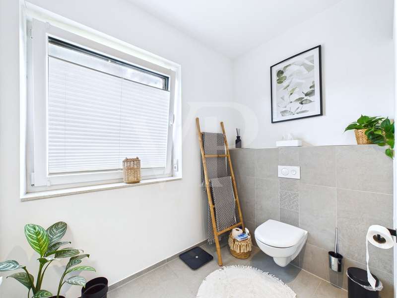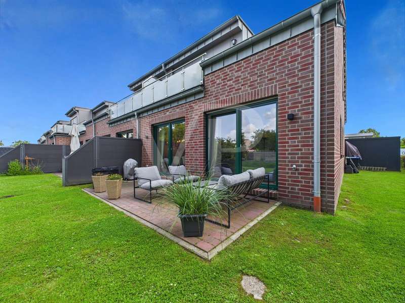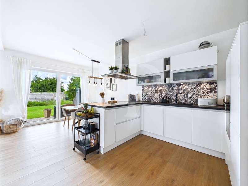 This first-class condominium combines contemporary architecture with a living concept that meets the needs of both young people on their way to their first home and senior citizens who value comfort and relief. Completed in 2021, the building was constructed using exquisite materials and meets the highest standards of quality, sustainability and living comfort. The first floor apartment offers approx. 79 m² of living space, flooded with light and well thought out down to the last detail. A spacious bedroom, an open-plan living and dining area with a stylish, high-quality fitted kitchen and a practical utility room create space for relaxed, everyday living. The modern shower room is barrier-free and offers maximum comfort in every phase of life. A special highlight is the spacious terrace with the adjoining, extensive garden, which gives you a private retreat in the countryside. A private parking space right outside the door and a separate shed for garden tools or bicycles provide additional convenience and flexibility. In addition to the first-class fittings, the apartment impresses with its remarkable energy efficiency. Triple-glazed insulated windows with external roller shutters and fly screens, modern underfloor heating and the pioneering mix of efficient heat pump and gas central heating guarantee low energy costs and a comfortable living climate all year round. The combination of high-quality insulation with modern technologies ensures that your home is both ecologically and financially sustainable. This apartment is far more than just a property - it is a stylish retreat that ideally combines contemporary construction, exclusive furnishings and high energy efficiency. Anyone looking for something special will find a home here that combines security, comfort and quality of life with a responsible view of the future.