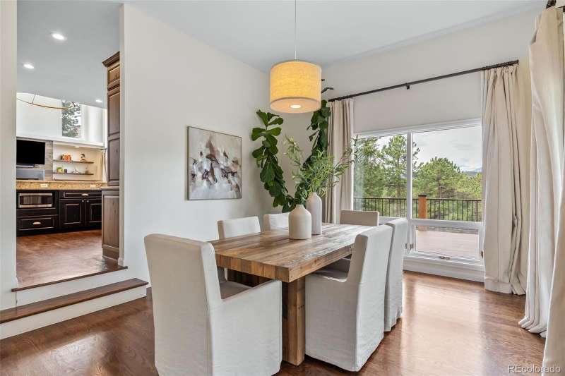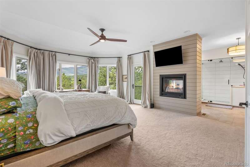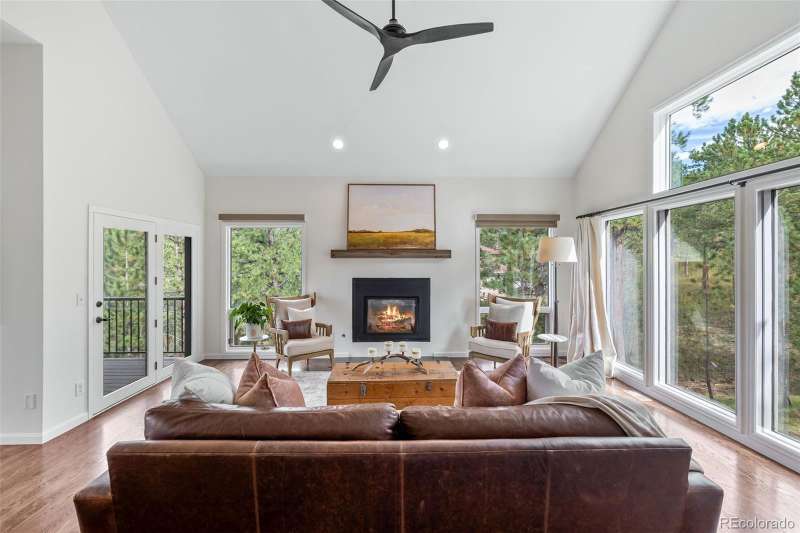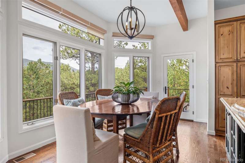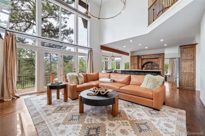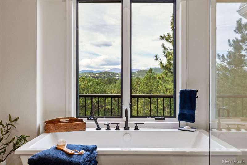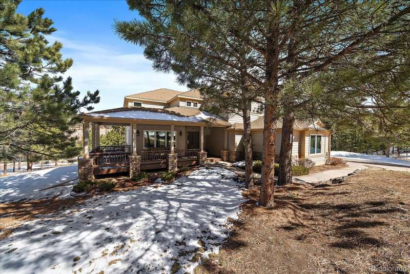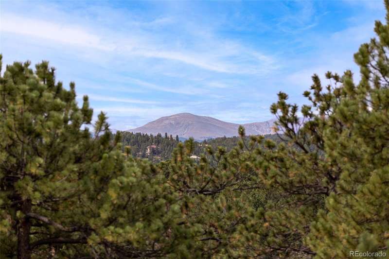 Experience awe-inspiring views from nearly every room of this striking mountain residence at the back of The Ridge at Hiwan. Positioned on a private 1-acre lot amongst towering pine trees, the home is surrounded by a new, expansive, wrap-around composite deck and flagstone patio, offering a truly elevated lifestyle. High ceilings and 2-story floor-to-ceiling windows and doors adorn bright and airy spaces throughout, anchored by exquisite wood floors and rich, wood accents. Generous living areas include a welcoming living room off the foyer, featuring a handsome fireplace, walls of windows, and access to the deck, plus an adjacent formal dining room showcasing spectacular views. A private office is found on the opposite side of the foyer, with French doors and beautiful views. The heart of the home is the great room, including a dramatic family room boasting an impressive fireplace, custom built-ins, plus 2-story ceiling and magnificent views of Bergen Peak and Mount Evans from double-height windows. The family room is open to a fantastic chefs kitchen with corner island, stainless steel appliances, and custom cabinetry, along with a sunny breakfast room surrounded by windows looking out to tree tops and overlooking the large, private and level/flat yard. Accommodations consist of 6 bedrooms, including a luxurious primary suite with sitting area and balcony enjoying incredible mountain views, plus a see-through fireplace to the spa-like 5-piece bath. Spacious upper loft plus 3 additional bedrooms and new 4-piece three-quarter bath are found upstairs. The walk-out level is an entertainers delight, comprised of a huge rec room looking out to the patio and back yard, 2 bedrooms, exercise room, new three-quarter bath, reading nook and ample storage. Exceptional location, with easy access to the Evergreen Wah Run open space and trail, along with stunning views and meticulous design, perfectly combine to create this custom Colorado retreat.