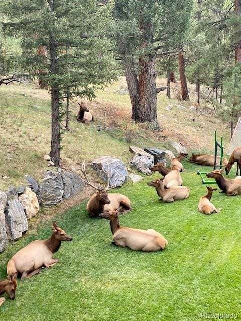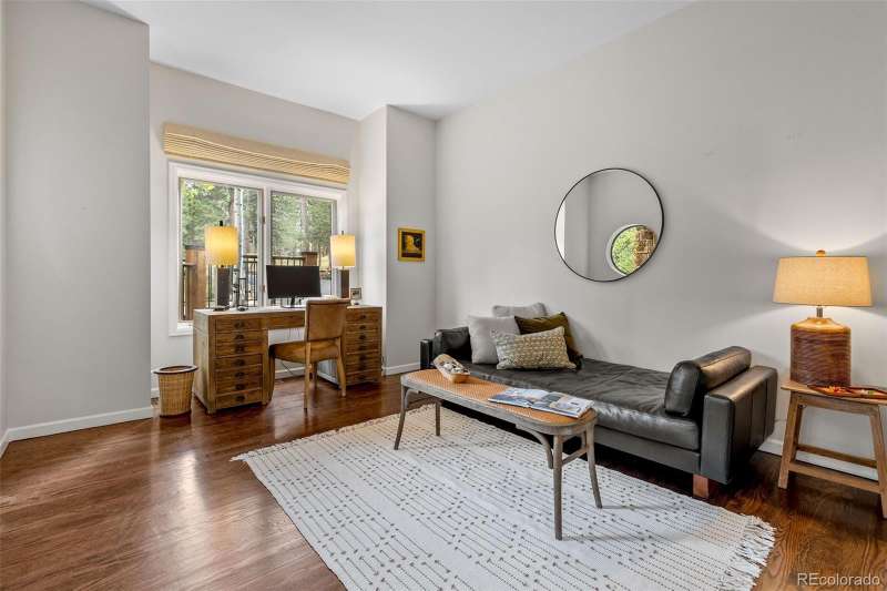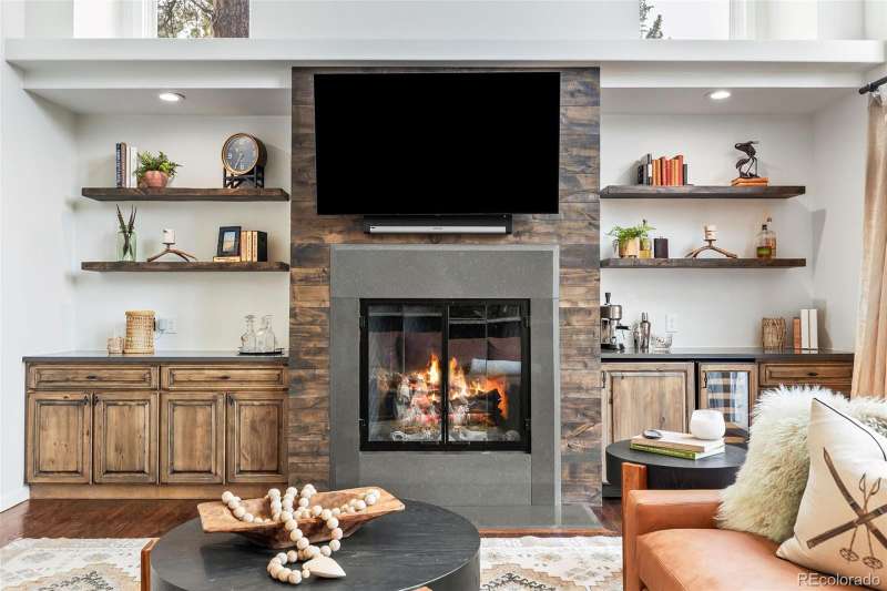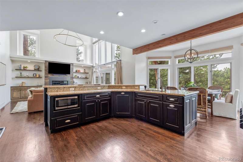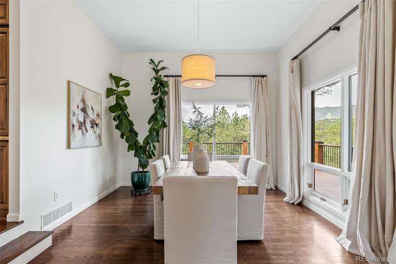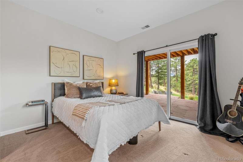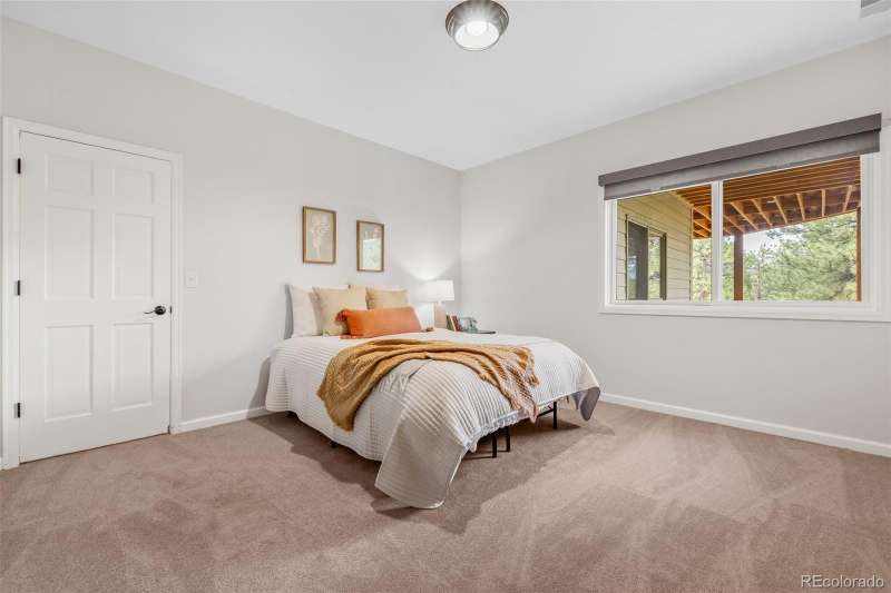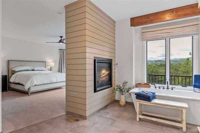 Experience awe-inspiring views from nearly every room of this striking mountain residence at the back of The Ridge at Hiwan. Positioned on a private 1-acre lot amongst towering pine trees, the home is surrounded by a new, expansive, wrap-around composite deck and flagstone patio, offering a truly elevated lifestyle. High ceilings and 2-story floor-to-ceiling windows and doors adorn bright and airy spaces throughout, anchored by exquisite wood floors and rich, wood accents. Generous living areas include a welcoming living room off the foyer, featuring a handsome fireplace, walls of windows, and access to the deck, plus an adjacent formal dining room showcasing spectacular views. A private office is found on the opposite side of the foyer, with French doors and beautiful views. The heart of the home is the great room, including a dramatic family room boasting an impressive fireplace, custom built-ins, plus 2-story ceiling and magnificent views of Bergen Peak and Mount Evans from double-height windows. The family room is open to a fantastic chefs kitchen with corner island, stainless steel appliances, and custom cabinetry, along with a sunny breakfast room surrounded by windows looking out to tree tops and overlooking the large, private and level/flat yard. Accommodations consist of 6 bedrooms, including a luxurious primary suite with sitting area and balcony enjoying incredible mountain views, plus a see-through fireplace to the spa-like 5-piece bath. Spacious upper loft plus 3 additional bedrooms and new 4-piece three-quarter bath are found upstairs. The walk-out level is an entertainers delight, comprised of a huge rec room looking out to the patio and back yard, 2 bedrooms, exercise room, new three-quarter bath, reading nook and ample storage. Exceptional location, with easy access to the Evergreen Wah Run open space and trail, along with stunning views and meticulous design, perfectly combine to create this custom Colorado retreat.