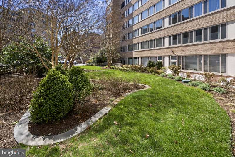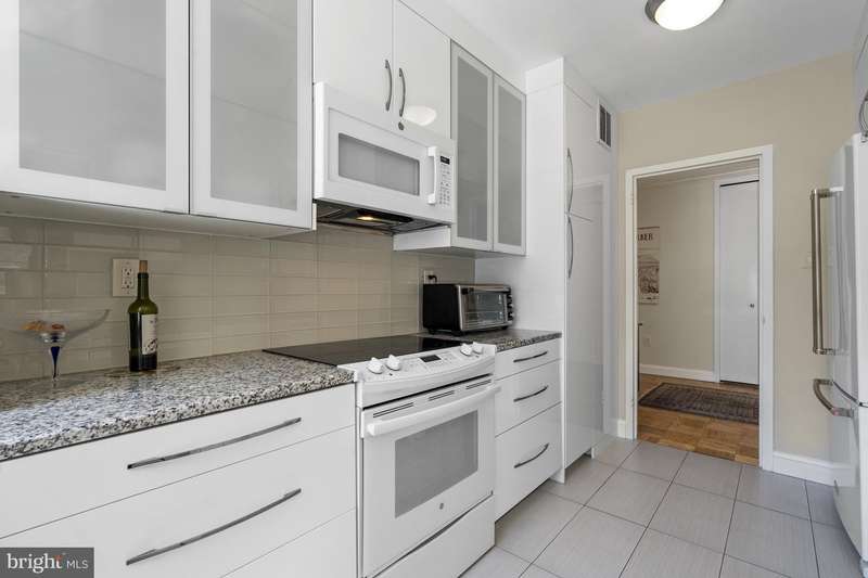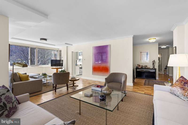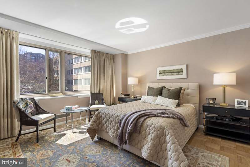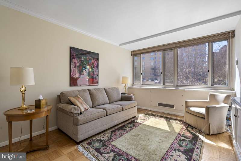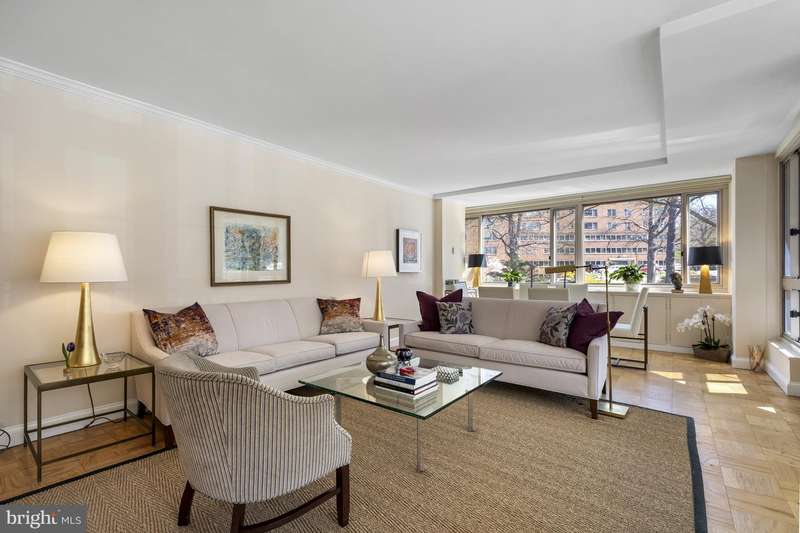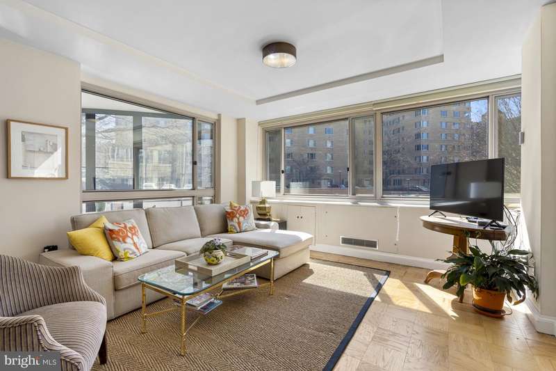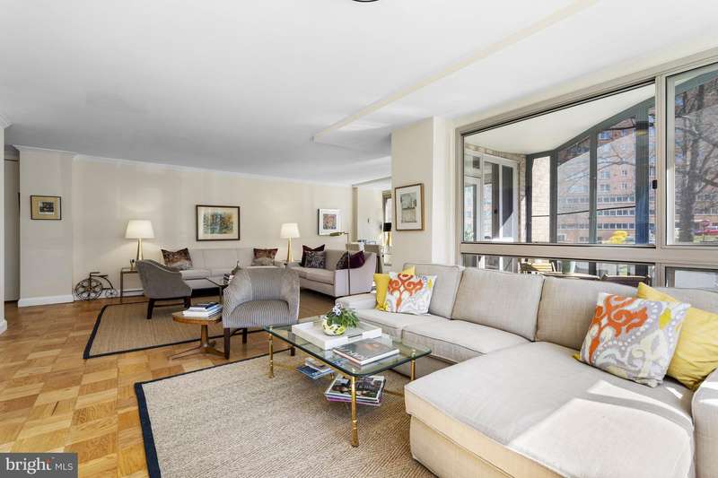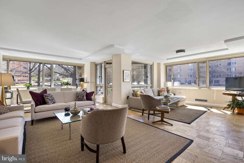 PRICE IMPROVEMENT! Spacious and light-filled 2 bedroom, 2 bathroom corner apartment at the Cathedral Avenue Coop. An intimate foyer unfolds into an expansive open living area with walls of windows, original parquet floors throughout and as currently configured generously proportioned living room, family room and dining room areas, and access to a private enclosed balcony. Off the main living area lies a renovated kitchen with plentiful white lacquer cabinetry, GE, Amana and KitchenAid white appliances, rich porcelain floor and granite countertops accented by an elegant glass tile backsplash. A feature, unique to this layout in the building, is a south facing kitchen window providing views of lovely garden space below to enjoy while cooking or seated at its cozy breakfast bar. The primary bedroom features more of the original parquet floor, a walk -through closet and an en-suite bathroom with bathtub/shower with mosaic tile surround. A second bedroom with built-ins includes its own walk-in-closet. Across from this bedroom is a renovated bathroom with soothing grey tones, pedestal sink and a sleek frameless glass shower. This wonderful offering includes a designated full-size garage parking space and storage. Monthly fee covers all your expenses: utilities, heating , air conditioning, taxes, ground rent and access to the multitude of amenities of the building including a heated swimming pool, 24-hour/7 day a week concierge, fitness room, well-appointed laundry room, security. Located walking distance from the National Cathedral in the Observatory Circle area, and convenient to supermarkets, and a variety of shops and restaurants.