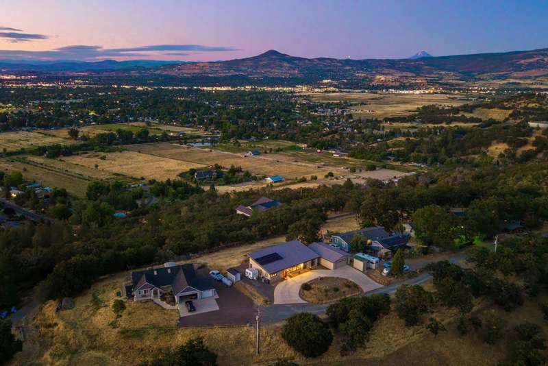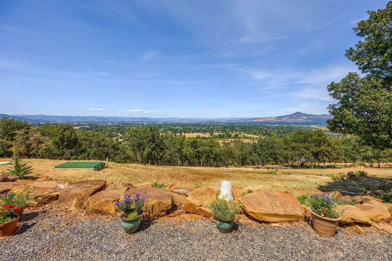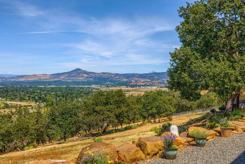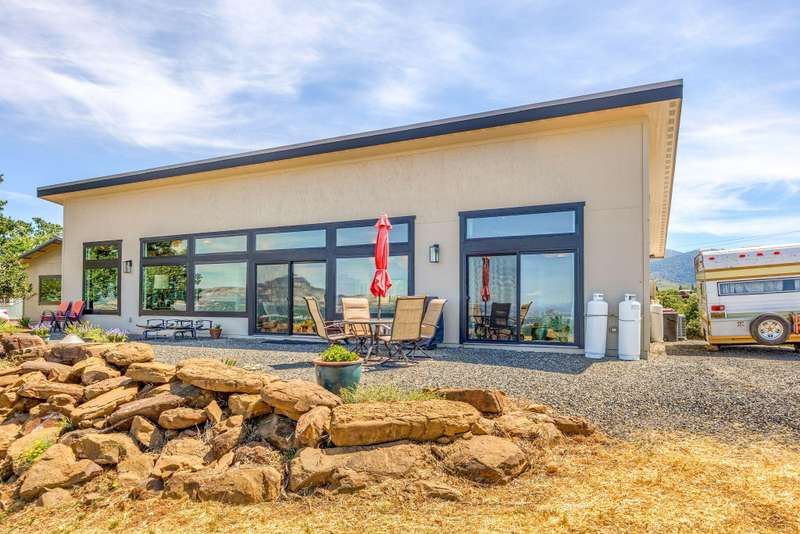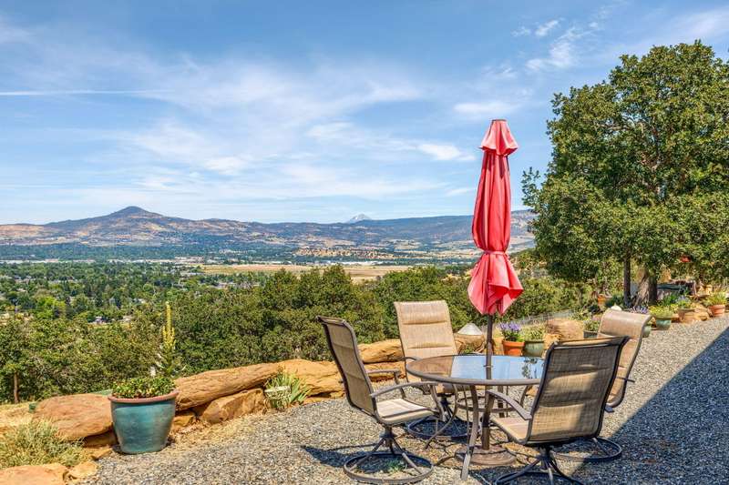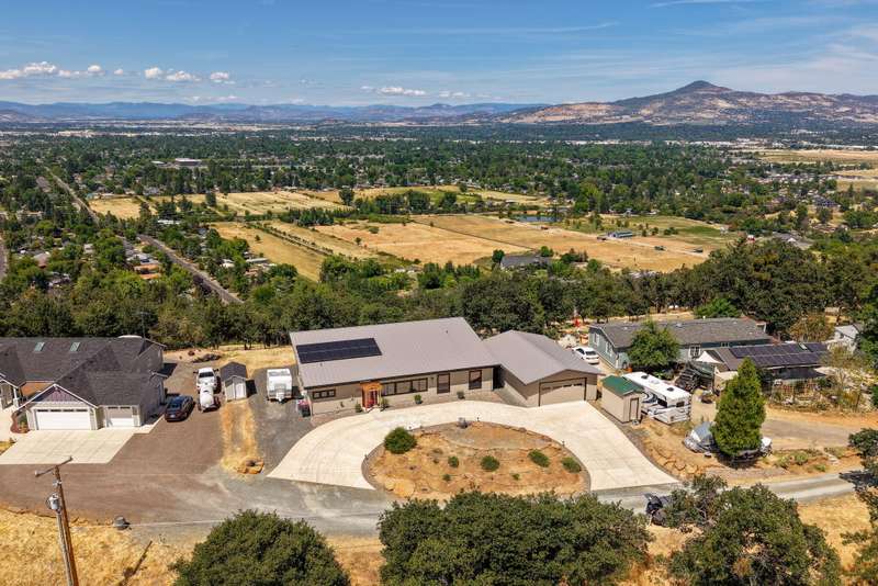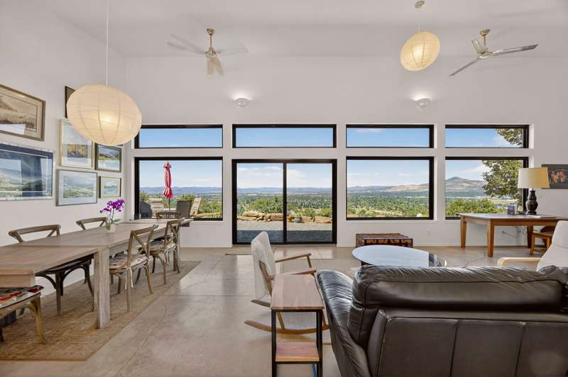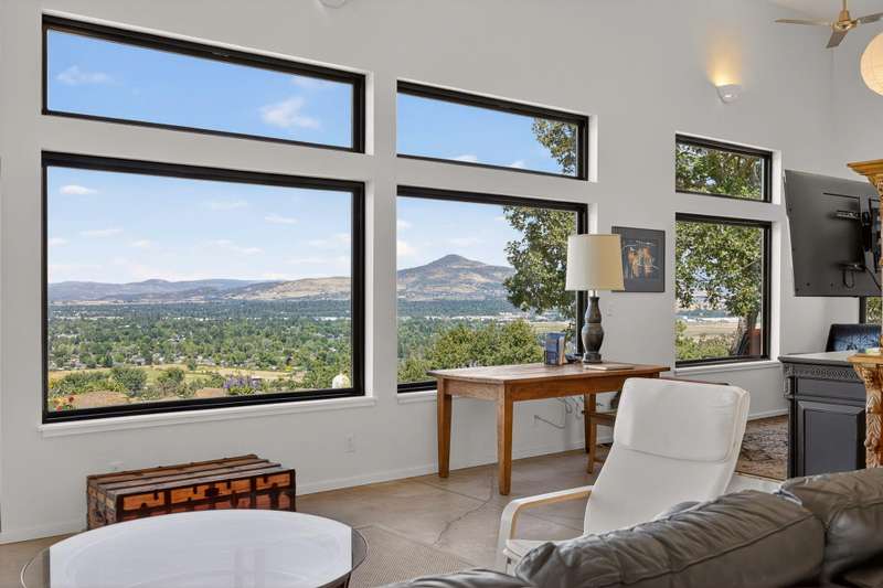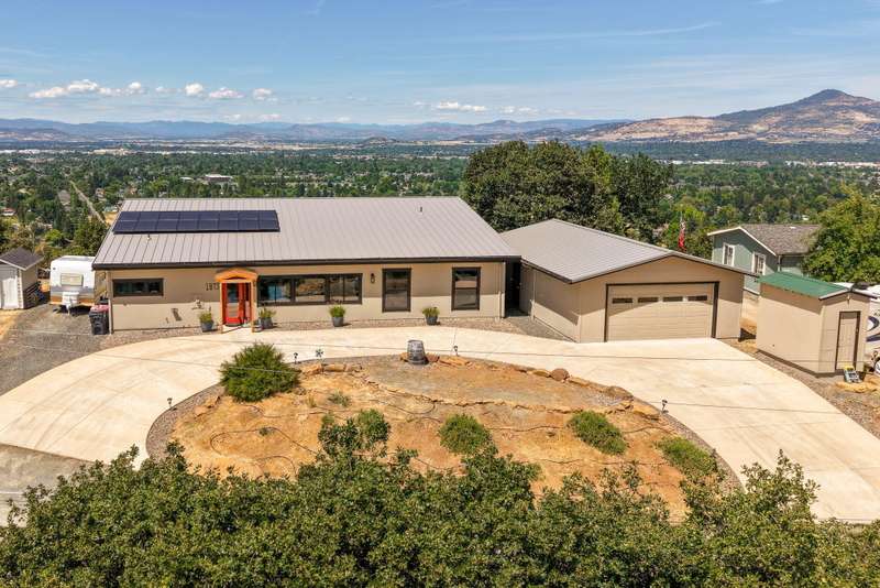 This custom-built, modern style home with true 180-degree views feels like a true piece of artwork. From the stunning curb appeal to the solar panels, you're sure to appreciate all the attention to detail. Amazing natural light throughout the versatile and open floorplan. Concrete flooring throughout and a spacious chef's kitchen with five-burner cook top, large center island, granite counters and a butcher block prep table. Formal and informal living areas with a large great room and vaulted ceilings. The oversized windows allow an abundance of natural light and all the surrounding mountain and city views. A glass sliding door off the dining area provides easy access to the outdoors. Large primary suite with custom dual sink vanity and large tile shower. Located in a country setting but close-in to city amenities. RV parking plus a detached 936 square feet garage. This is truly one-of-a-kind.