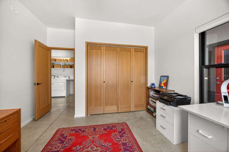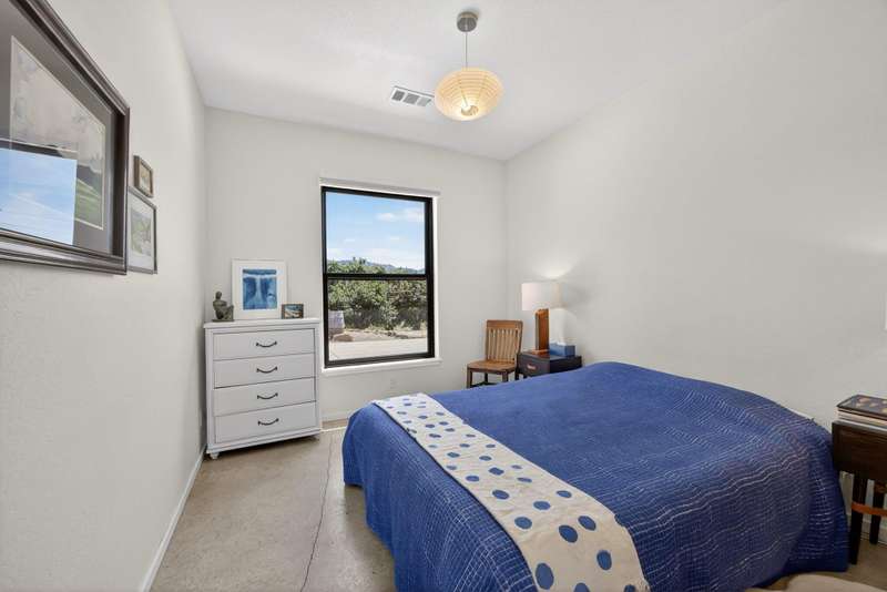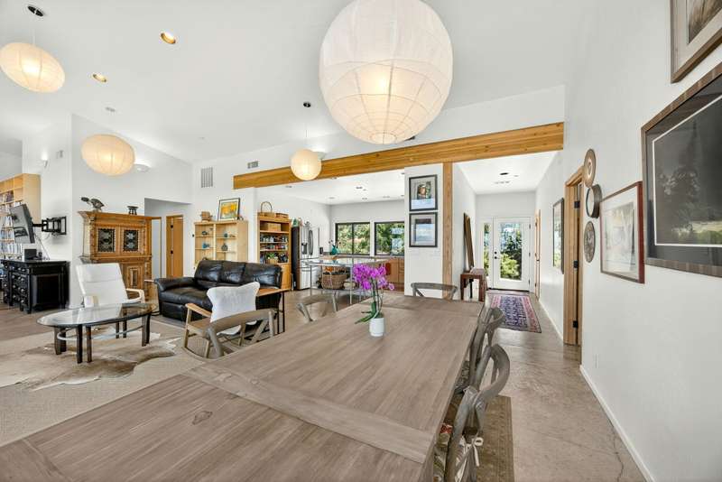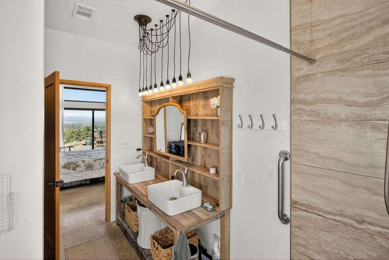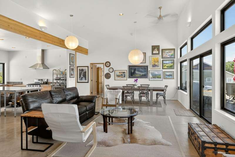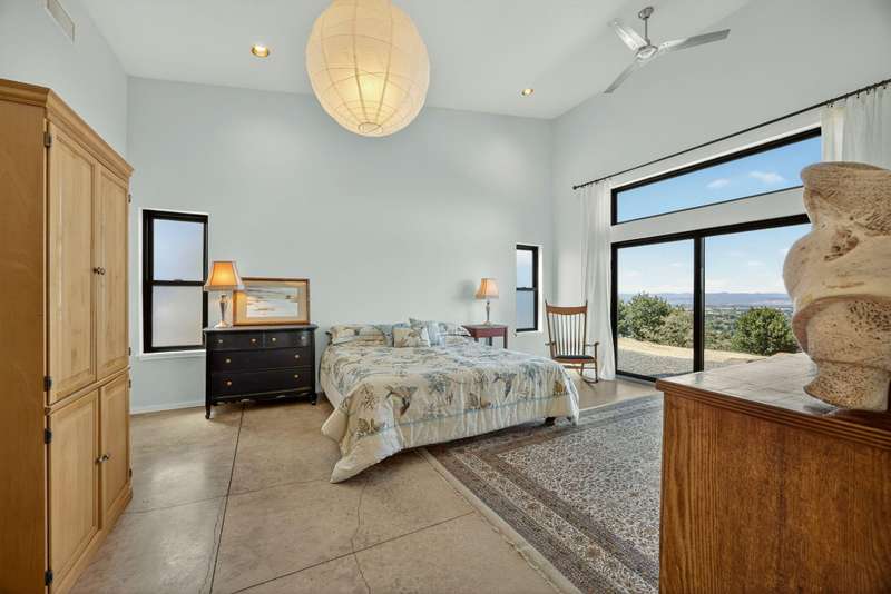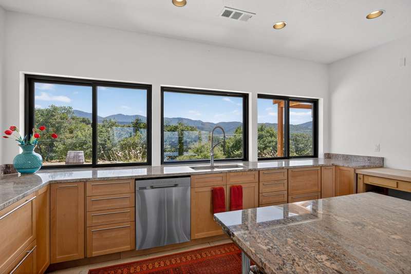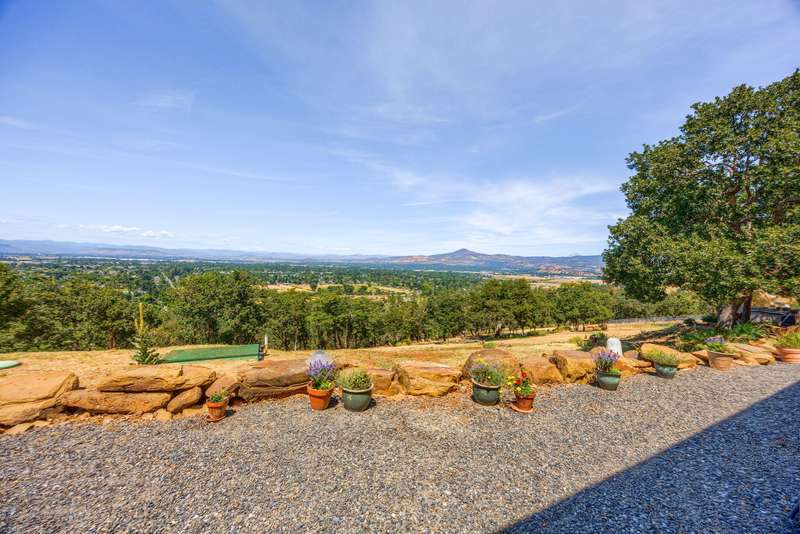 This custom-built, modern style home with true 180-degree views feels like a true piece of artwork. From the stunning curb appeal to the solar panels, you're sure to appreciate all the attention to detail. Amazing natural light throughout the versatile and open floorplan. Concrete flooring throughout and a spacious chef's kitchen with five-burner cook top, large center island, granite counters and a butcher block prep table. Formal and informal living areas with a large great room and vaulted ceilings. The oversized windows allow an abundance of natural light and all the surrounding mountain and city views. A glass sliding door off the dining area provides easy access to the outdoors. Large primary suite with custom dual sink vanity and large tile shower. Located in a country setting but close-in to city amenities. RV parking plus a detached 936 square feet garage. This is truly one-of-a-kind.