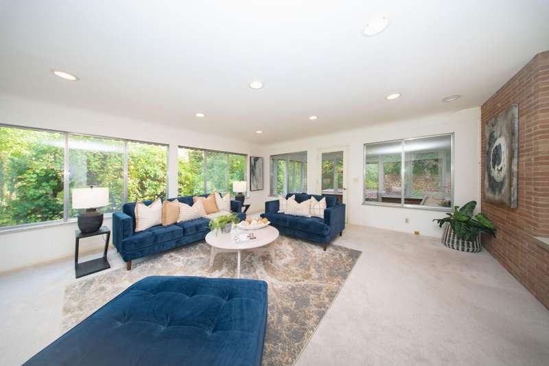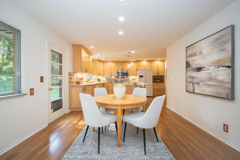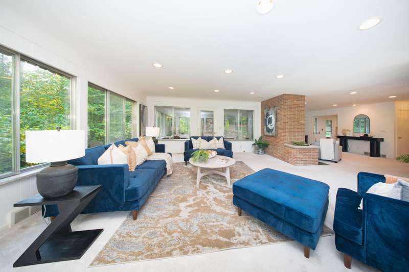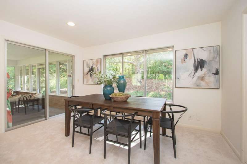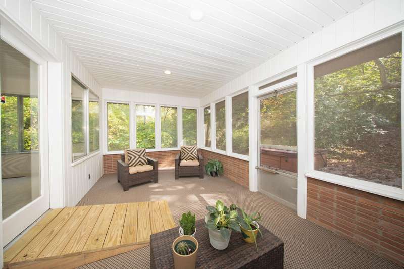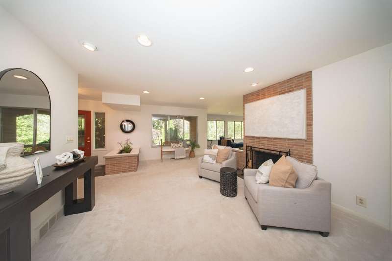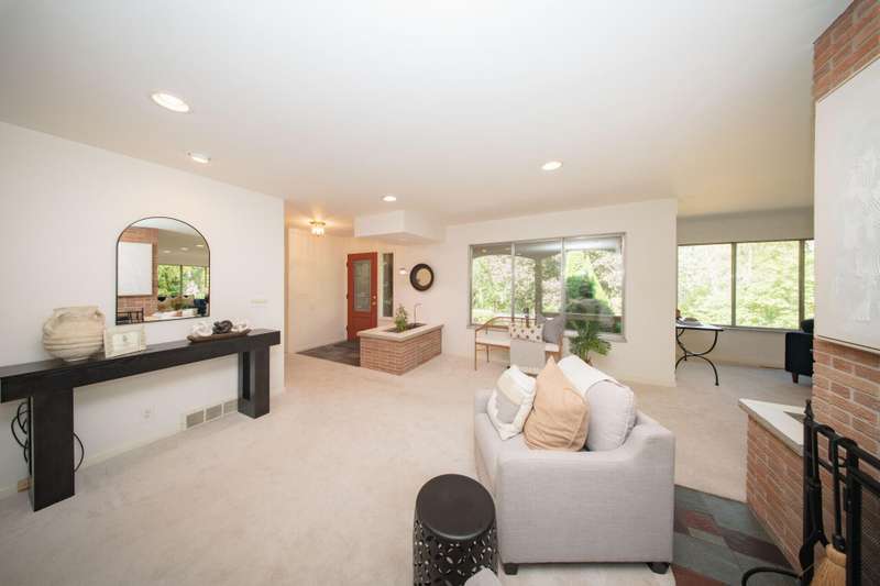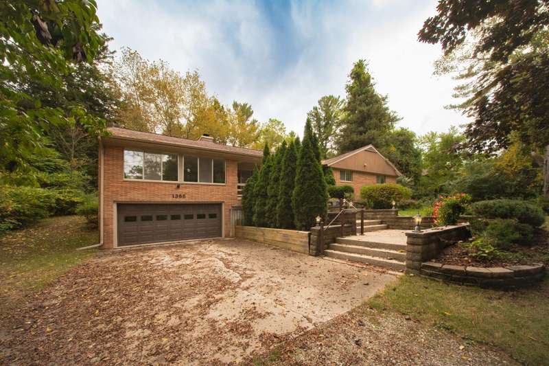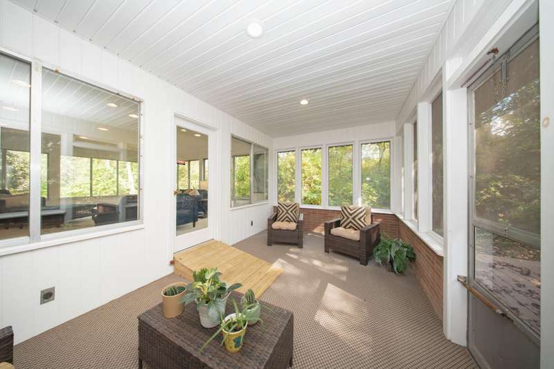 Located in the heart of Ann Arbor, yet in a serene and private setting, this raised brick ranch is a true contemporary mid-century modern home featuring private, mature landscaping and situated right across from Braun Nature Area. As you enter into the foyer off the covered porch, you are greeted with a flagstone tile floor and a built in garden box, reflecting the nature of its era. The home offers a large living room and family room with an open concept, separated by a full brick wood-burning fireplace. The family room boasts wall to wall windows and leads to a three season room that is also comprised of mostly windows--a nature lover's dream--which opens out to the park-like backyard. The dining area is spacious and bright, leading to an updated gourmet kitchen with hardwood flooring, custom 42 inch maple cabinetry with crown molding, a center island with seating, granite countertops, and a custom tile backsplash. The primary bedroom suite is generously sized and includes a private bathroom with a fully tiled spa sized shower, separate commode, custom cabinets, walk in closets, and beautiful birch tree wallpaper that lends to the tranquil vibe. The second main bedroom is also nicely sized and has access to a second fully updated bathroom with custom gray cabinetry, tile flooring, quartz countertops, separate tub, and a large tiled curbless shower with glass Euro door. The lower level adds fantastic living space and includes a large laundry area with cabinetry and a folding station, a full bathroom with shower, two large bedrooms, and leads out to the attached two car garage with an additional built on finished room that is ideal for canning, tools, and toys. This home provides a rare opportunity to live in a natural, private setting while being just a short walk to shopping, restaurants, family activities, and expressways. Low Ann Arbor Township taxes. This home is handicap accessible with a chair lift from the lower level to the main floor (owners will remove upon request). A true Ann Arbor rare gem!