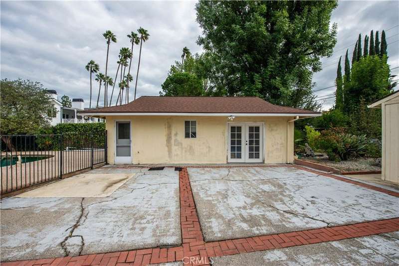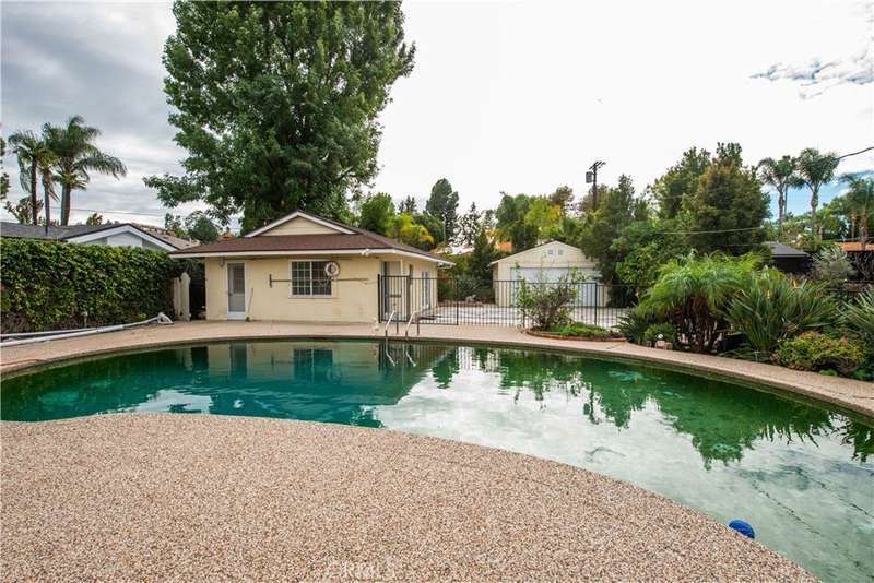 Discover an exceptional opportunity on a quiet, coveted street south of the Boulevard. A circular driveway sets the tone as you arrive at this expansive property, featuring a main residence, separate guest house, workshop, and detached garage—all situated on a sprawling, park-like lot. Inside, the home welcomes you with open living spaces and a grand living room showcasing vaulted wood-beamed ceilings and walls of glass framing views of the lush grounds. The open-concept kitchen offers a step-in pantry, sunlit breakfast room, and abundant space to reimagine and customize to your taste. The main residence includes three generous bedrooms and three bathrooms, while a separate guest house—complete with its own private bath—sits toward the rear of the property, ideal for visitors, extended family, or creative use. Passing through the porte-cochere and down the private drive, you’ll find a spacious motor court and a two-car garage with extensive additional storage. Outdoors, enjoy sun-filled grounds surrounded by mature landscaping, an expansive entertainer’s patio, and a sparkling pool, serene setting with endless possibilities on its untouched spaces. Whether you’re an end-user, contractor, or developer, this is a rare chance to acquire a highly versatile property in one of Woodland Hills’ most sought-after pockets. With multiple structures, abundant space, and an unbeatable south-of-the-Boulevard location, the potential here is truly extraordinary.