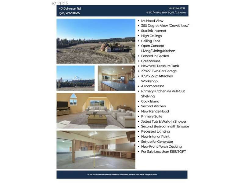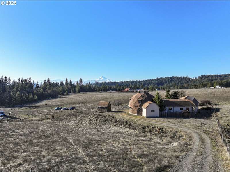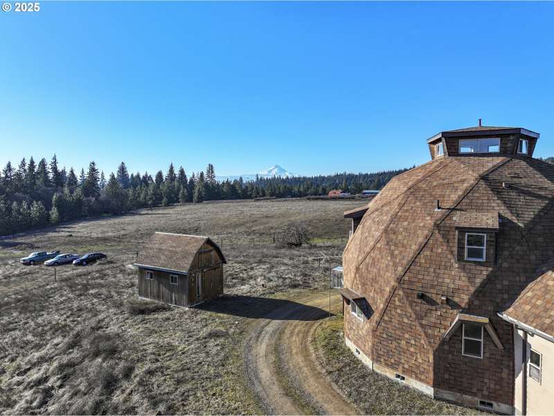 This well situated geodesic dome home sits on 2 picturesque acres with amazing mountain views, especially from the unique crows nest where you have a 360 degree view of the property and the quaint rural life around. With over 3000 sqft of home there is endless opportunities with a huge open concept living/kitchen/dining space, generous primary suite with walk in closet and full bathroom attached, second main level bedroom also enjoys an ensuite bathroom. On the other end of the home you can enjoy all of your hobbies including canning in the second kitchen, storing all your Gorge gear in the oversized garage or doing a number of projects in the workshop. Upstairs you have two more spacious bedrooms, one of which leads to the crows nest. The house is set up to connect to a generator in case of emergencies. There is recent interior paint, exterior touchup paint and new decking on the front porch. Outside you can enjoy your fenced in garden with greenhouse that is protected from your regular property visitors, families of deer who frequent the property. The property is only a beautiful 30 minute drive to White Salmon or Hood River. With amazing service (both from the Starlink internet unit and cell service) you will have no troubles working from home or streaming your favorite show. At less then $200/sqft this house and property is a huge value! Huge savings with thousands of dollars in buyer incentives by using a preferred lender and , reach out for details!