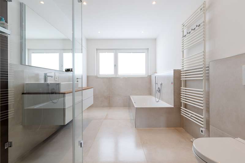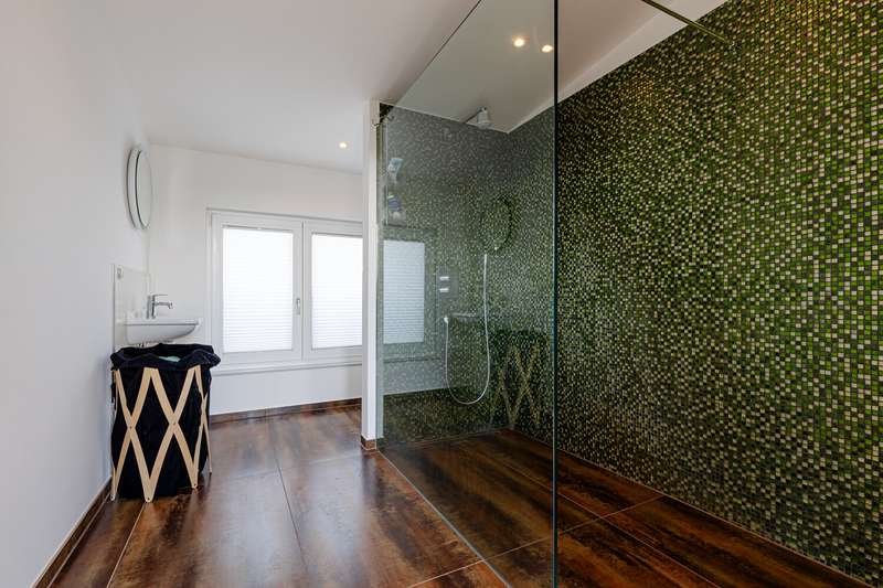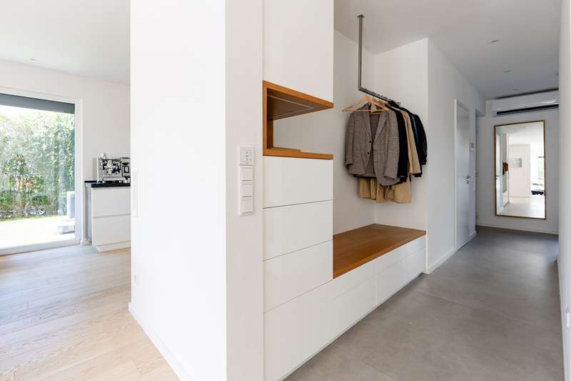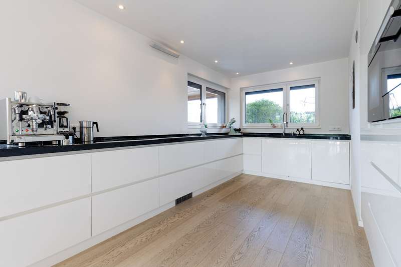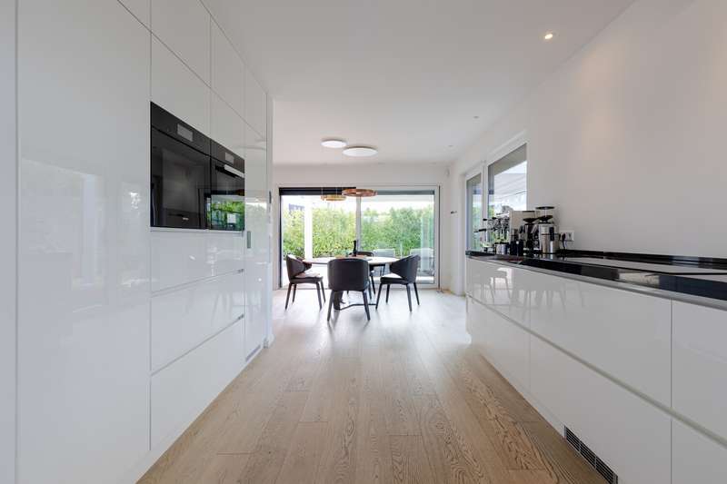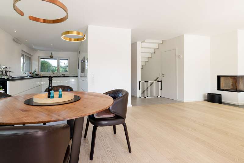 This modern semi-detached house from 2017 stands on a plot of approx. 471 m² and offers around 240 m² of living space. It is ideal for families who value style, comfort and a well-thought-out room layout. The open-plan living and dining area forms the heart of the house. Generous window fronts flood the room with natural light and open up a direct view of the garden with heated pool, outdoor shower and counter-current system. The covered terrace with modern pergola extends the living space outdoors and invites you to spend relaxing hours with family and friends. High-quality parquet flooring, air conditioning and the exclusive kitchen with granite worktop and Miele appliances ensure a stylish living ambience. Lighting, blinds and other functions can be conveniently controlled centrally via the integrated smart home system. There is also a practical laundry room on the first floor, which is ideally integrated and functional and features durable floor tiles. This makes it easy to organize everyday life without taking up living space on the upper floor. Upstairs, you will find three flexible bedrooms and modern bathrooms that are ideal for families with individual space requirements. A special highlight awaits you on the top floor: a private sauna area with shower and private terrace, the perfect place for relaxing wellness moments. Alternatively, this area can also be designed as a spacious parents' area with plenty of privacy. The versatile outdoor area is impressive: the sheltered garden behind the house with its heated pool offers a green oasis that is ideal for relaxation and leisure. The front garden is ideal as a play area for children - it is safe, clearly laid out and offers enough space for play equipment or vehicles. So everyone in the family has their own space. The offer is rounded off by sustainable home technology, including an air-to-water heat pump, a solar system and a water softening system. Three parking spaces right next to the house offer additional convenience.