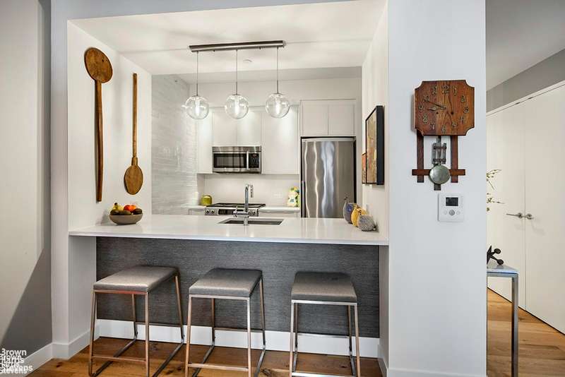The kitchen features custom white lacquer cabinets, marbled Caesarstone countertops and stainless steel appliances. The primary suite easily can accommodate