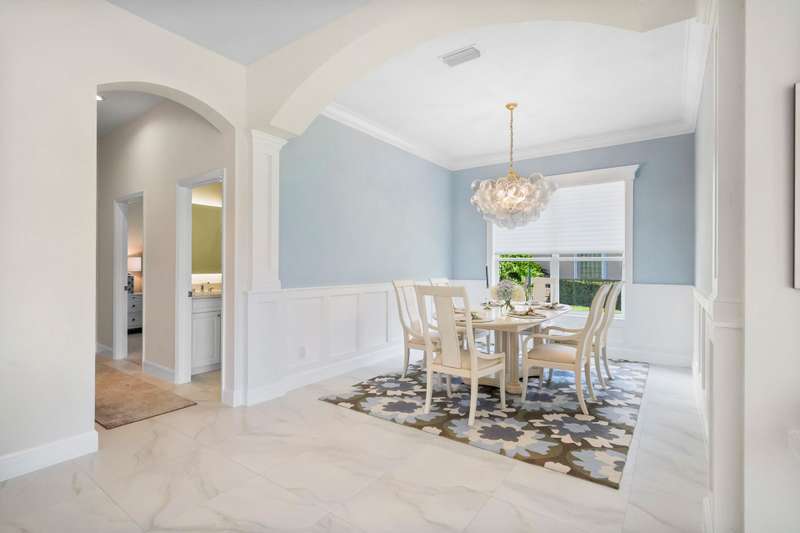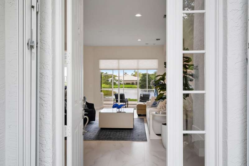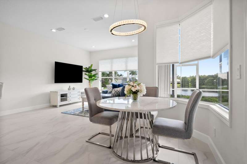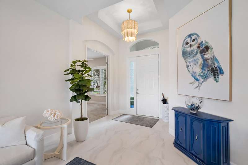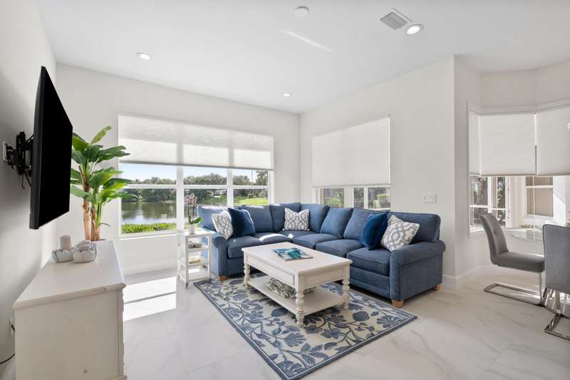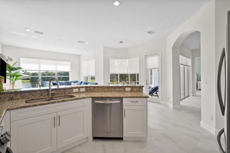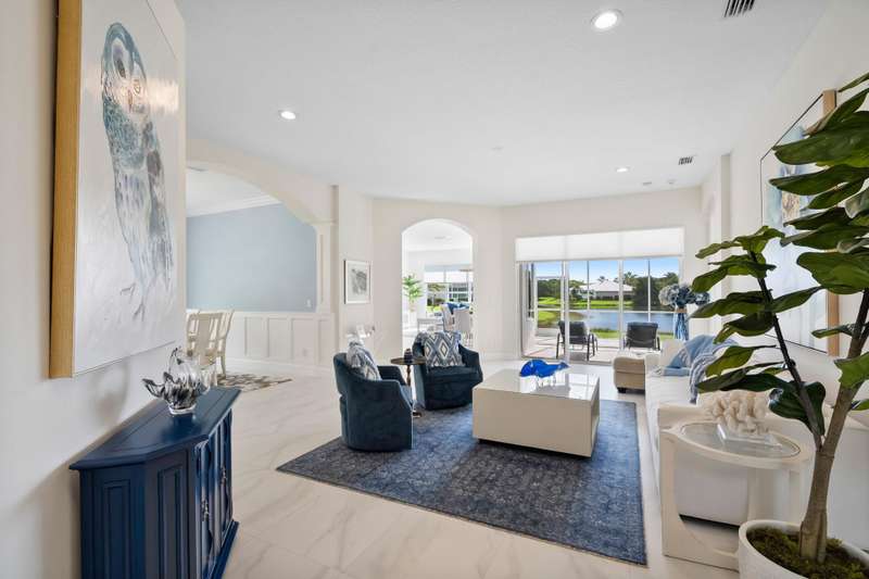 Beautifully renovated 3-bedroom, 2-bath home with an oversized 2-car garage plus bonus space for a golf cart or more. Roof replaced in 2021. The elegant double tray ceiling entry opens to arched walls and a formal dining area accented with wainscoting, an upgraded chandelier, and crown molding. The kitchen features 42 solid wood cabinets with crown molding, soft-close drawers, a new range, and newer appliances. Soaring 10-ft ceilings, 8-ft doors, and arched entryways are found throughout. Abundant natural light pours in through custom 76 windows in every room, complemented by remote-control blinds in common areas. Bedrooms offer walk-in closets, and the primary suite boasts serene lake views--also enjoyed from all common areas.