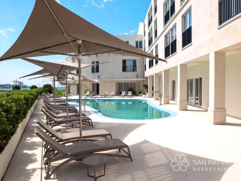 For sale is a charming sea view apartment with a pool, located in a luxurious resort in Umag, right by the sea. With a total of 49 m2 of living space, this modernly furnished apartment offers a spacious living room, kitchen, bathroom, and one bedroom. The apartment also includes a parking space in the underground garage and co-ownership of the pool located right next to the building.