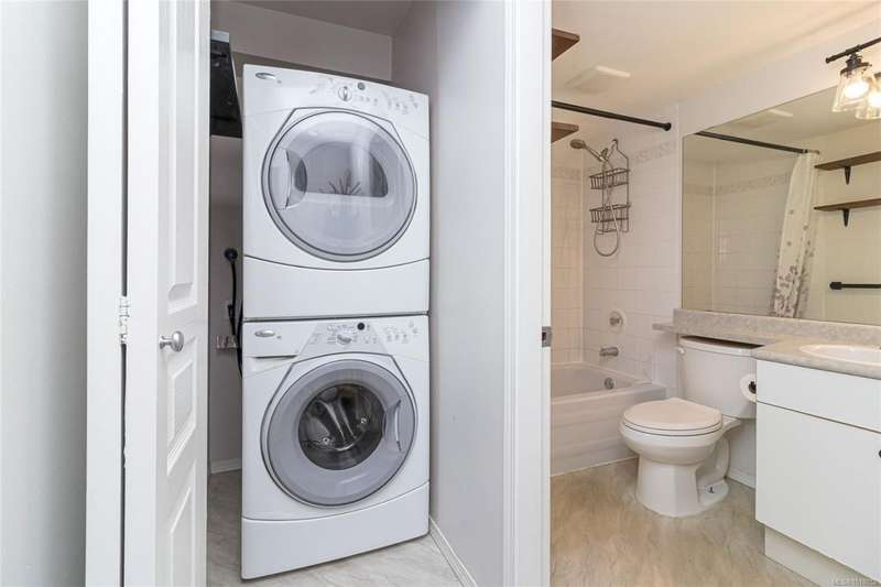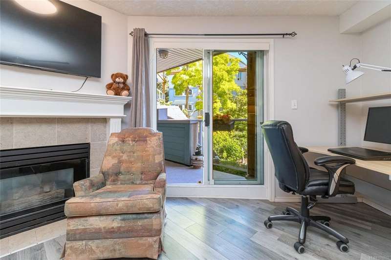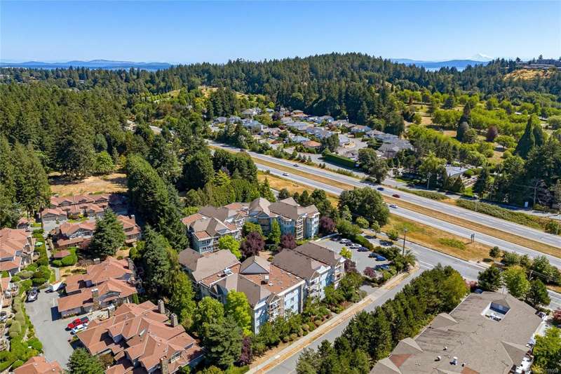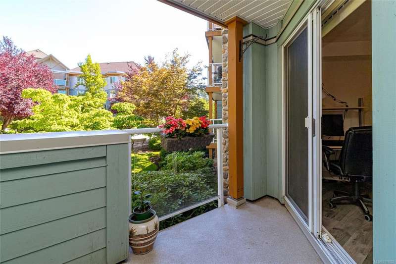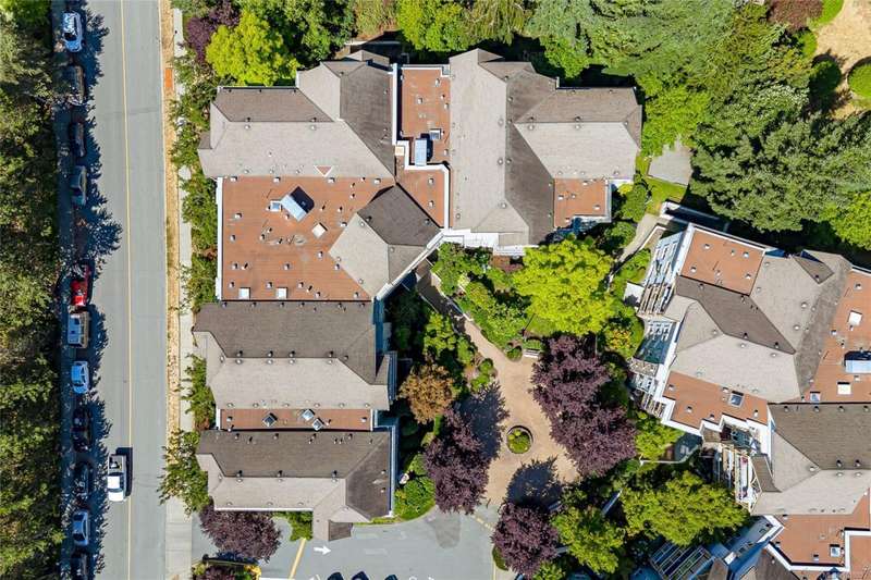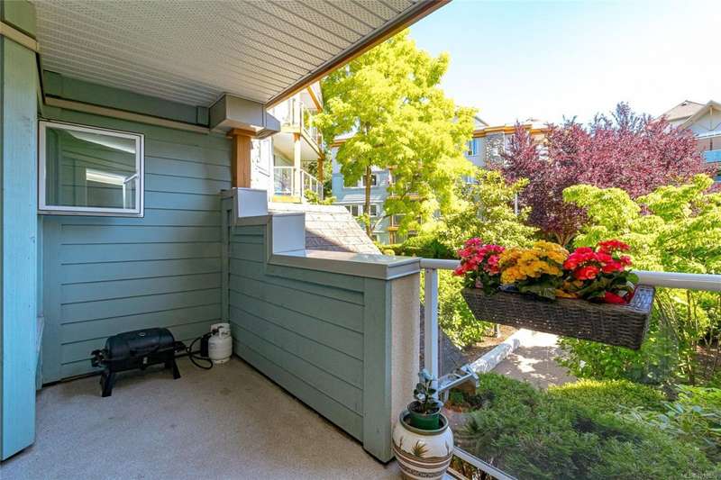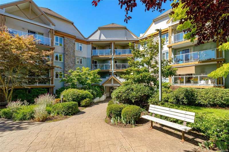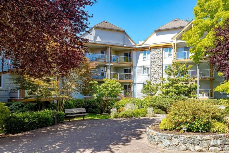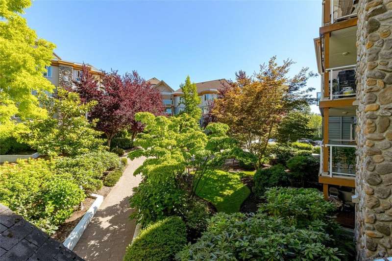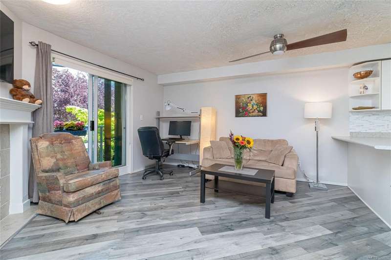 This delightful one-bedroom PLUS DEN condo comes with a generous balcony overlooking a lush garden of beautiful, mature trees. With its open concept layout, this spacious and quiet unit includes insuite laundry, a cheater ensuite bathroom, and a cozy gas fireplace with gas included in the low strata fees. The Park Royal Place is Pet-Friendly, allows BBQs, and this unit comes with both a Parking Space and a handy downstairs Storage Unit. Very conveniently located, it is just a 2-minute drive to Saanich Commonwealth Place with its pools, 5-mins. to peaceful Beaver/Elk Lake trails, 4 mins. to Broadmead Village Shopping Centre, about 18 mins. to either downtown Victoria or to the Airport, and about 20 mins. to the Ferry Terminal. What an ideal place to live!