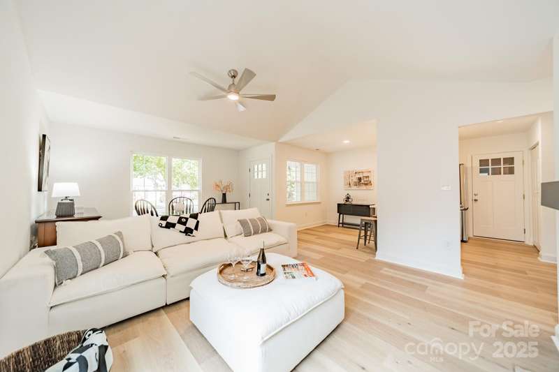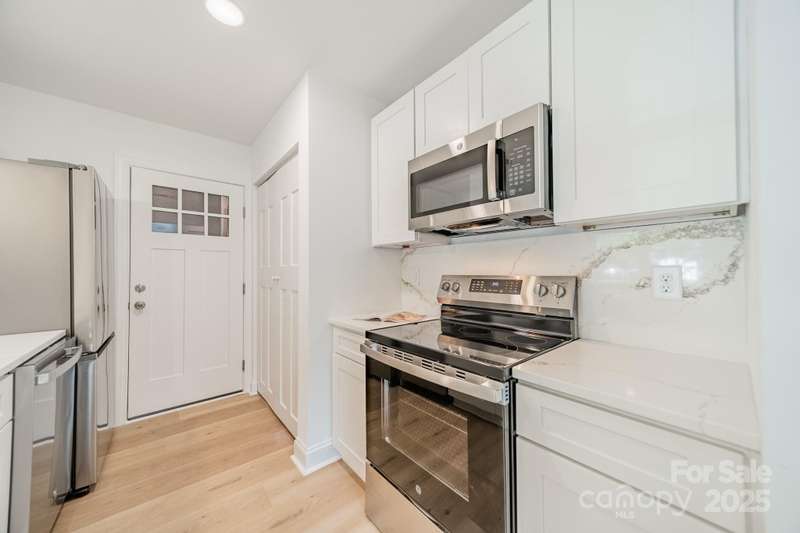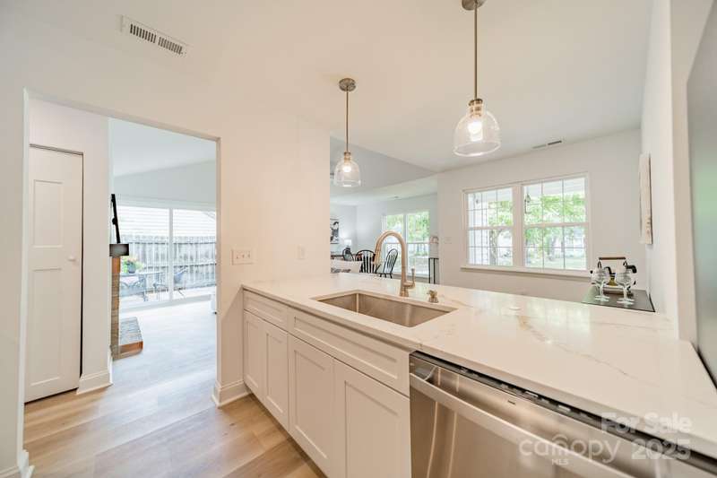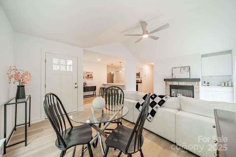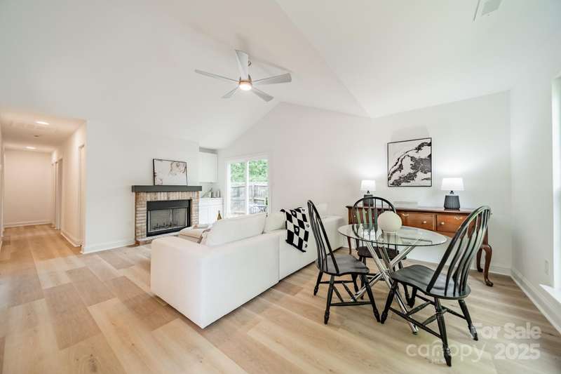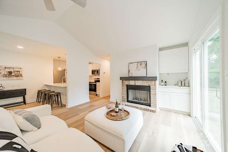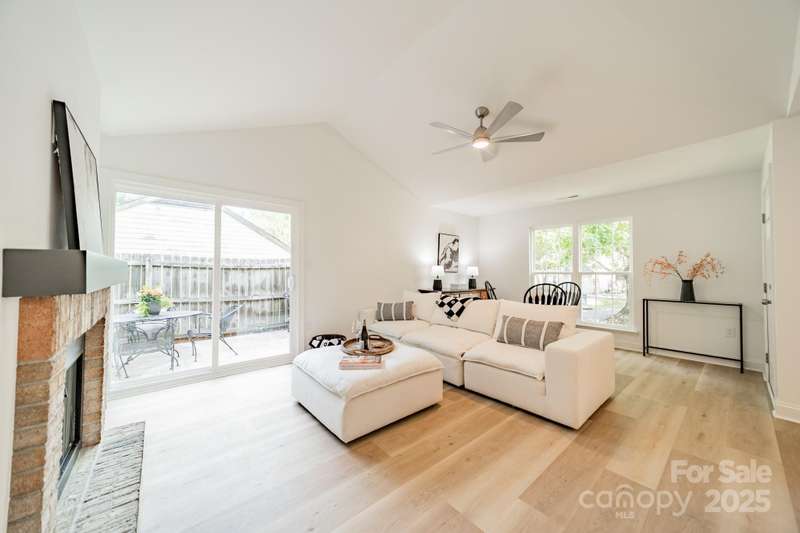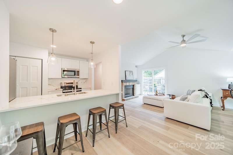 Charming 3 bedroom, 2 full bath home with a brand new interior! This house has been rebuilt down to the studs...new drywall, flooring, countertops, cabinets, appliances, lighting, hvac, electrical and plumbing. Light colored wood LVP and all white walls create an inviting space waiting for your style and color palette! New wood burning fireplace in July 2025 with stunning brick surround and wood beam Iron Ore painted mantle. All new windows in family room and kitchen areas. Gorgeous quartzite countertops and backsplash make the kitchen a pleasure to both cook in and entertain, complete with large single bowl stainless sink and new oven, dishwasher, refrigerator and microwave. Primary bedroom is spacious with custom closet shelving and the primary bath has a beautifully tiled shower with glass doors. Two additional bathrooms are situated conveniently to share the hall bath. Second bathroom has tub/shower combo with new white tile surround and navy vanity with quartzite counter. Covered front entryway and new sliding glass door off family room accesses patio for grilling and eating out! Backyard has gorgeous steps leading to a private oasis for cozy nights by a fire-pit with family and friends.