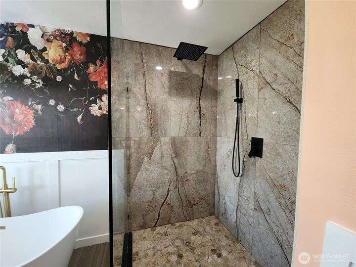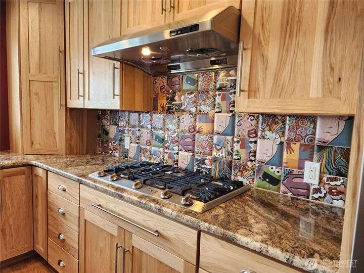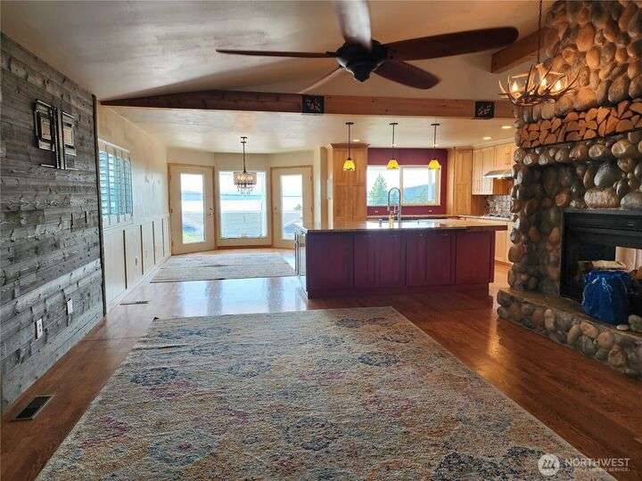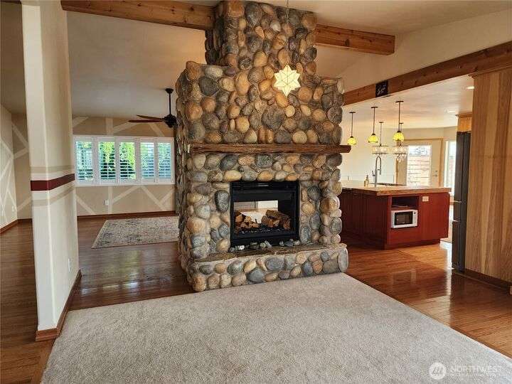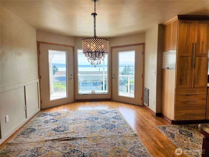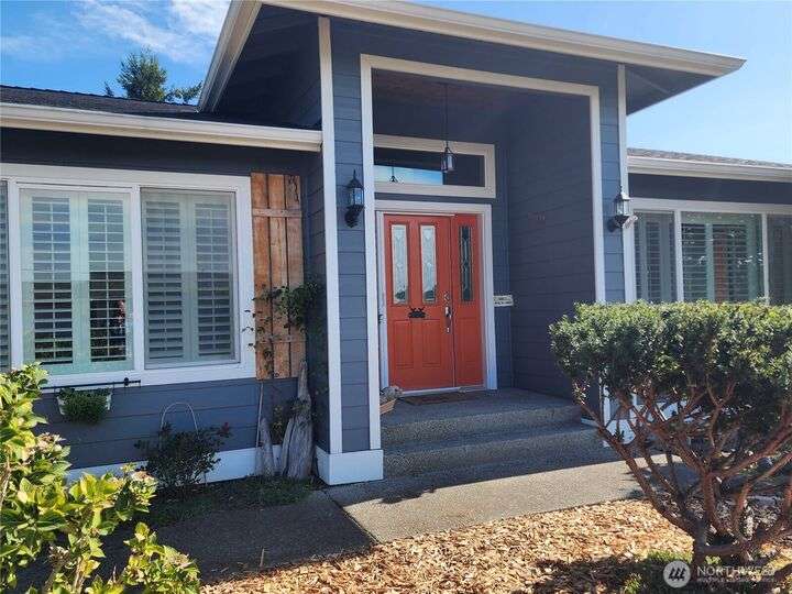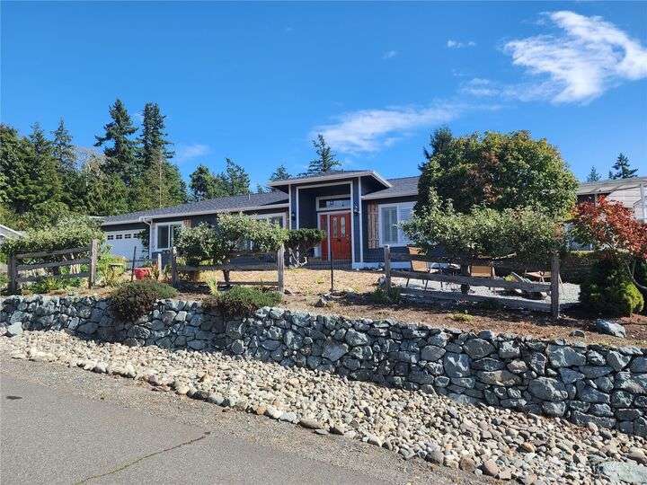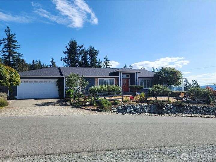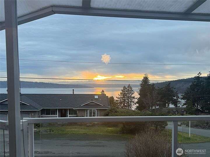 Amazing view rambler with beautiful touches throughout. All on one level living with spacious deck and view of Puget Sound and Olympic Mountains. Gourmet kitchen includes all stainless appliances, double oven, gas cooktop, huge granite island, and counters. Living Room with vaulted ceilings, stone fireplace, accent walls, and open concept feel. Separate family room slider to deck. Large master plus beautiful 5-piece bath. Bath features freestanding tub, tiled shower, and butcher block double sink. Main bathroom has beautiful teak sink bowl and artistic tiled shower. 2 Car garage. Detailed yard with mature landscaping. Beach rights are just down the hill.
