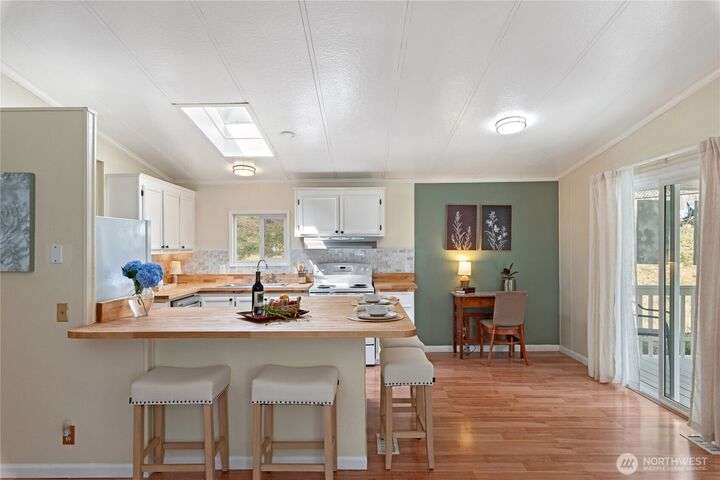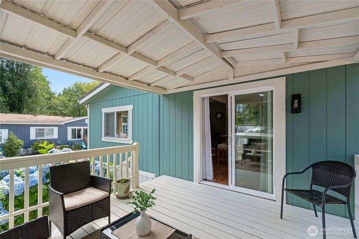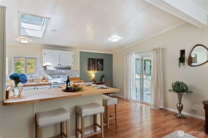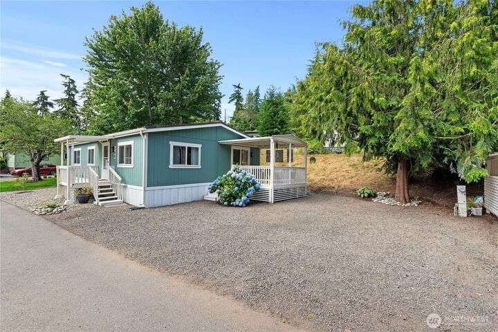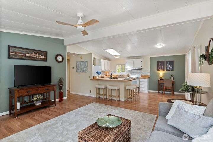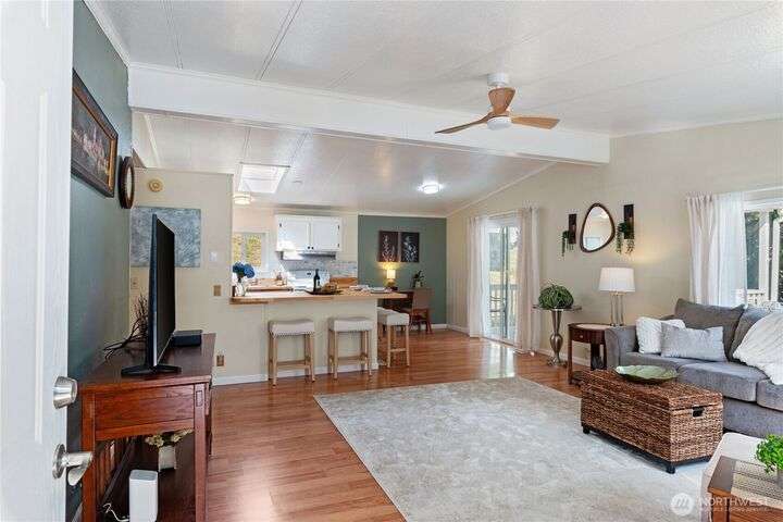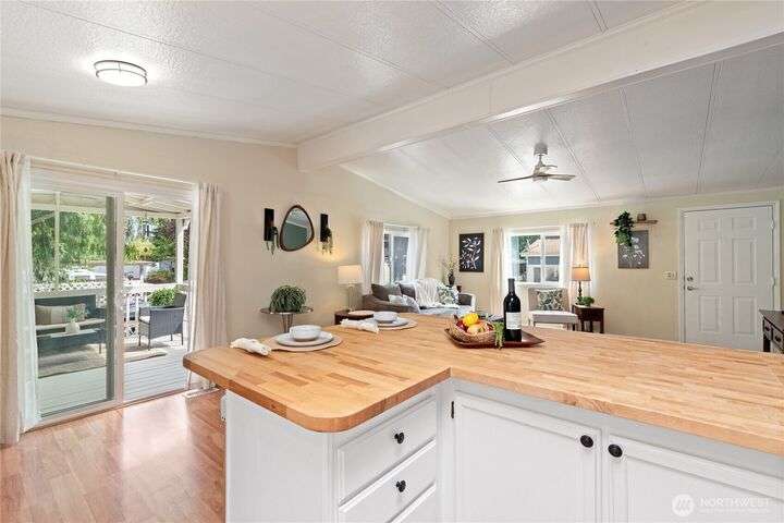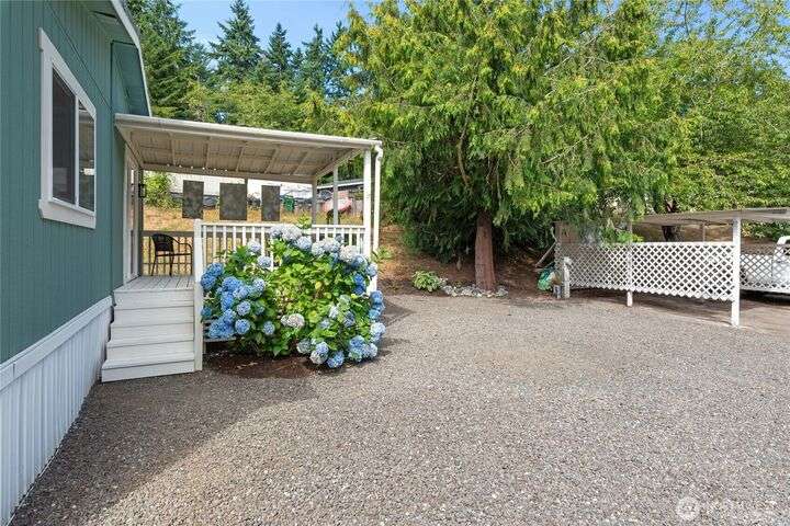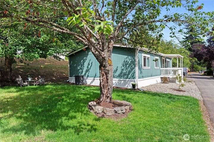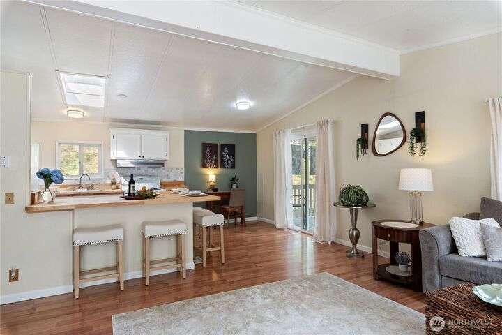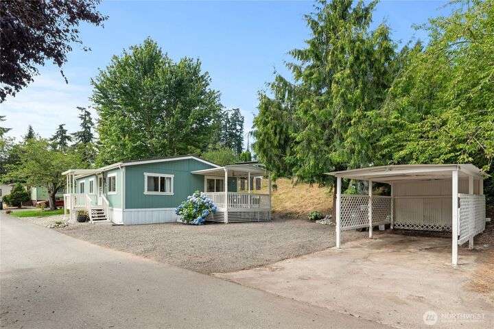 Beautifully updated home in an all-age park! This home offers a spacious covered deck & well-maintained lawn, providing inviting outdoor living spaces. The interior is filled with natural light & features an open floor plan, including a large kitchen with butcher block counter, island breakfast bar, new lighting & fixtures, laminate flooring & access to the deck. Primary bedroom has walk-through double closets & bath with walk-in shower. Updates include new vinyl windows, fresh interior & exterior paint, renovated bathrooms, all appliances, metal roof, heat pump for AC & parking for 4 vehicles, including a carport. The property is ideally located on a quiet, dead-end street near shopping centers, military bases and Central Kitsap schools.