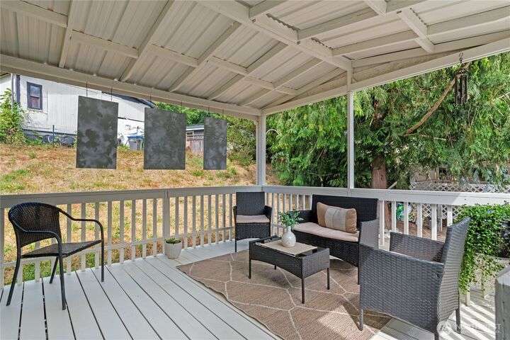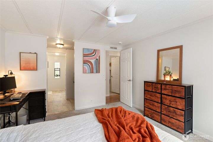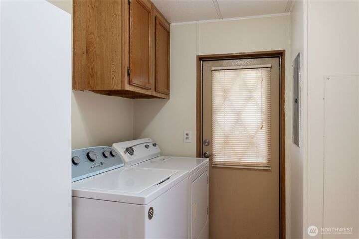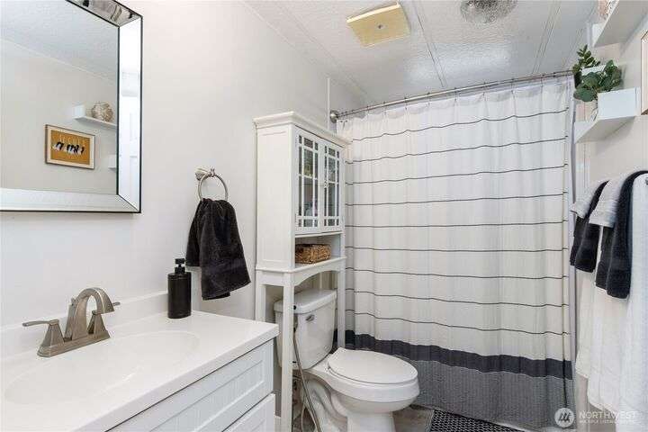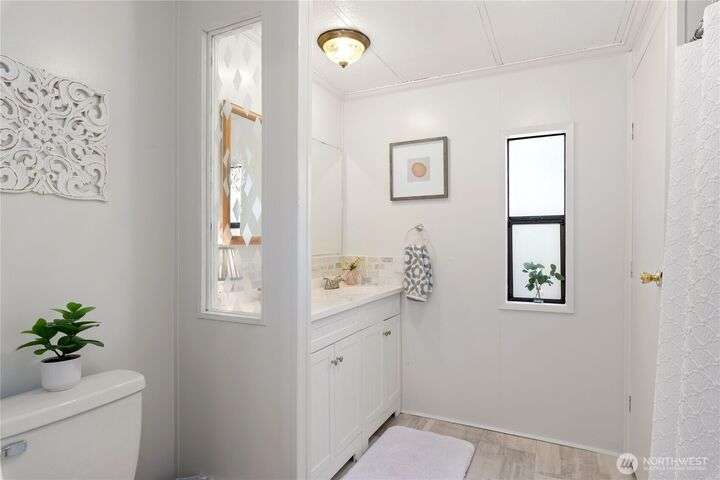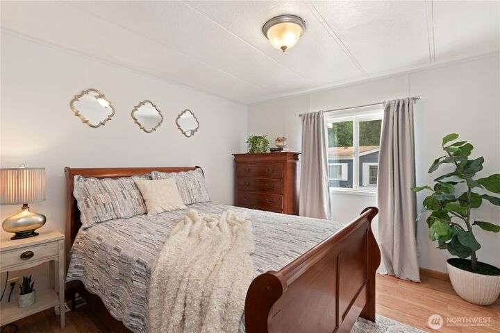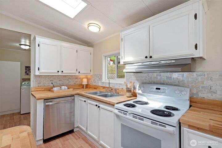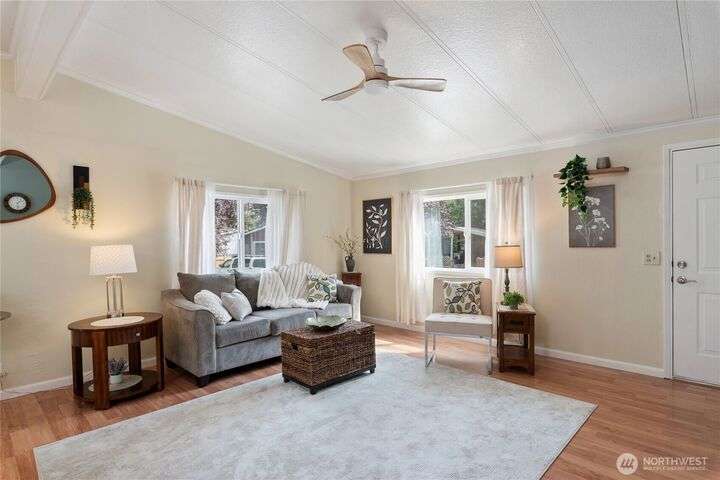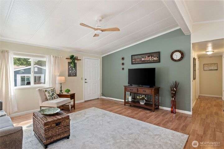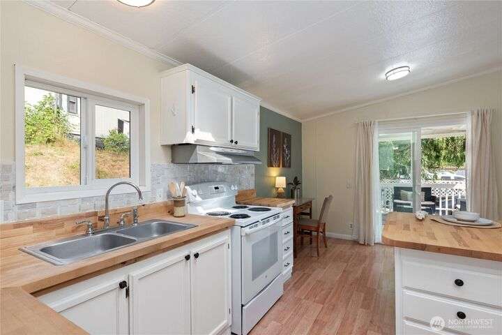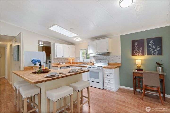 Beautifully updated home in an all-age park! This home offers a spacious covered deck & well-maintained lawn, providing inviting outdoor living spaces. The interior is filled with natural light & features an open floor plan, including a large kitchen with butcher block counter, island breakfast bar, new lighting & fixtures, laminate flooring & access to the deck. Primary bedroom has walk-through double closets & bath with walk-in shower. Updates include new vinyl windows, fresh interior & exterior paint, renovated bathrooms, all appliances, metal roof, heat pump for AC & parking for 4 vehicles, including a carport. The property is ideally located on a quiet, dead-end street near shopping centers, military bases and Central Kitsap schools.