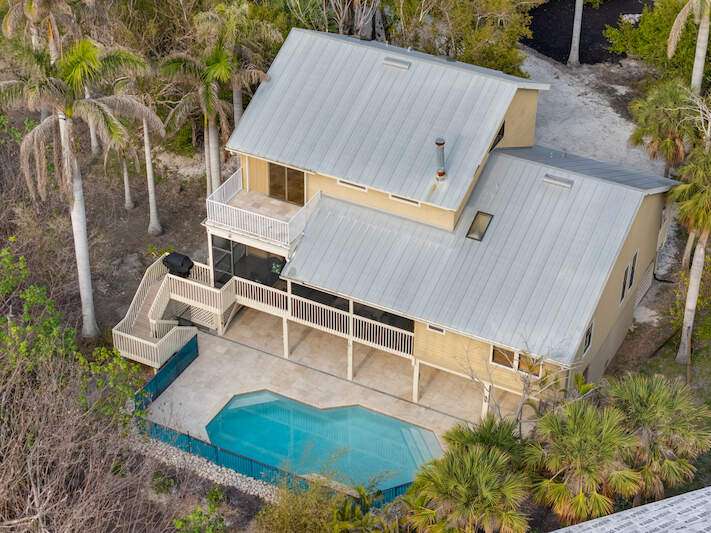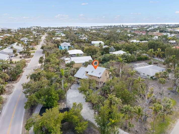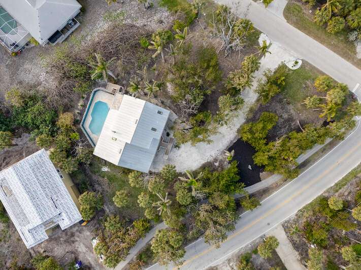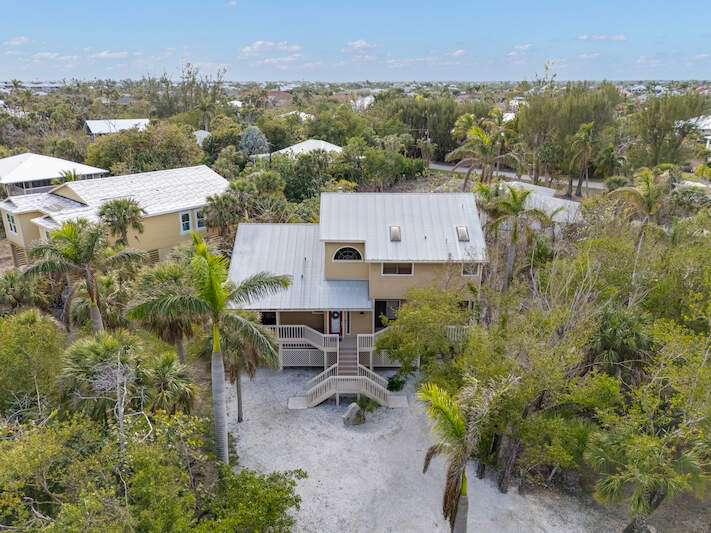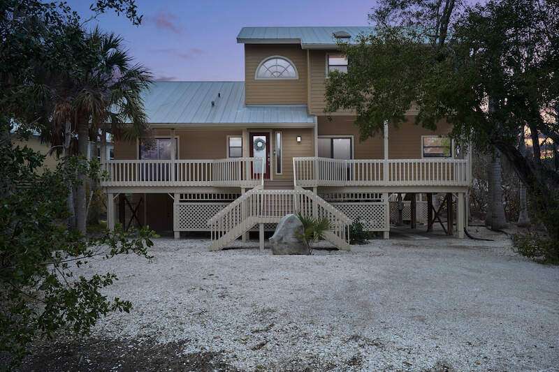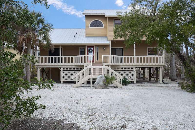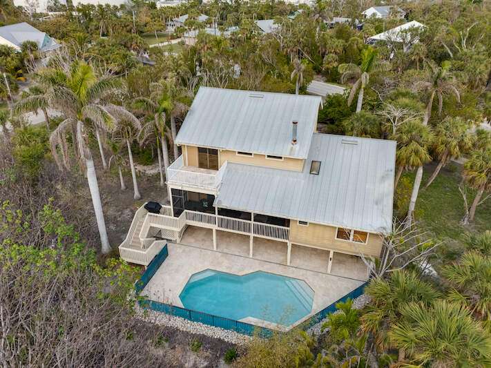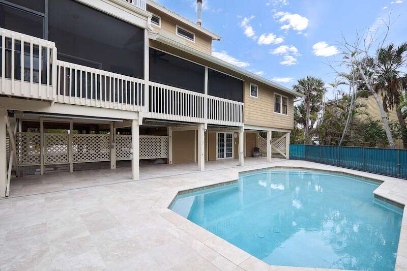 Great property and motivated seller! This home sits on over a one half acre corner lot and is elevated with no known damage from flooding to the living areas! Just TWO BLOCKS from the closest private residence beach and sitting adjacent to the bike path, this property would be a perfect seasonal home or fantastic rental. The home boasts two primary bedrooms with ensuites---one on each floor, an additional two guest bedrooms and a total of three baths on the living levels. The upper level primary bedroom also has a large open observation deck. Additionally, the upper level primary bath is an exceptional design feature of the home with detailed agate design tile on the floor and surrounding the upscale bathtub and shower. This bath also includes modern, streamlined cabinetry, specialty lighting and a walk-in closet. The chef's kitchen on the first floor continues the earthy theme with beautiful, bold stone countertops and custom cabinetry. Entertaining spaces abound from the welcoming living room with cathedral ceilings and clerestory windows to the large screened porch accessed through glass sliders all along the rear of the home. Note that the newly resurfaced concrete inground pool and deck may be seen from many rooms in the home and the entire outdoor area has ample space for entertaining.