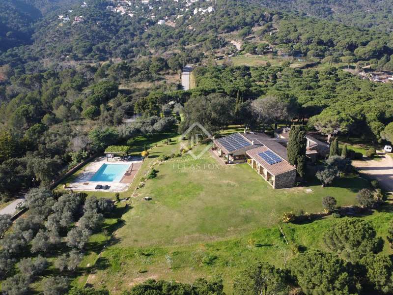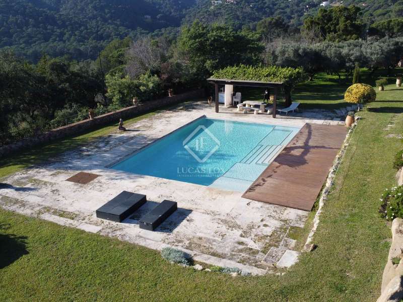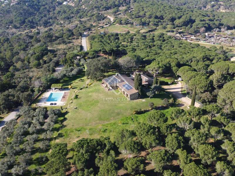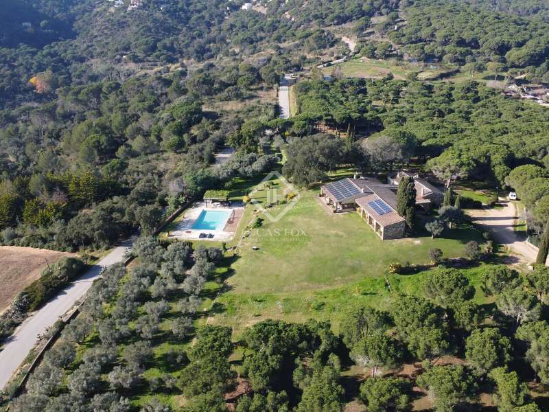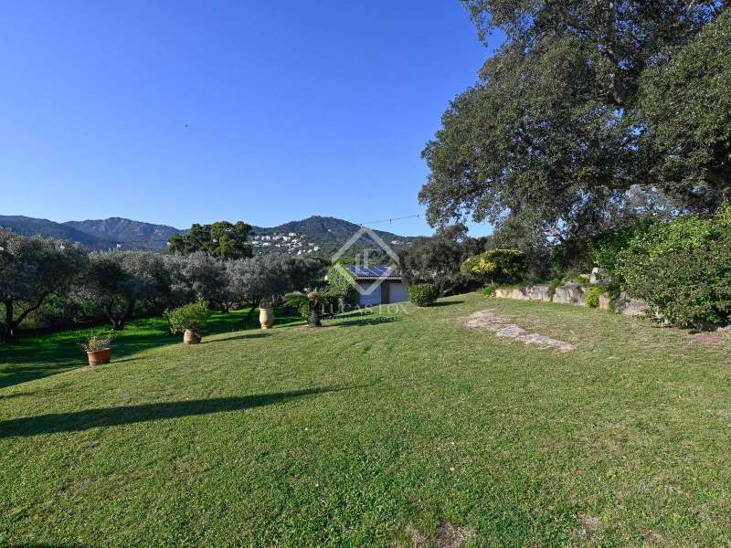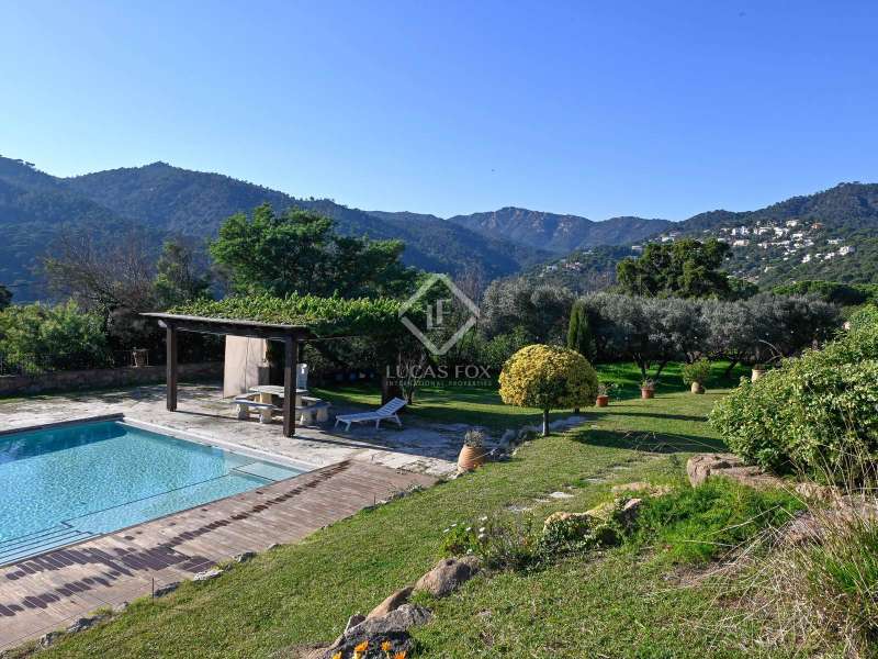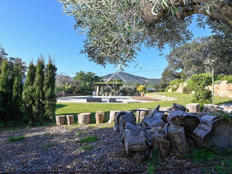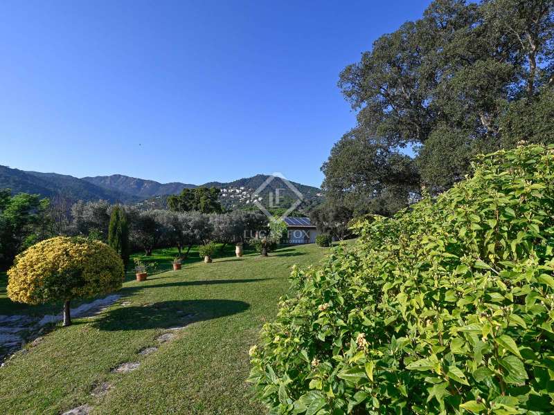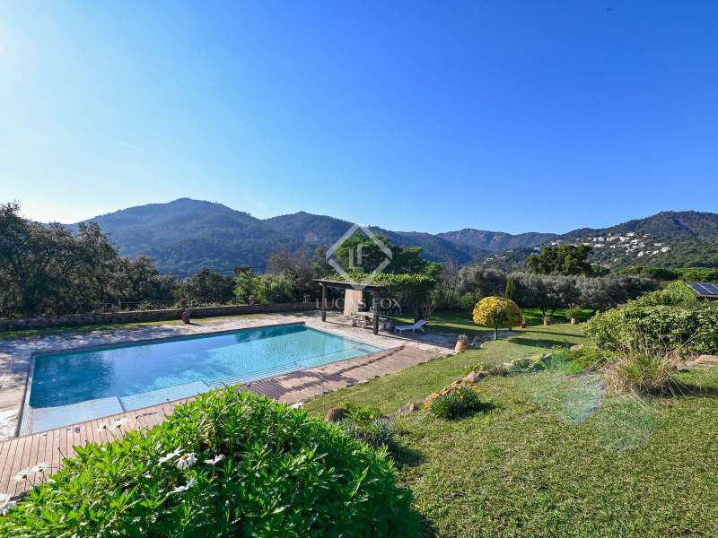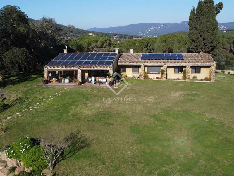 Villa Violeta is a rural house with panoramic mountain views, 5 minutes from the beach of Sant Feliu de Guíxols, an emblematic town on the Costa Brava known for its markets, restaurants, shops and its historic centre . The property has a built area of 850 m² and consists of a main house, a service house, a studio, a garage and a country house. It has a plot of 2.5 hectares. The main house of 272 m² is distributed on one floor and has a spacious and bright living-dining room with a fireplace, a fully equipped independent gas kitchen, two bedrooms with their own private bathrooms, two bedrooms with a bathroom that serves them and another guest guest bathroom . The bedrooms and the living room have air conditioning with a heat and cold pump and heating by hot water radiators. The house is equipped with security cameras, electric shutters, home automation and lighting with motion sensors. The service house has 112 m² and has two bedrooms, a full bathroom , a kitchen and a living room. Further on, we find an open-plan studio of 130 m², with a bathroom, next to a garage for 3 cars and a workshop. We continue walking through the property and find a 155 m² country house built in 1994, which is distributed over three floors. On the main floor , we find a large entrance hall, a living-dining room with a fireplace and an open kitchen, and a complete bathroom with a shower, a bathtub and a sauna. We also find a large double bedroom with beautiful views of the garden. We go up to the upper floor , where we have two double bedrooms and a storage room. On the lower floor , there is a very spacious stone wine wine cellar . The country house is equipped with air conditioning with a heat and cold pump in the bedrooms and the living room and has a tourist license. Exterior, there is a 70 m² swimming pool and a barbecue area with its pergola. The land has three water wells located in different areas and with different depths, one of them with drinking water. The others are used for irrigation. The exterior area has different tanks that can be linked and coordinated to optimize water use. La Finca has 51 solar panels and 8 battery cores that provide about 3,500kWh per month, which provides 85% self-consumption. All houses have high-speed internet connection via fiber optics. The exterior area has a chicken coop, 100 olive trees that produce about 250 liters of oil per year, more than 150 pine trees, fruit trees such as apples, pears, grapes and nuts such as figs, almonds, acorns. Please do not hesitate to contact us to visit this beautiful property or request more information.
