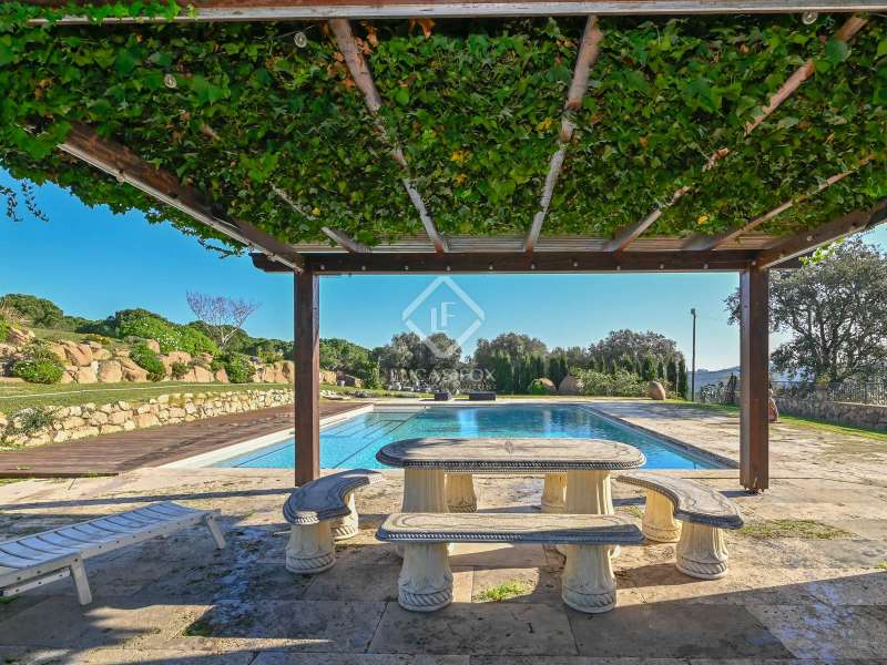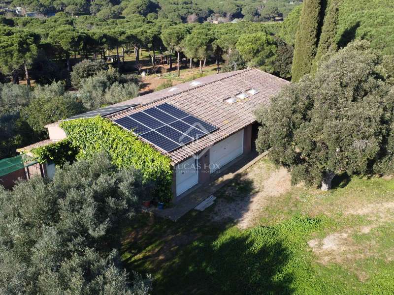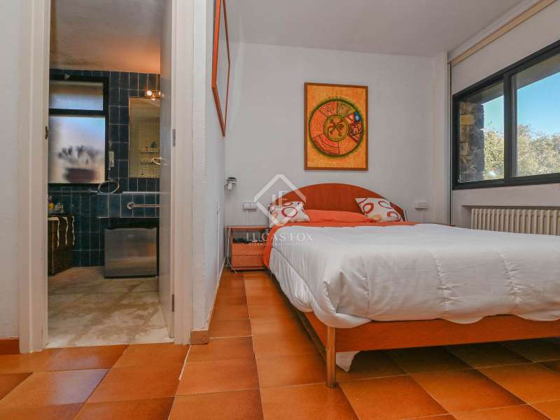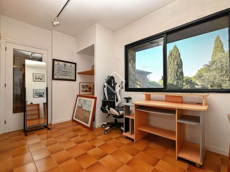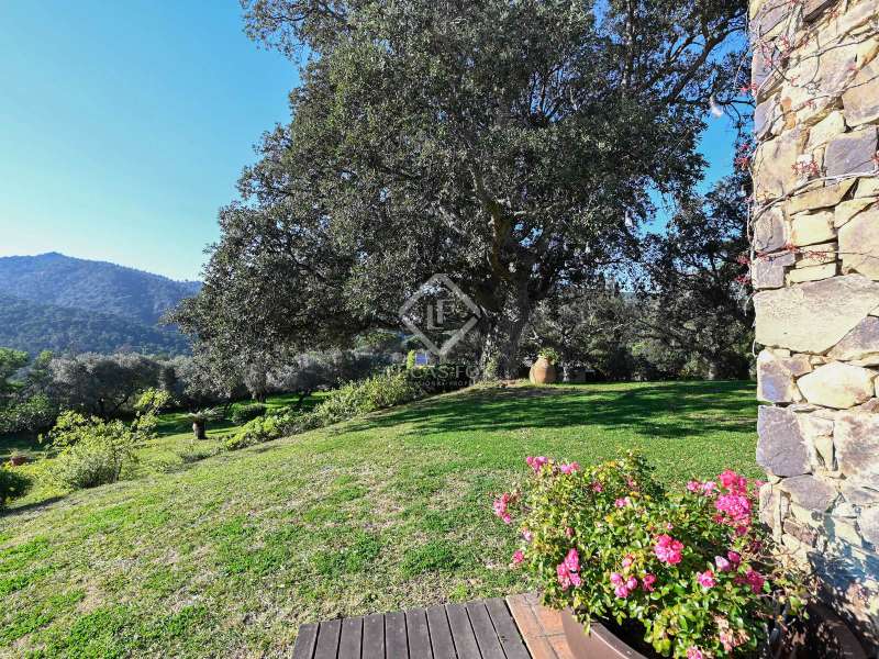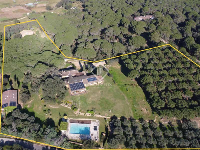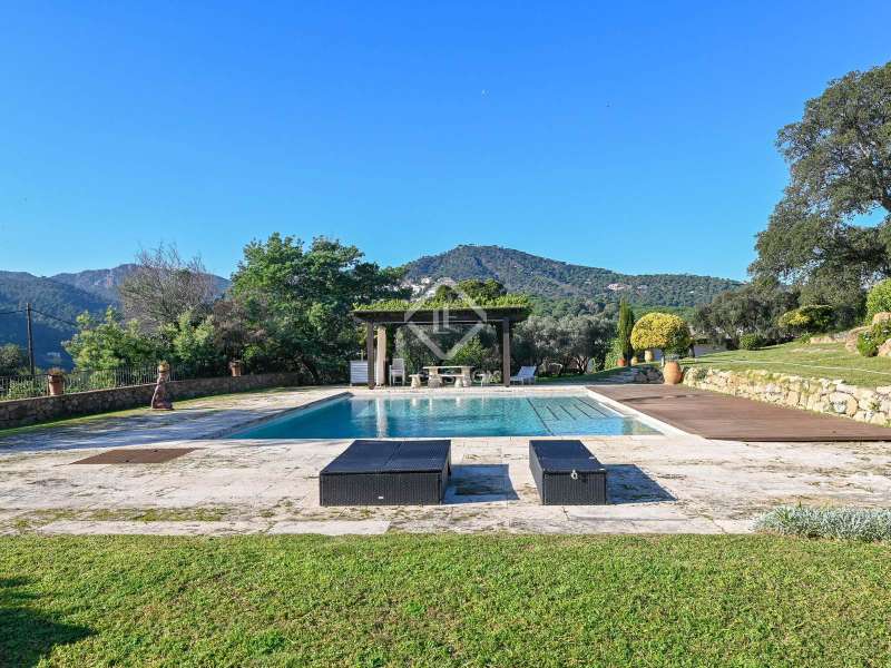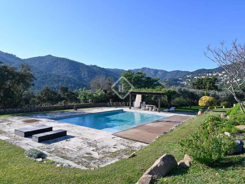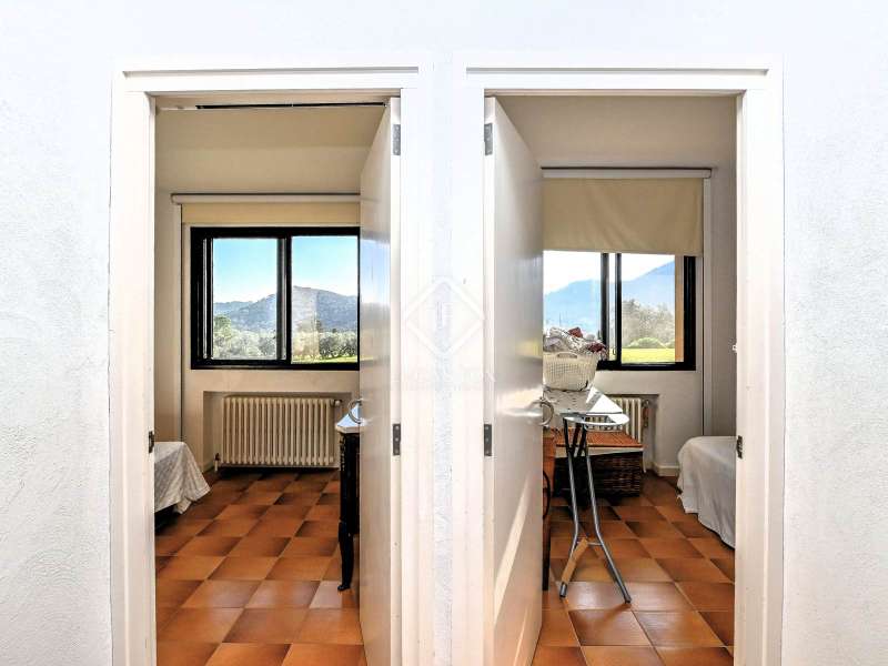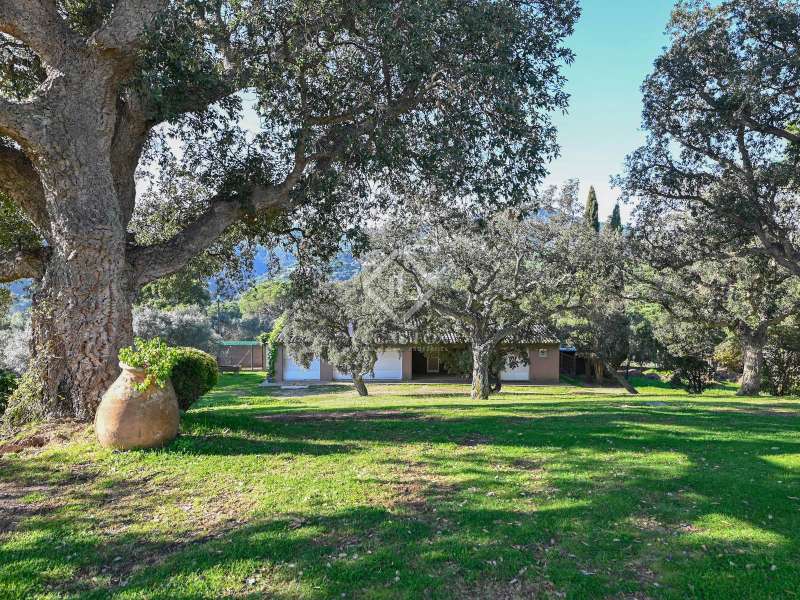 Villa Violeta is a rural house with panoramic mountain views, 5 minutes from the beach of Sant Feliu de Guíxols, an emblematic town on the Costa Brava known for its markets, restaurants, shops and its historic centre . The property has a built area of 850 m² and consists of a main house, a service house, a studio, a garage and a country house. It has a plot of 2.5 hectares. The main house of 272 m² is distributed on one floor and has a spacious and bright living-dining room with a fireplace, a fully equipped independent gas kitchen, two bedrooms with their own private bathrooms, two bedrooms with a bathroom that serves them and another guest guest bathroom . The bedrooms and the living room have air conditioning with a heat and cold pump and heating by hot water radiators. The house is equipped with security cameras, electric shutters, home automation and lighting with motion sensors. The service house has 112 m² and has two bedrooms, a full bathroom , a kitchen and a living room. Further on, we find an open-plan studio of 130 m², with a bathroom, next to a garage for 3 cars and a workshop. We continue walking through the property and find a 155 m² country house built in 1994, which is distributed over three floors. On the main floor , we find a large entrance hall, a living-dining room with a fireplace and an open kitchen, and a complete bathroom with a shower, a bathtub and a sauna. We also find a large double bedroom with beautiful views of the garden. We go up to the upper floor , where we have two double bedrooms and a storage room. On the lower floor , there is a very spacious stone wine wine cellar . The country house is equipped with air conditioning with a heat and cold pump in the bedrooms and the living room and has a tourist license. Exterior, there is a 70 m² swimming pool and a barbecue area with its pergola. The land has three water wells located in different areas and with different depths, one of them with drinking water. The others are used for irrigation. The exterior area has different tanks that can be linked and coordinated to optimize water use. La Finca has 51 solar panels and 8 battery cores that provide about 3,500kWh per month, which provides 85% self-consumption. All houses have high-speed internet connection via fiber optics. The exterior area has a chicken coop, 100 olive trees that produce about 250 liters of oil per year, more than 150 pine trees, fruit trees such as apples, pears, grapes and nuts such as figs, almonds, acorns. Please do not hesitate to contact us to visit this beautiful property or request more information.