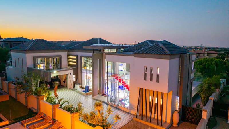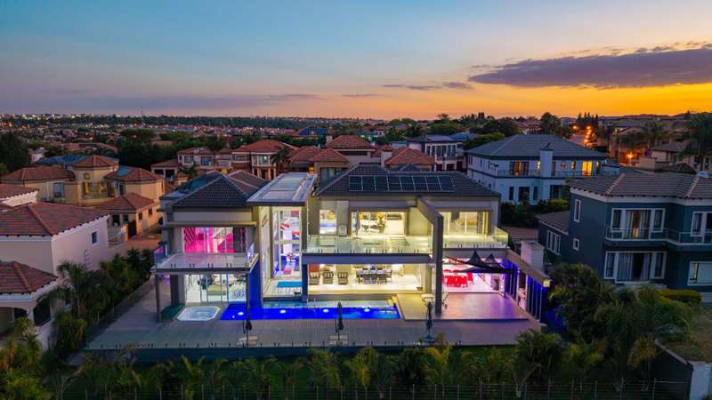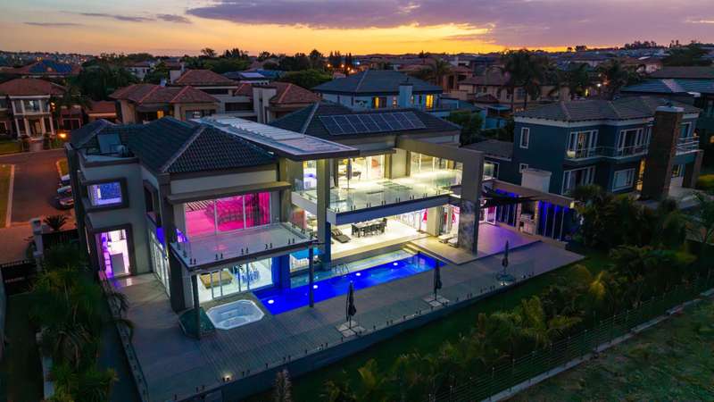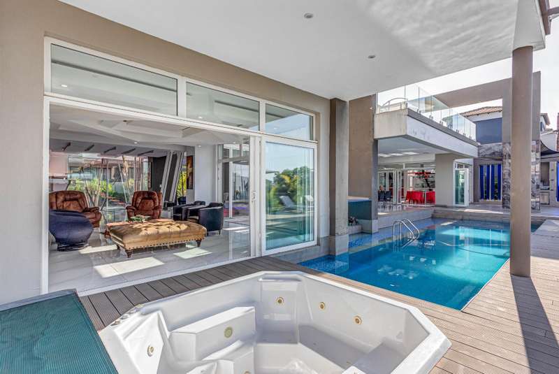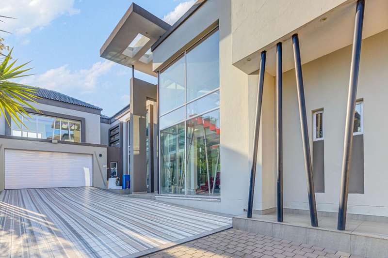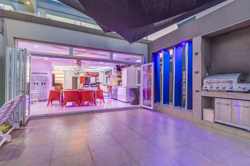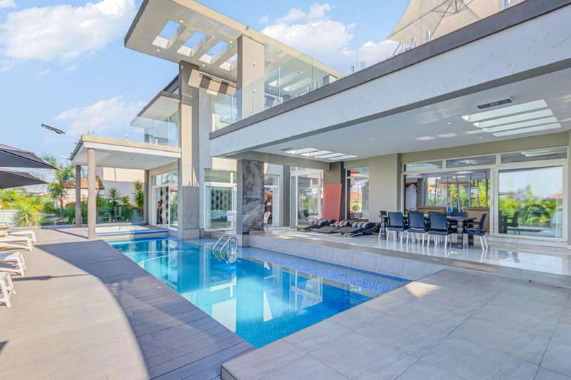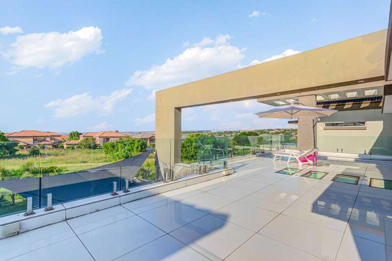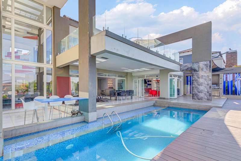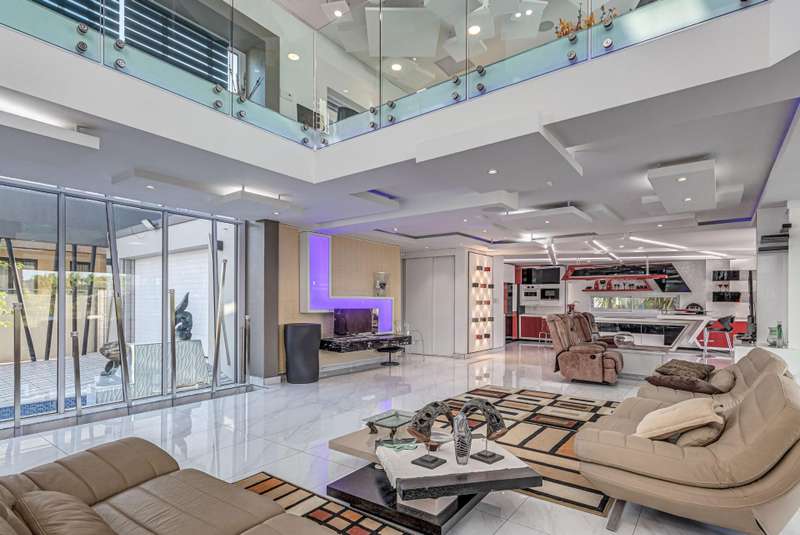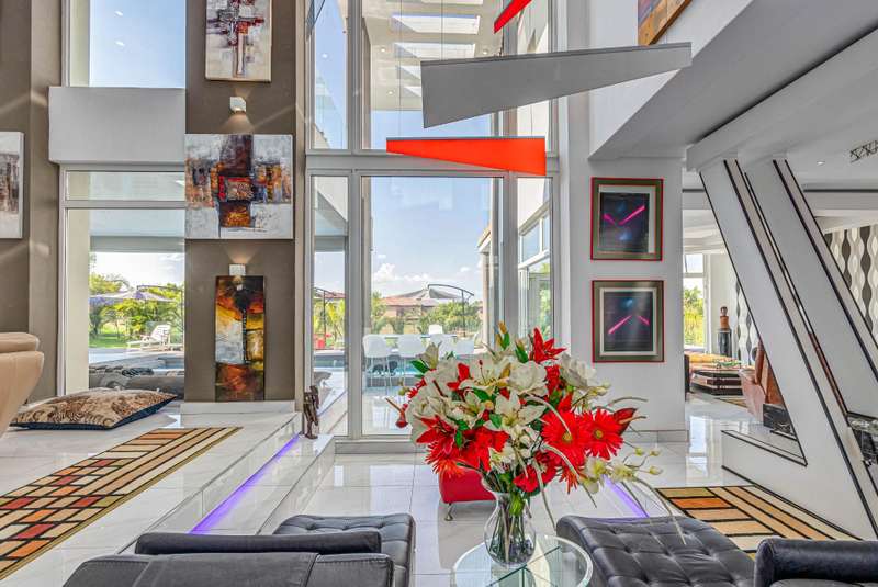 Modern Architectural Masterpiece in Blue Valley Golf & Country Estate Step into a world of contemporary elegance with this one-of-a-kind home, designed to impress with its bold use of colorful LED lighting, striking chandeliers, and seamless open-plan living. A grand double-volume entrance sets the tone, leading you into an expansive layout where natural light pours through glass walls, creating an airy and inviting atmosphere. The state-of-the-art kitchen is a showstopper, featuring a sleek flat electric stove, a pop-up extractor, and a remote-controlled shelf for ultimate convenience. A separate working kitchen with an oven, stove, and extractor ensures effortless meal preparation. Entertain in style with multiple lounges, a bar, and a closed patio equipped with a built-in braai, all flowing effortlessly to the deck, jacuzzi, and sparkling pool?Çöoffering the perfect indoor-outdoor experience against the scenic golf course backdrop. A striking red steel staircase leads to the upper level, where a cozy pajama lounge overlooks the home's dazzling chandeliers. Three luxurious en-suite bedrooms each open to private balconies, while the master suite is a true retreat, boasting a walk-in closet, a lavish double-sided bath, and a spacious balcony with breathtaking views. Many of the home?ÇÖs fixtures and design elements have been imported, adding to its distinctive character and high-end appeal. Completing this extraordinary home are a double garage, staff quarters, and a uniquely tiled driveway that enhances its exclusive charm. Experience unparalleled modern living in this exceptional Blue Valley residence!