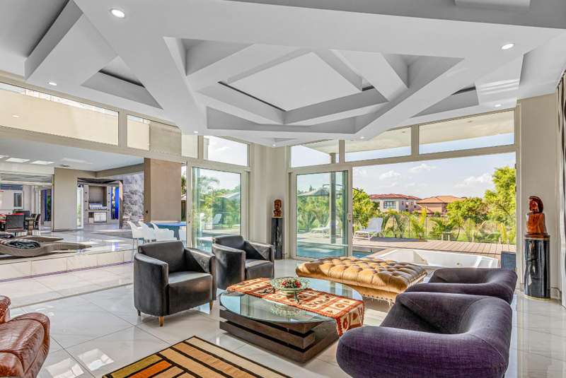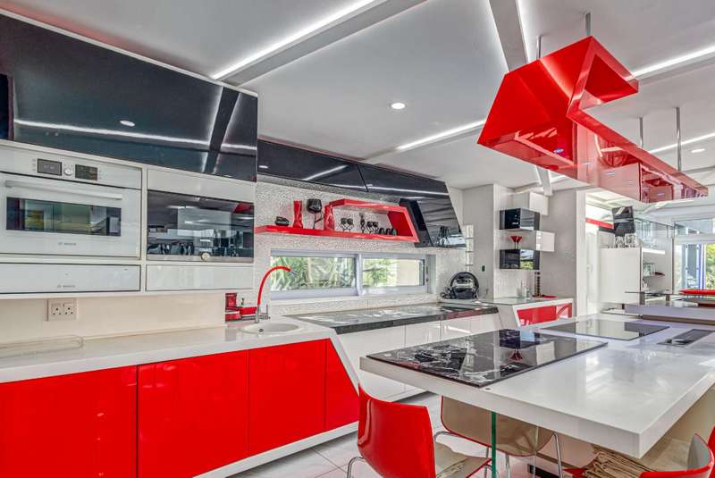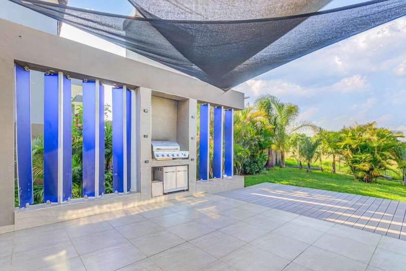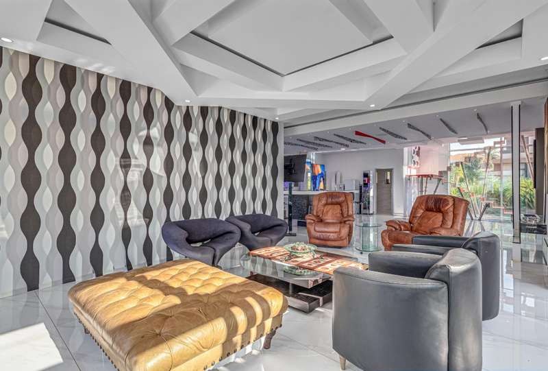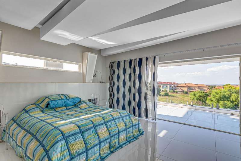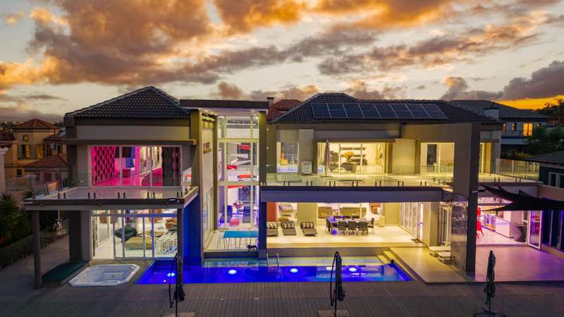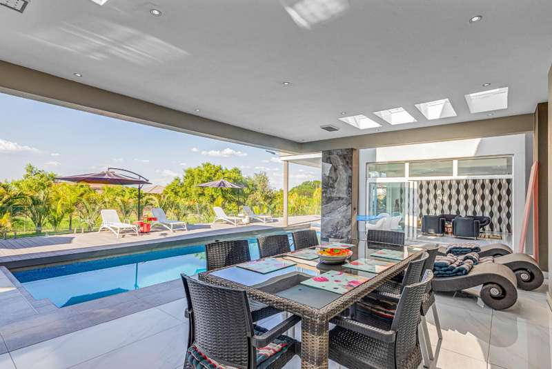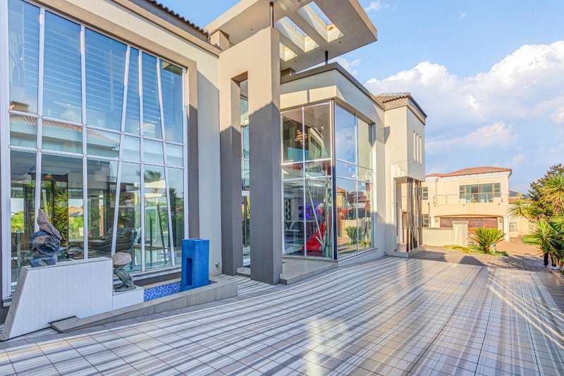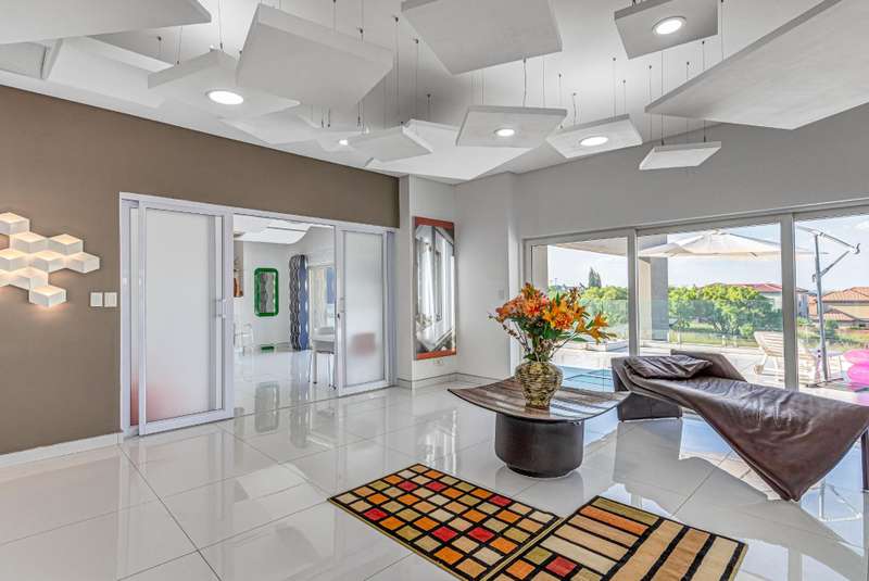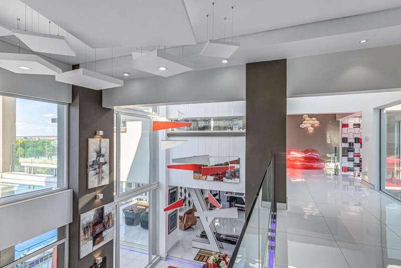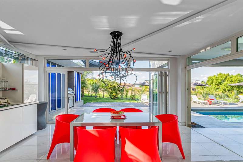 Modern Architectural Masterpiece in Blue Valley Golf & Country Estate Step into a world of contemporary elegance with this one-of-a-kind home, designed to impress with its bold use of colorful LED lighting, striking chandeliers, and seamless open-plan living. A grand double-volume entrance sets the tone, leading you into an expansive layout where natural light pours through glass walls, creating an airy and inviting atmosphere. The state-of-the-art kitchen is a showstopper, featuring a sleek flat electric stove, a pop-up extractor, and a remote-controlled shelf for ultimate convenience. A separate working kitchen with an oven, stove, and extractor ensures effortless meal preparation. Entertain in style with multiple lounges, a bar, and a closed patio equipped with a built-in braai, all flowing effortlessly to the deck, jacuzzi, and sparkling pool?Çöoffering the perfect indoor-outdoor experience against the scenic golf course backdrop. A striking red steel staircase leads to the upper level, where a cozy pajama lounge overlooks the home's dazzling chandeliers. Three luxurious en-suite bedrooms each open to private balconies, while the master suite is a true retreat, boasting a walk-in closet, a lavish double-sided bath, and a spacious balcony with breathtaking views. Many of the home?ÇÖs fixtures and design elements have been imported, adding to its distinctive character and high-end appeal. Completing this extraordinary home are a double garage, staff quarters, and a uniquely tiled driveway that enhances its exclusive charm. Experience unparalleled modern living in this exceptional Blue Valley residence!
