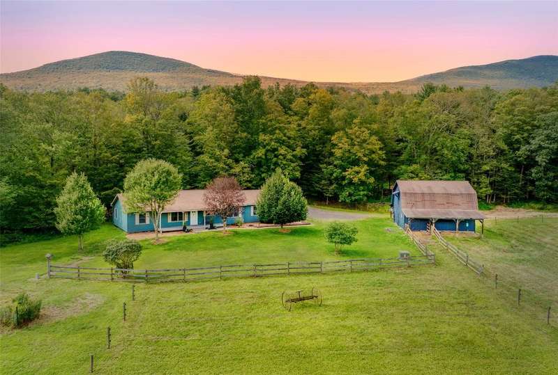 You'll understand just how special this 41 Acre property is once you arrive. Just driving down the country road to get here is already a treat. Situated at the base of the majestic High Point Mountain you'll find a private driveway that takes you through a beautiful forest and then it opens up to acres of your own open farmlands.....the open fields are perfectly suited to horses and with an amazing newly painted Gambrel Roof Horse Barn, you can move them right in and start enjoying every aspect of country life. The peaceful feeling this private property gives is unmatched. The home is nestled perfectly along the woodlands with great views of the open fields. Watch your horses, cows or goats grazing or just relax on the open front porch and breath in all the fresh air! The home has been very well maintained and features a charming stone fireplace, pretty solid wood six panel doors, a kitchen with multiple wood cabinets including an integrated pantry, Corian countertops, a gas stove and peninsula open to a dining area with large windows overlooking those gorgeous views. The split floor plan has two bedrooms on one side of the house while the Primary Bedroom Suite is on the other side which offers some privacy from the kiddos or guests. Just off the living room you'll find a charming enclosed porch with wide board knotty pine floors and large windows overlooking your own pristine forest. The oversized two car garage has ample space for a workbench, contains a storage closet and the entrance to the poured concrete crawl space which houses the utilities. Once you step foot in the barn, your imagination will light up.... what a great space on the ground level for horses or other livestock with a center isle and several stalls that can be used in a variety of ways, high ceilings with exposed beams and four entrance/exit doors for ease in cleaning or moving animals. The Second floor of the barn contains an exterior hay door PLUS there is a full interior staircase to a HUGE open space with lots of headroom for hay storage, tack, etc. This barn offers so many possibilities.... it is such a great building for other dreams as well.... Possibly convert it to your own personal artist studio or workshop....it contains its own electric service. Take your time to walk around this lovely property, you will find there are two small streams, beautiful old growth trees along the perimeter and tons of space to enjoy. This large lot contains such a diversity of land types including heavily and lightly forested areas, open meadows, wetlands, rock outcroppings, charming natural streams and pretty landscaping around the house. There is a protected archeological site of early Native American historical significance within the forested area. This beautiful property is in close proximity to the picturesque Ashokan Reservoir that features a pedestrian only paved walking/biking promenade showcasing vast views of the surrounding Catskill Mountains and breathtaking Ashokan Reservoir and also the Ashokan Rail Trail which meanders through miles of beautiful forest alongside the shoreline of the reservoir and Esopus Creek. In addition, the Mohonk Preserve with its amazing trails and swimming lake are a short drive away. The Catskills offer so much to enjoy between all the hiking trails and high peak vistas, but also all the charming small villages with quaint shops and restaurants. You'll never feel bored and you'll always feel relaxed and at peace in this special area. Come see this exceptional property as soon as possible...it is such a rare find.... once you see it, you will absolutely love it!!