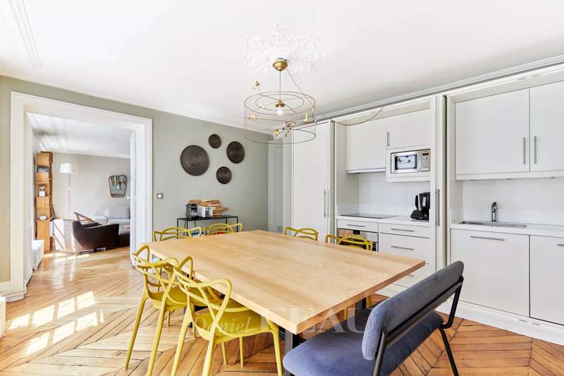 Faubourg Saint Honoré. This 108 sqm apartment on the 3rd floor of a luxurious early 20th century building with a caretaker. In very good condition, it includes a living/reception room, a kitchen/dining room, a bedroom with a bathroom and dressing room, and a second bedroom with a shower room and dressing room.