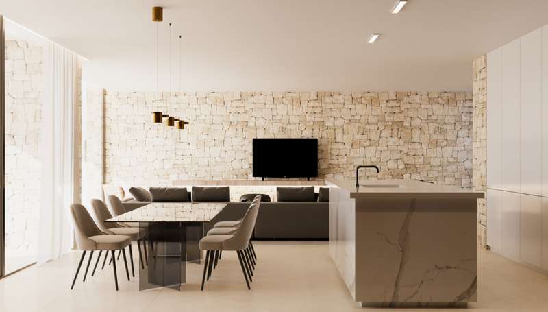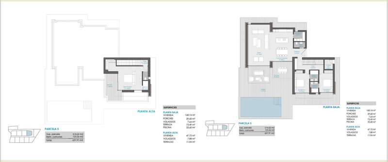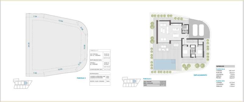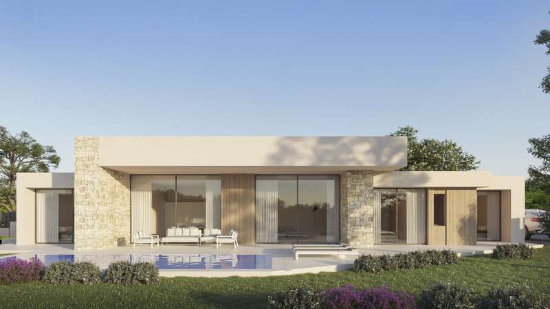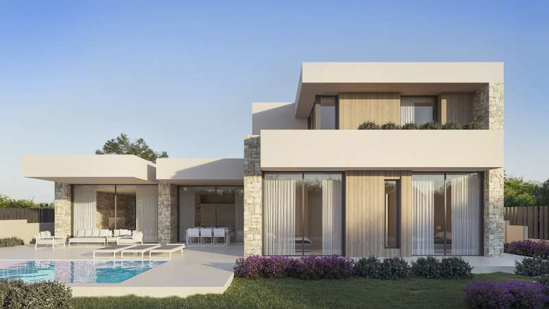 PARCELA 5. Exclusive modern villa project located in a private residential between the beach of Las Rotas and the skirts of the Montgó, in Dénia (Alicante), a few minutes from the marina and all main services. The house will form part of a unique complex consisting of 7 different construction models, all designed under the same architectural concept of avant-garde lines and materials that are naturally integrated into the environment. The property is distributed on two floors: Main floor (walking): large living-dining room with open kitchen, laundry area, two double bedrooms each with their en suite bathroom, courtesy toilet, storage space and covered terrace with direct access to the pool and the garden. High floor: master bedroom with private bathroom and spectacular views of the Montgó. The kitchen, of the Santos brand, is delivered fully equipped with induction plate, integrated extractor hood, osmosis equipment, fridge, freezer, oven and microwave. Outside, the villa will have a saline pool with pre-installation of heating, Mediterranean garden with autochthonous vegetation and automatic irrigation, perimeter seto for greater privacy and pergola with capacity for two vehicles, made in metal structure with covering canvas. The qualities are designed to provide maximum comfort: underfloor heating on both floors, air conditioning through heat pumps, 3kw photovoltaic installation, interior automation with lighting control, air conditioning and motorized curtains (manageable remotely). The exterior carpentry will be minimalist in aluminum with thermal bridge breakage, double security glazing Guardian Sun with air chamber and oscillating opening. The main facade will be completed with reinforced concrete wall, landscaped areas and metal fence, as well as automatic 4-metre door with dual system for pedestrian and vehicle access.