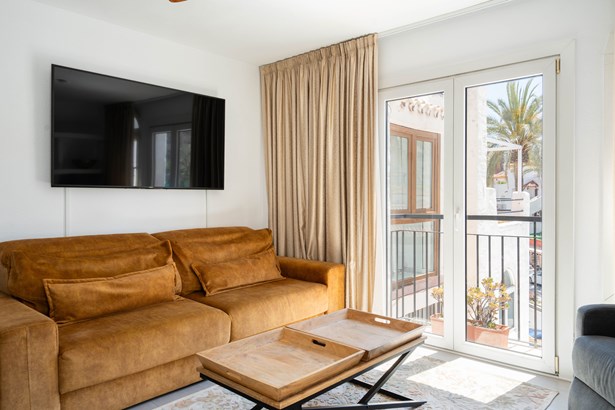 This beautifully renovated two-bedroom corner penthouse apartment offers the perfect blend of top location, high-quality finishes, and exceptional comfort. Situated in the most desirable part of the sought-after Pueblo Evita complex – in a peaceful corner position right on Avenida Las Palmeras – it is just a short stroll from the beach and all amenities.The true centerpiece of this home is the large private terrace, recently upgraded with a state-of-the-art Lumon Panel Sandwich roofing system. It ensures complete protection from rain while still letting in abundant sunlight whenever desired – with the option to slide the panels fully open. The terrace also features its own fireplace, cleverly connected to the cozy indoor fireplace in the living area, creating a seamless indoor-outdoor living experience.The apartment has been tastefully renovated throughout with Nordic-quality craftsmanship, including:Elegant, fully renovated open-plan kitchenBrand new appliancesInviting livin