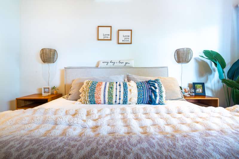 Upstairs, two guest bedrooms open to sweeping views of the surrounding mountains through generous windows that frame the landscape like art. Each room is equipped with its own air conditioning unit, ensuring comfort for family or guests alike.