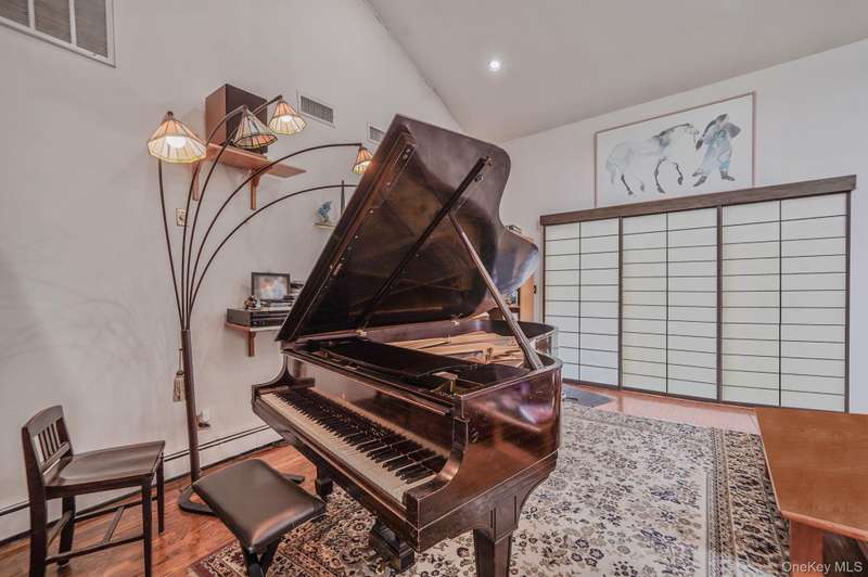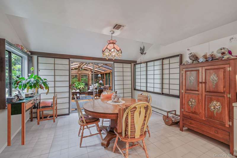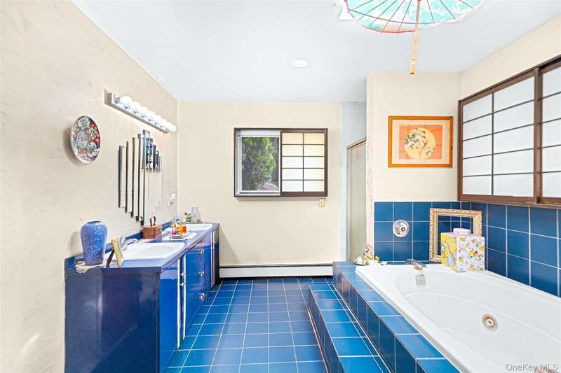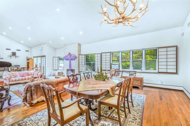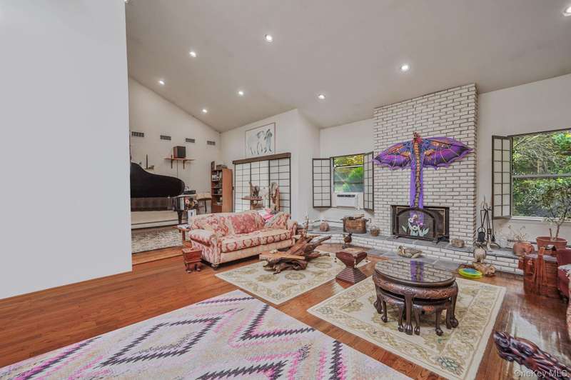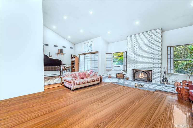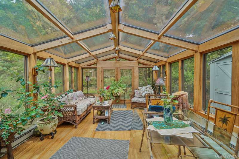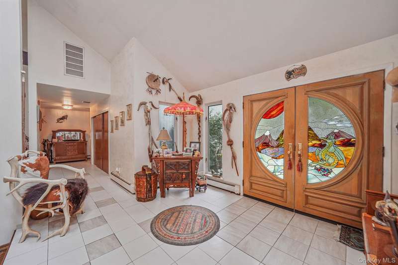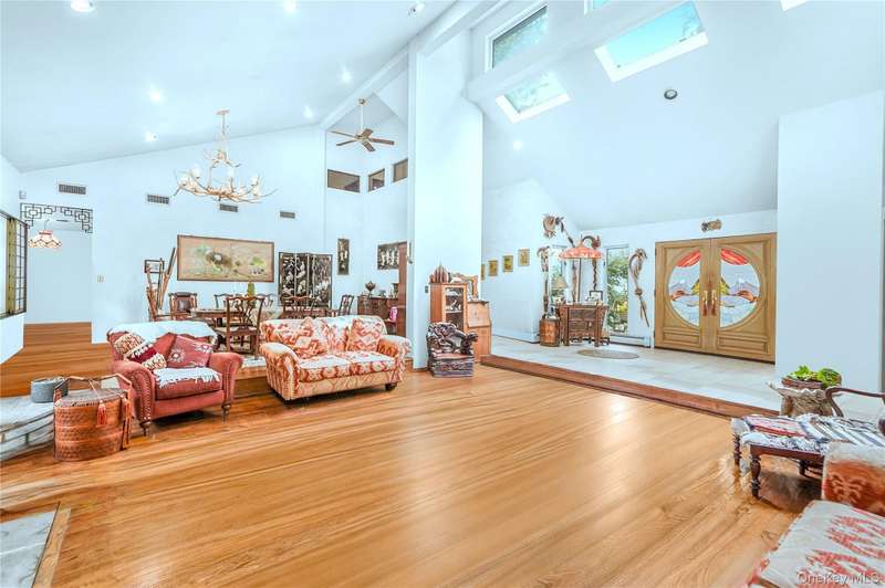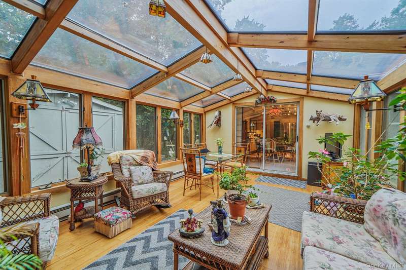 Welcome to this exceptional Fort Salonga residence offering over 4,000 sq ft of living space on a private, wooded acre. This 4-bedroom (with option for a 5th) home showcases an open-concept dining room, living room, and elegant sitting room accented by a piano, all enhanced by soaring ceilings, skylights, and walls of windows that fill the home with natural light. The primary suite boasts a walk-in closet, jacuzzi tub, and glass shower. Enjoy year-round relaxation in the heated conservatory and unwind in the unique two-level sauna. Additional highlights include hardwood and tile floors, stainless steel appliances, custom stained-glass entry doors, a 2-car garage with heated storage, stone terraces, and a basement. Modern comforts include 3 heating zones, dimmable lighting, whole house alarm system, and a whole-house Kohler generator. With over an acre of privacy, handmade stone walls, a dog run with barn, and ample parking, this property is a rare North Shore retreat.