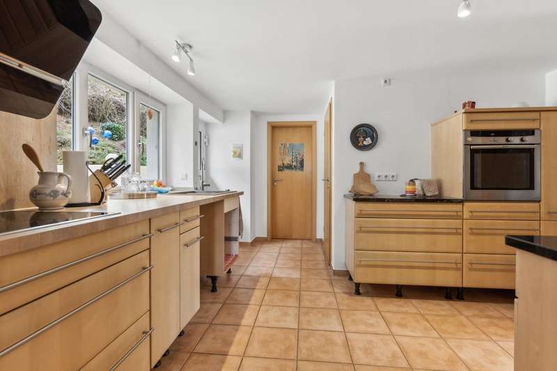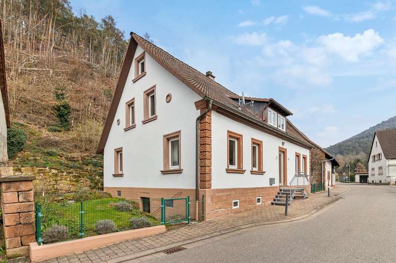 VON POLL IMMOBILIEN presents this charming detached house on the edge of the South West Palatinate. The house is furnished to a high, stylish and high-quality standard. In the last 5 years alone, around EUR 90,000 has been invested in the renovation. Renovation work has been carried out continuously since 2006 in order to increase living comfort. The exact year of construction of the house is not known - research goes back to around 1830. Reconditioned floorboards and parquet flooring, the historic tiled stove with renewed wood insert, the well-equipped kitchen with pantry, several small terrace areas, a versatile outbuilding with parking space, the separate garden and the immediate proximity to the Vorderpfalz are certainly just some of the highlights of this property. Upon entering the house, the beautifully refurbished wooden staircase immediately catches the eye. This gives an idea of how much attention to detail has gone into this property. The entrance area is bright and offers enough space for a checkroom. From here you can access the living room, among other things. Here, the wall to the dining area has been opened up, creating a spacious living/dining room. Numerous windows and the light parquet floor give this room a special charm. The directly adjoining kitchen is equipped to a high standard, has a separate pantry and offers access to the garden. The rooms on the first floor are complemented by a guest room and the utility room with heating and washing machine. In 2013, a walk-in shower, WC and washbasin installation was also added here. There are two spacious bedrooms on the upper floor, one of which has a separate dressing room. The reclaimed floorboards and the tiled stove integrated into the entire house provide a special feel-good factor on this level. Thanks to the dormer windows and the attic rooms, there are no sloping ceilings. The spacious hallway offers additional space for a desk or a cozy reading corner. Between the two bedrooms there is a bathroom in need of renovation which, due to its size, offers a good starting point for creating a bathroom according to your own ideas. A gas central heating system was installed for the first time in 2006/2007. The central tiled stove with its wood-burning insert offers an alternative heating option. This is currently shut down, but can be put back into operation at any time. The windows have been partially replaced and the front door renewed. The electrics underwent a complete e-check in 2019. The premises are complemented by a large cellar room, the attic and a separate outbuilding. This former barn offers parking facilities as well as a large separate room that can be used in a variety of ways. There is also space for numerous garden tools, for example, as in addition to the front and ornamental garden with its terraces directly around the house, there is also a sunny garden plot opposite the property. See for yourself and arrange a personal viewing appointment now. We will be happy to send you further information such as floor plans, additional photos and the exact location by e-mail and answer initial questions by telephone or at a personal appointment in our store.