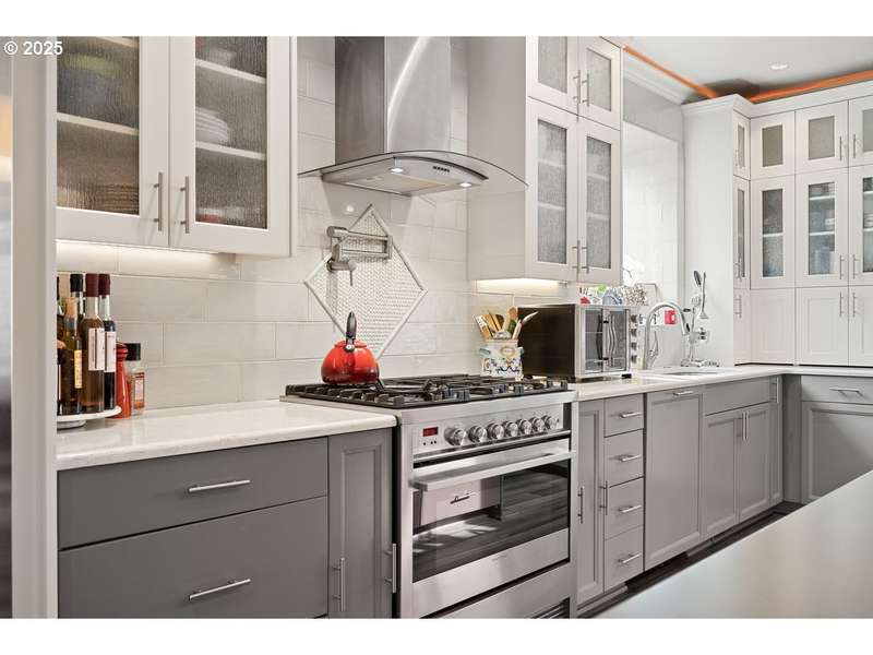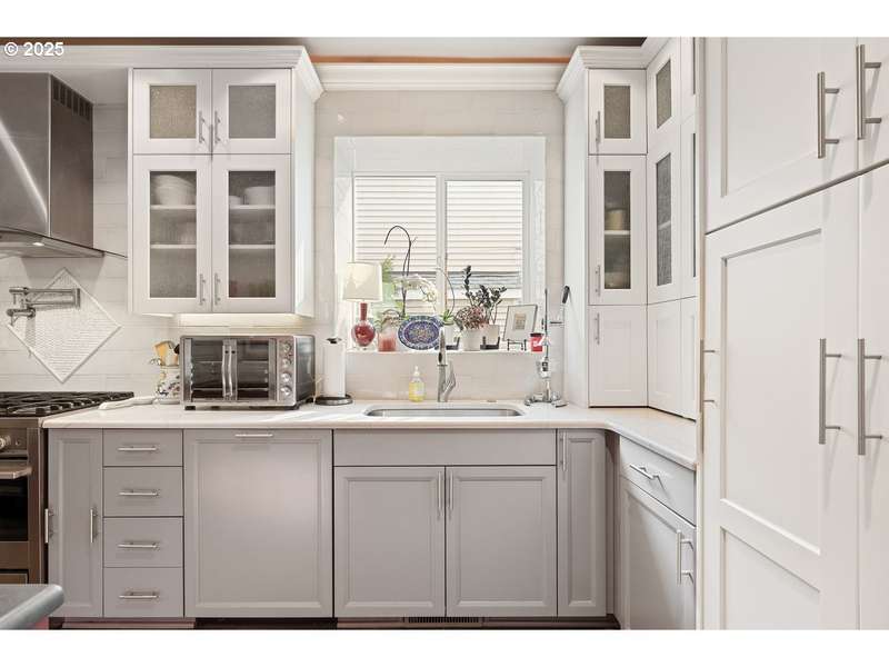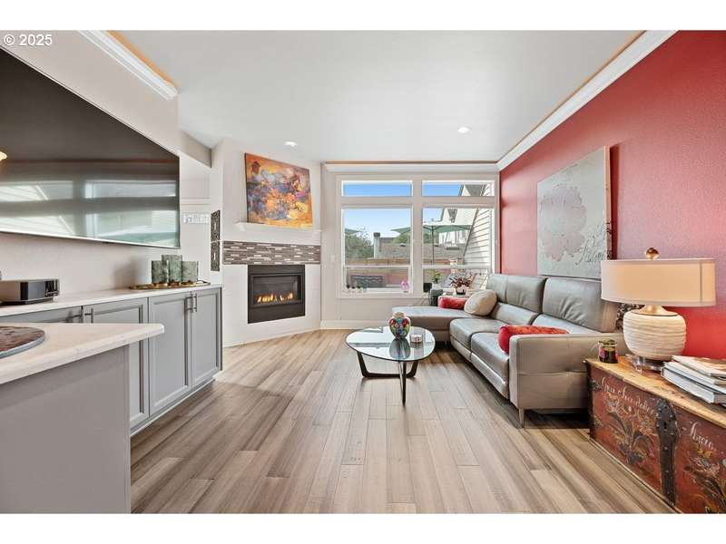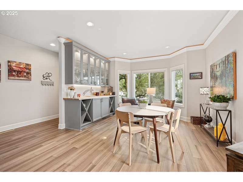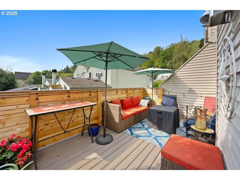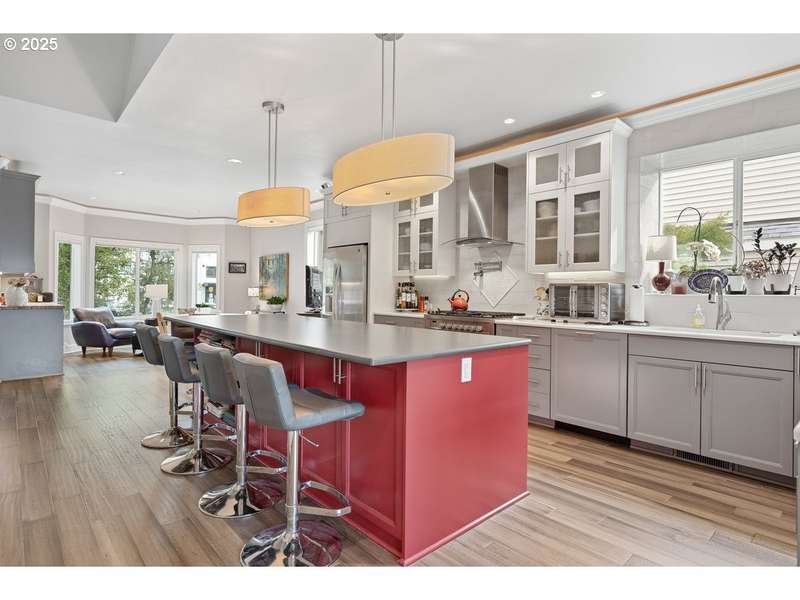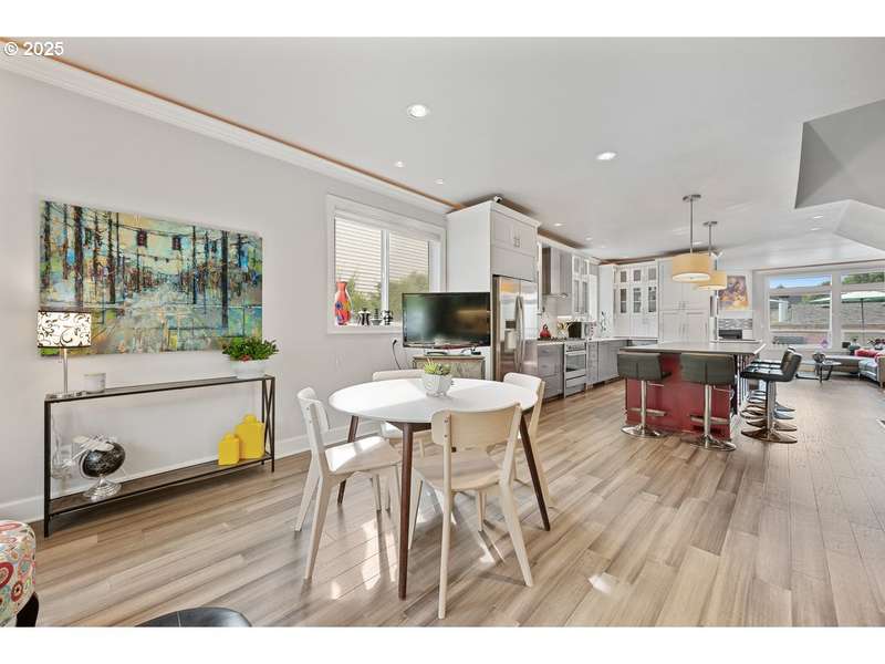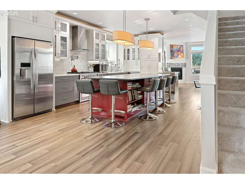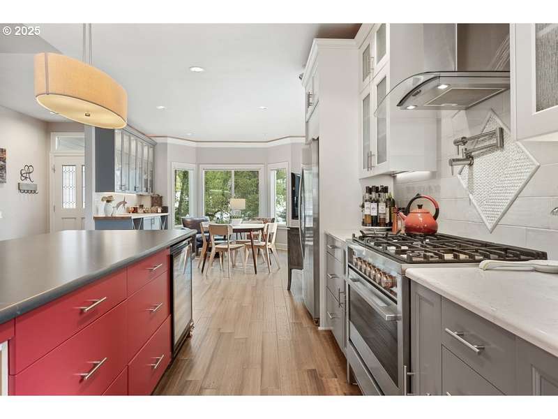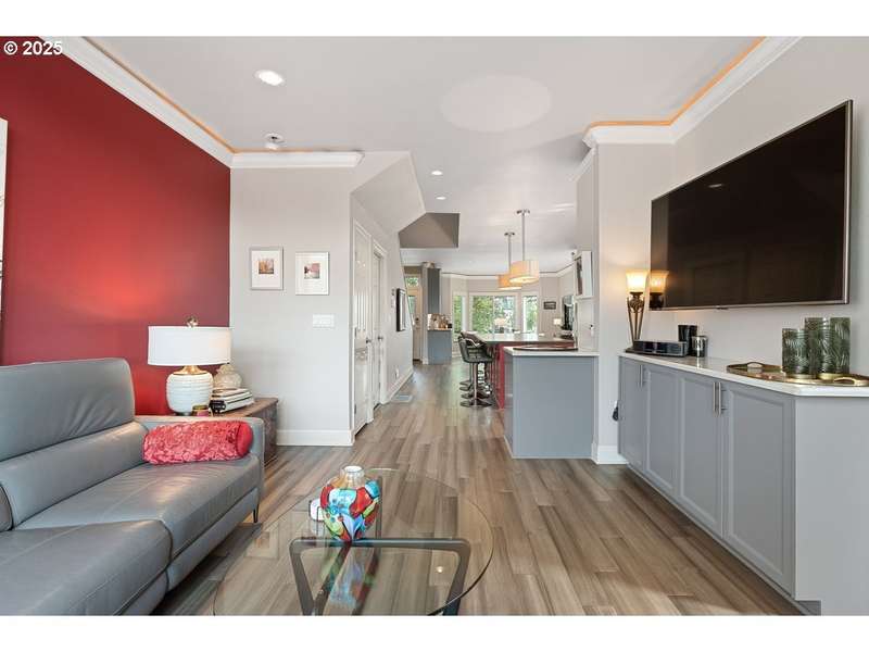 Johns Landing Lovely! This end unit row house will impress with it's beautiful 'street of dreams' remodeled interior. Over $200,000 of improvements & upgrades. You simply must see to appreciate. The main floor living space is now an open concept entertainers dream. Striking wood look LVP flooring throughout, abundant built-ins and storage, recessed and ambient lighting. The custom new kitchen is absolutely stunning and will please any chef. Top quality SS appliances, gas range, pot filler, quartz & soapstone counters, designer tile backsplash, soda/beer fridge, pull out pantries, appliance garage and boasts a kitchen island so incredible it's jaw dropping. The living room is filled with light from the south facing windows. Ignite the cozy gas fireplace when the sun isn't shining. The 2nd floor features freshly installed carpeting, two bedroom suites each with a walk in closet, convenient laundry room on this floor too. The spacious primary bedroom's adjoining bath has double sinks & tile floor. The 2nd bedroom includes custom built-in furniture (wall bed/desk/dresser) for use a guest quarters or flex space. Enjoy outdoor entertaining on the new Trex deck, patio and lovely side yard. Fully fenced. You'll stay comfortable with the newer dual pane windows, gas furnace and central air conditioning. The tuck under garage is EXTRA deep (2 car tandem parking?/workshop/arts&crafts/wine room/pool table?)with plentiful cabinetry for even more storage. The vibrant Johns Landing neighborhood has been one of Portland's most popular areas for many years for good reason. Terrific specialty shops/restaurants/coffee/grocery are convenient. Plus river activities are near by as well. This close-in west side location is a quick commute to all that Portland has to offer for an enriching lifestyle. Easy care maintenance is afforded at Sweeney Rowhouse, a boutique HOA with low quarterly dues. Shown by appointment. Contact your Buyer's Broker today. You'll be glad you did! [Home Energy Score = 8. HES Report at https://rpt.greenbuildingregistry.com/hes/OR10239923]