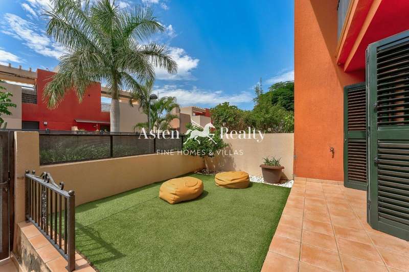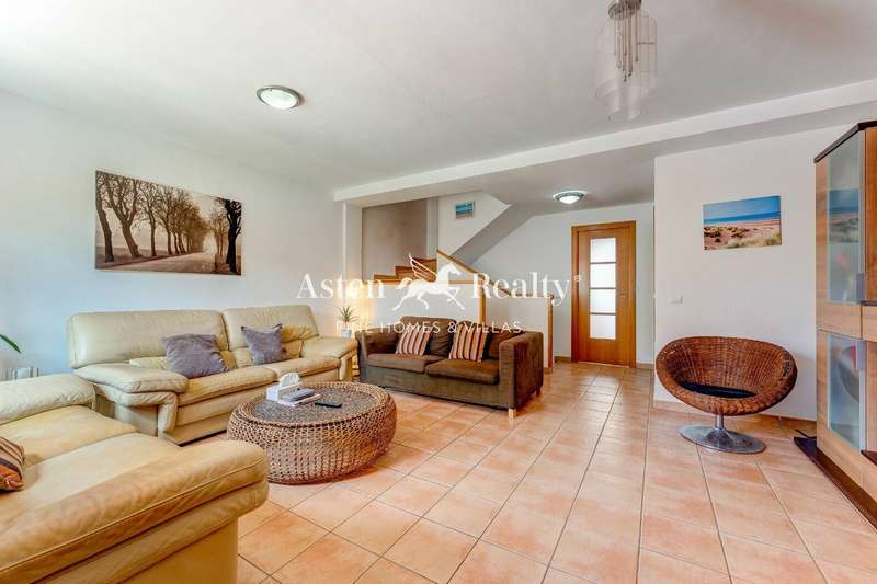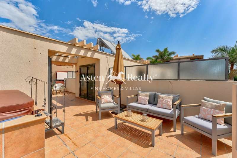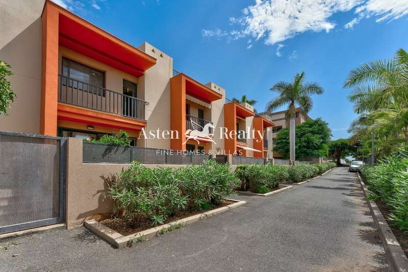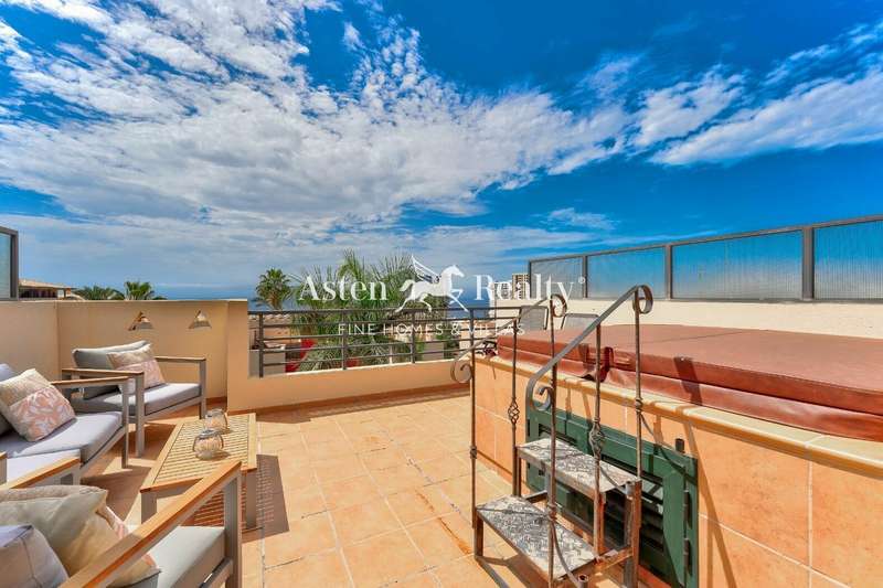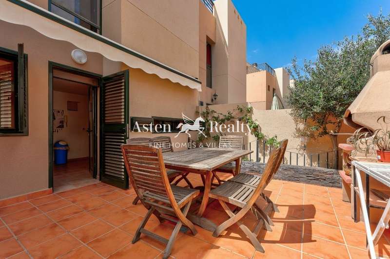 A spacious 175 m2. townhouse in one of the most picturesque residential complexes in Playa Paraíso, Residencial Paraiso I. The townhouse is built on 4 levels. On the lower level, there is a spacious closed garage with a direct access to the living area of the house. The house can also be entered through a gate to a small front courtyard, from where through the front door you find yourself in a large light sitting room on the ground floor. There is also a dining room with an open kitchen and an access to a rear terrace with a barbecue area and a summer dining room on the ground floor, as well as a guest water closet. On the second floor there are 3 bedrooms and 2 bathrooms with a bathtub and a shower. A spacious terrace with a jacuzzi spreads on the entire third floor and has a breathtaking panoramic view of the ocean and the scenery.