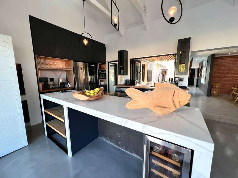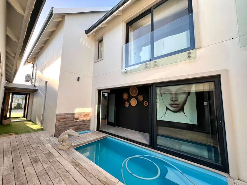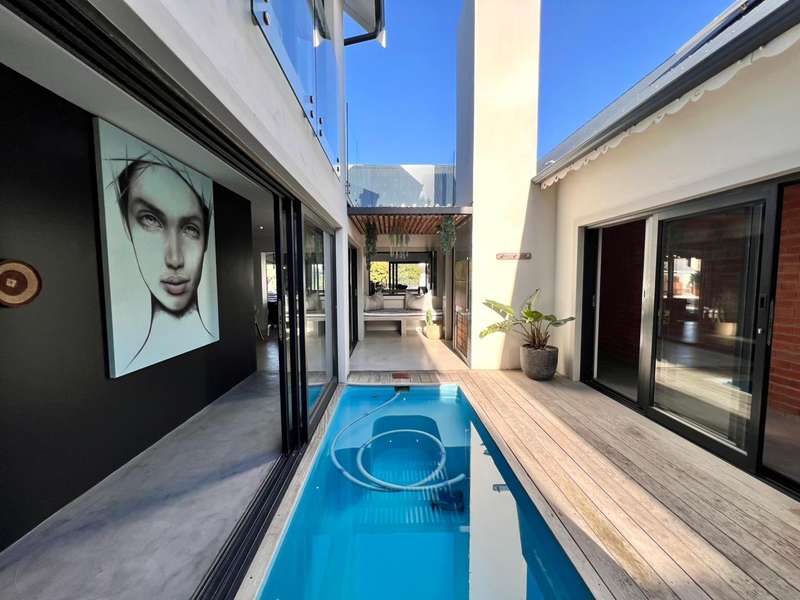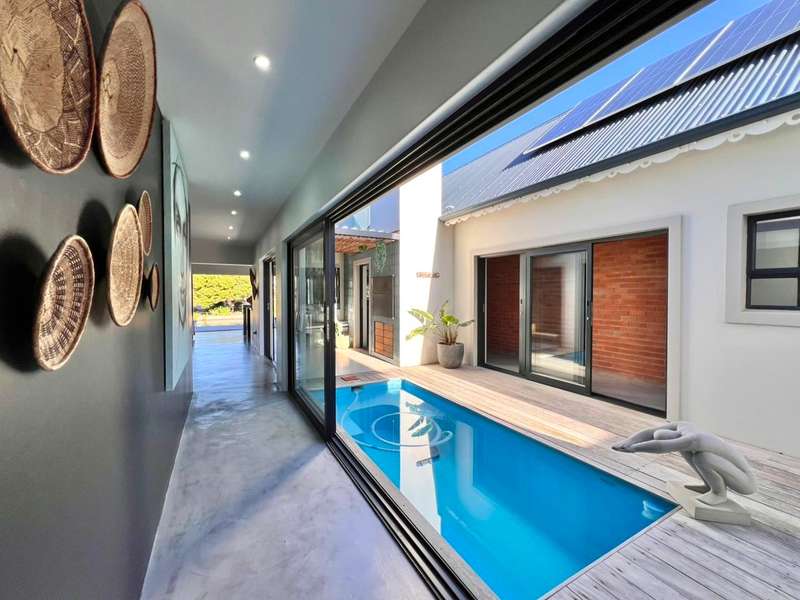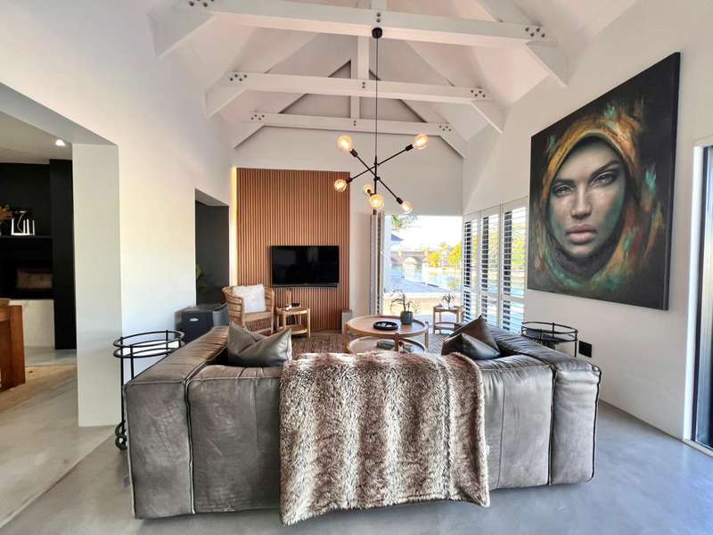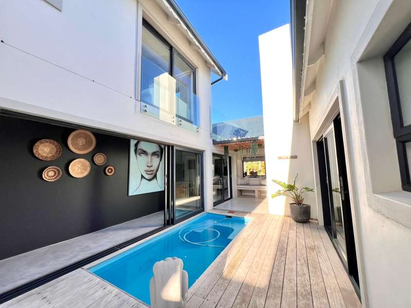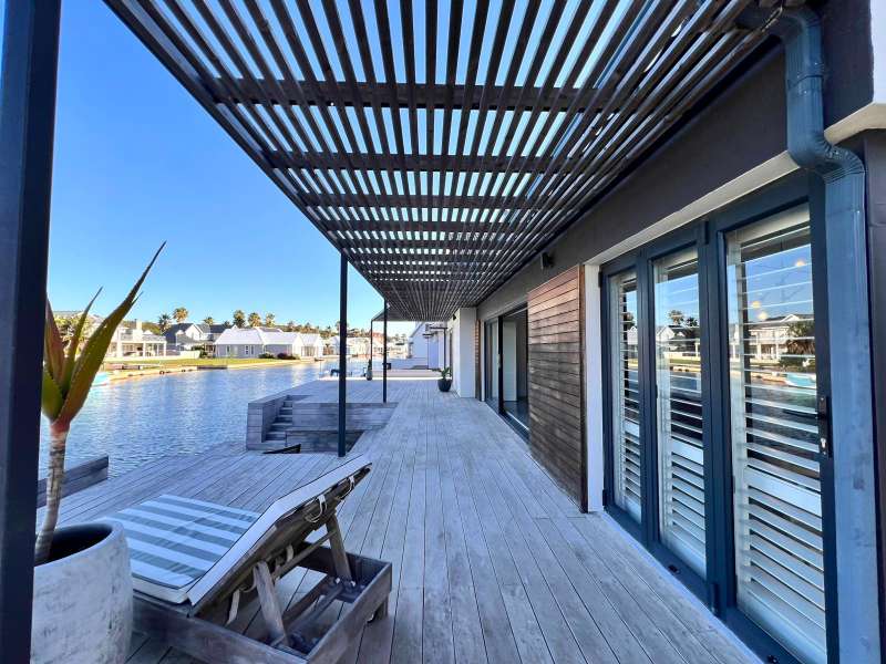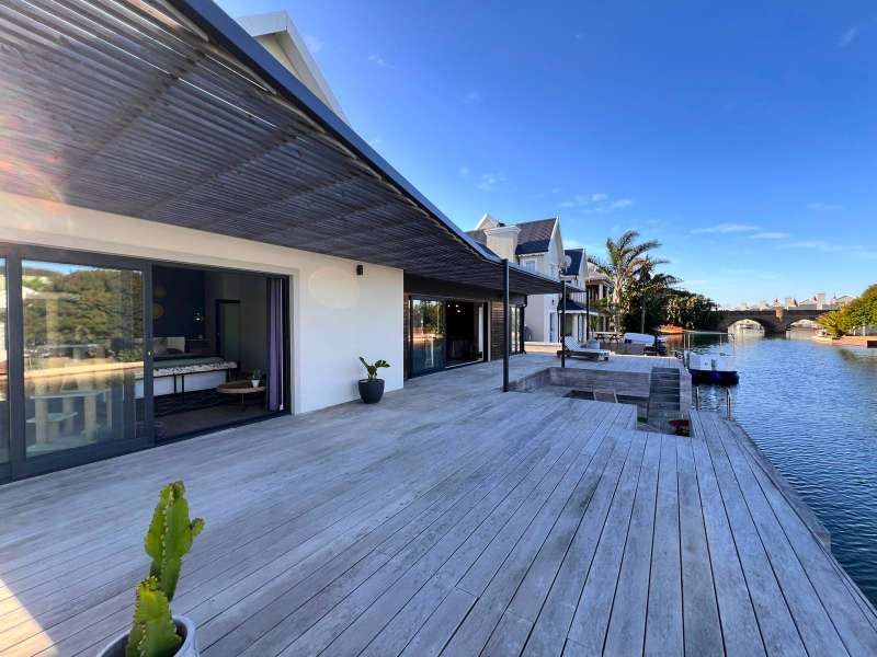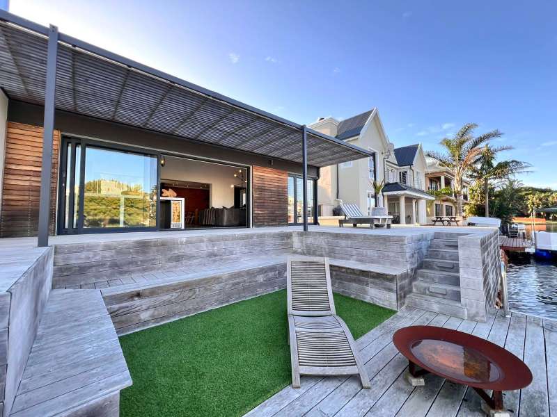 Experience the pinnacle of refined waterfront living in this luxurious residence situated within the prestigious Marina Martinique estate. More than a home, this is a lifestyle- one defined by tranquillity, sophistication, and seamless connection to nature. From the moment you enter the private courtyard, you're greeted by a sense of peace and exclusivity. A heated pool takes centre stage, framed by expansive sliding glass doors that open completely to merge indoor and outdoor spaces. Whether you're hosting guests around the built-in braai or enjoying a quiet moment by the water, this home is designed for both intimate relaxation and unforgettable entertaining. Inside, clean architectural lines and premium craftsmanship define the open-plan living spaces. Warm, natural textures- including exposed timber rafters- complement bespoke finishes and designer touches throughout. A combustion wood fireplace adds ambiance to the dining and lounge areas, while the custom kitchen is fitted with high-end appliances from Smeg, Bosch, LG, and Midea. Step out onto the 100m² Garapa deck, where canal views stretch before you- ideal for a sunrise coffee or an evening sundowner. The main suite is a private sanctuary with direct deck access, a luxurious en-suite bathroom, and both indoor and outdoor showers for a spa-like experience. This home offers flexible accommodation with a second guest bedroom, which doubles as a study with a stylish guest toilet. Moving upstairs, there is a third bedroom & en-suite bathroom, alongside a huge versatile bonus room currently used as a dance studio- which can be easily convertible into a fourth bedroom or family space. High-spec features include: • Solar-powered energy system with 8kVA inverter, 10kVA lithium batteries, and 12 solar panels • Triple garage with built-in cabinetry • Underfloor heating and air conditioning for year-round comfort • Designer details such as American shutters, Weylandts lighting, and a built-in pizza oven. Tucked within a secure, lifestyle-focused estate, with access to canals perfect for paddling, swimming, or boating, this residence offers more than just luxury- it offers a life of balance and beauty. This is modern waterfront living, reimagined! Contact me today to arrange your private viewing.